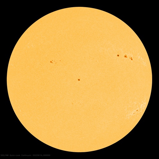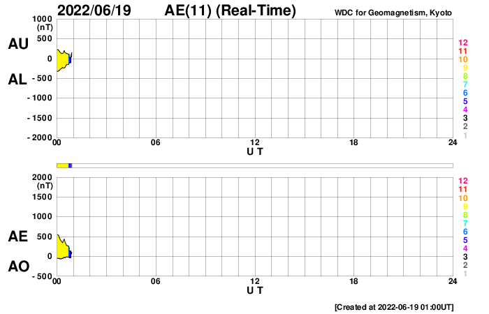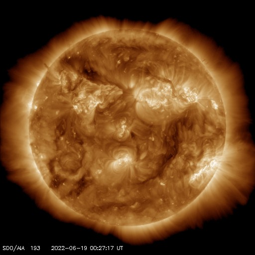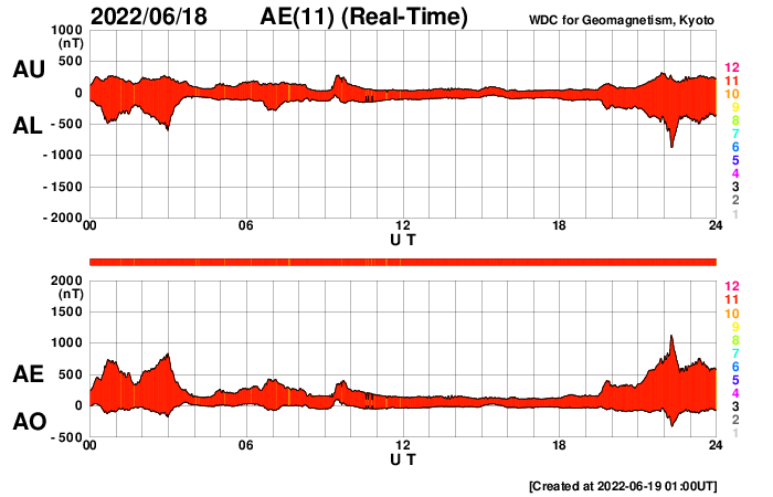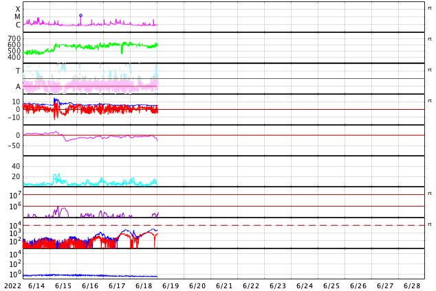 2022/ 6/19 10:05 更新 600km/秒の高速太陽風が続いています。太陽は比較的穏やかです。 担当 篠原 太陽風速度の高まりが続いています。 昨日600km/秒だった太陽風の速度は、 夜に入ると580km/秒へ少し下がったのですが、 今朝早くから再び高まって、 データが乱れてやや見にくいですが、 現在は600km/秒へ戻っている様です。 12日に始まった速度の高まりは、およそ7日にわたっています。 27日周期の図を見ると、 前周期の太陽風も、高速の状態が5月15日から9日間続いています。 この変化が同じように回帰しているということかもしれません。 前周期の速度の高まりは、5月23日までだったので、 図で対応させるともう1日程度となりますが、 現在の600km/秒という速度の高まりを考えると、 今回はこれよりも長く続きそうです。 どこまで高速風が続くか注目してください。 太陽風の磁場強度は、5nTと平均的な状態です。 南北成分は、グラフの途中までは北寄り、 後半で南寄りになっています。 AE指数もこれに添うように途中までは変化が少なく、 終わり頃に500〜1000nTの中規模の変化が発生しています。 速度の高まりが続いているので、 磁場の振れ方によってこの後も磁気圏の活動は続くでしょう。 太陽は、南西の端近く(右下)の3031黒点群で C4.8の小規模フレアが発生しています。 その他は、C1の小さいフレアが3回程度です。 全体としては落ち着いている印象です。 ![]() SDO衛星のAIA193カメラによる太陽コロナの様子 (c) SDO (NASA) ![]() SDO衛星による太陽の可視光写真。マウスの矢印を写真に重ねると、黒点番号付きの写真に切り替わります。 (c) SDO (NASA) ![]() DSCOVRが観測した太陽風の磁場(黒線は全体の強度、赤線は南北成分) 磁場の向き、プラズマの密度、速度、温度 (c) データ:NOAA/SWPC、作図:宇宙天気ニュース ![]() AE指数(速報値) 下段のAEグラフの値が高くなると、オーロラ活動が活発化しています。 (c) 京都大学WDC ![]() ![]() 27日の太陽周期に合わせた図 太陽が同じ面を地球に向けていた27日前の変化から、今後を予想することができます。 (c) 作図:宇宙天気ニュース