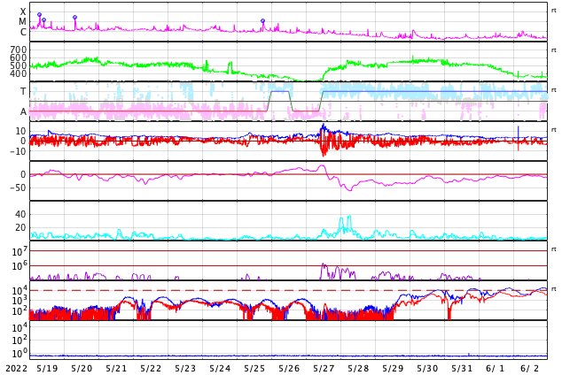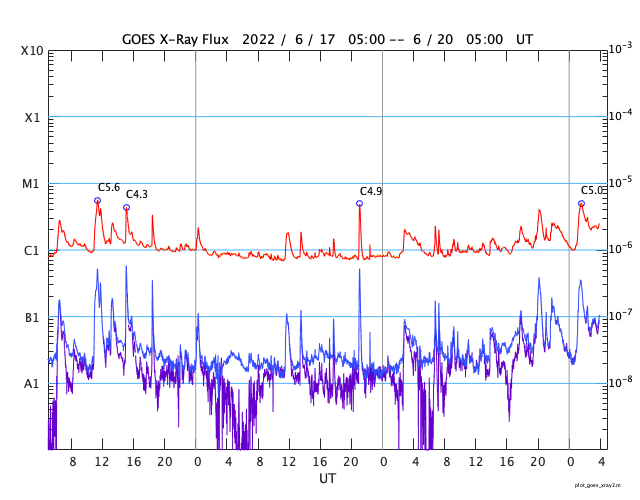 GOES衛星の太陽X線強度。赤・橙 = 0.1〜0.8 nm、青・紫 = 0.05〜0.4 nm (c) データ:NOAA/SWPC、作図:宇宙天気ニュース ![]() | ||||||||||||||||||||||||||||||||||||||||||||||||||||||||||||||||||||||||||||||||||||||||||||||||||||||||||||||||||||||||||||||||||||||||||||||||||||||||||||||||||||||||||||||||||||||||||||||||||||||||||||||||||||||||||||||||||||||||||||||||||||||||||||||||