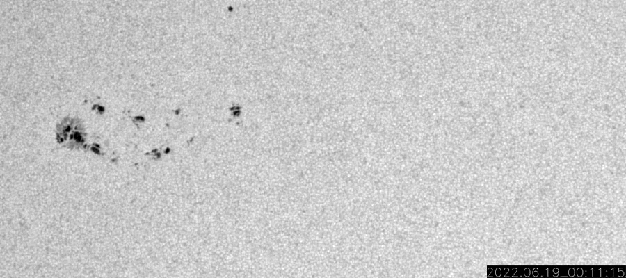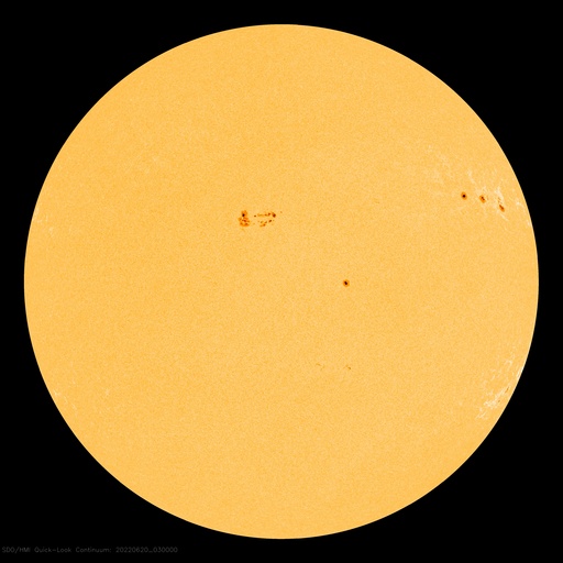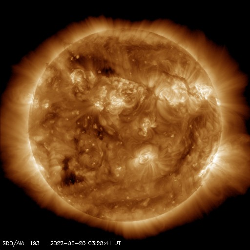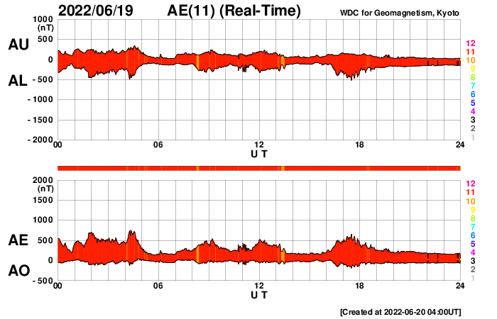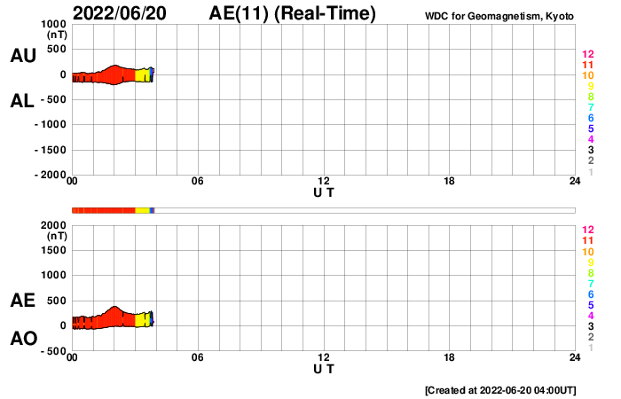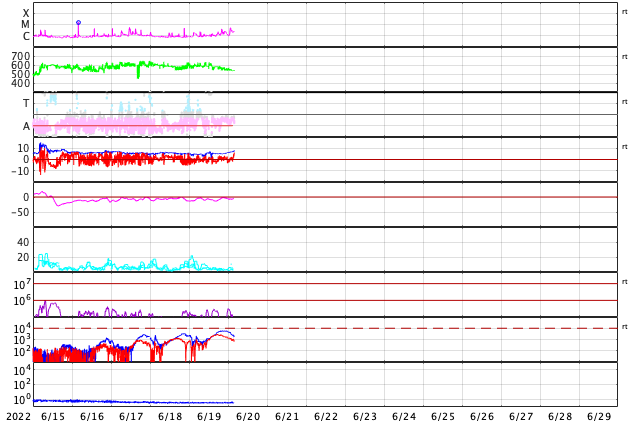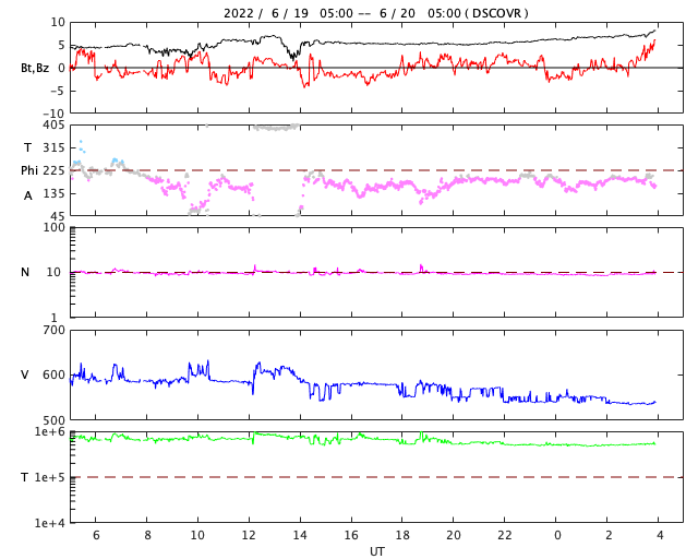 2022/ 6/20 13:02 更新 太陽風は高速ですが、速度は下がり始めています。 担当 篠原 太陽風は、昨夜遅くから速度が下がり始め、 600km/秒だった速度は、現在は540km/秒まで下がっています。 高速の状態は続いていますが、 高速太陽風は終わりに近付いているのかもしれません。 太陽風の磁場強度は、 グラフの後半で5nTから7nTへ少し上がっています。 南北成分は、0nT付近で小さく変化する程度です。 速度が高まっていたので、 AE指数は500nTに達するくらいの小規模の変化が発生しています。 現在は速度が下がってきたので、 磁気圏の変化は次第に小さくなりそうです。 太陽は、中心部北側の3038黒点群が大きくなっています。 昨日からの変化を、SDO衛星の可視光写真の動画で紹介します。 黒点が大きくなるとともに、フレアも発生するようになり、 昨夕から今朝にかけて、 C2.0、C4.0、C2.5の小規模フレアが発生しています。 X線グラフでは、 最後にC5.0の小規模フレアが発生していますが、 これは、太陽の北西(右上)の3030黒点群で発生しています。 この後、3038群はどのような活動を見せるでしょうか。