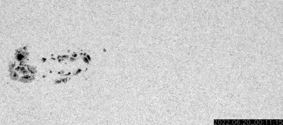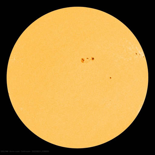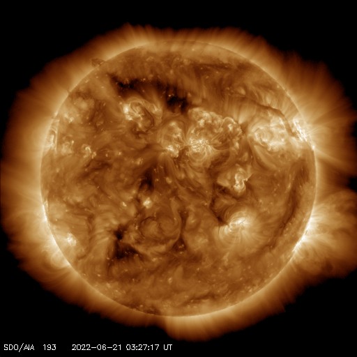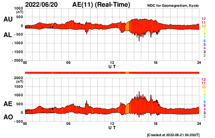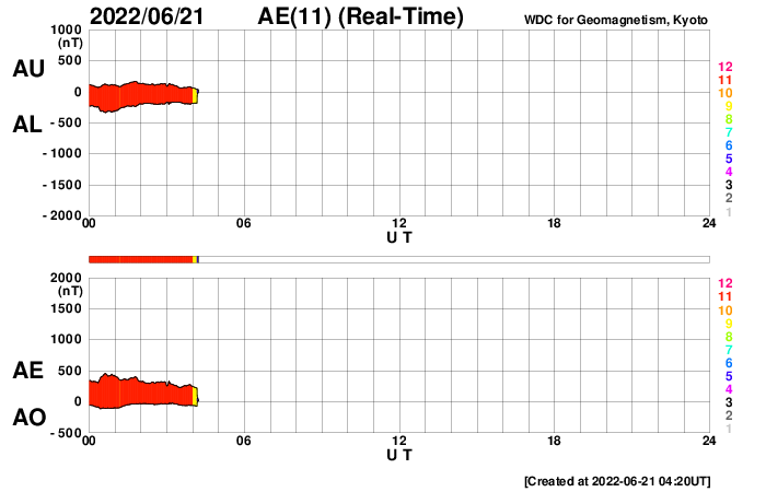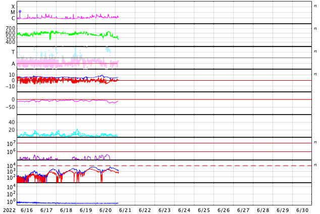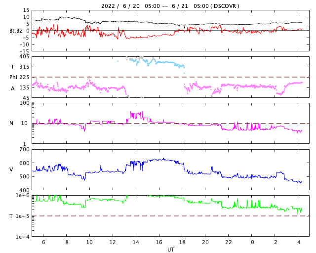 2022/ 6/21 13:39 更新 太陽風の速度はやや高速程度に下がっています。 担当 篠原 太陽風は、昨日のニュースの後も 540km/秒から620km/秒へ再び高まったりしましたが、 今日の昼に500km/秒台を割り、 現在は470km/秒とやや高速になっています。 12日に始まった太陽風速度の高まりは、 およそ9日で終わりを迎えるのでしょうか。 太陽風の磁場強度は、5〜6nTと平均的な状態です。 南北成分は、速度が高まった頃に南向きに強まりましたが、 現在は0nT付近で小さくなっています。 AE指数も、磁場が南を向いた頃に 1000nTに達する大きな変化が発生しましたが、 現在は変化が小さくなっています。 SDO衛星AIA193では、 太陽の北側と南側それぞれにコロナホールが見えています。 3日後くらいから再び速度が高まるかもしれません。 太陽は、3038黒点群が少し大きくなっています。 変化の様子をSDO衛星の可視光写真の動画で紹介します。 昨日の午後にC5.7、夜にC3.3などの 小規模フレアを起こしています。 また、北西の端(右上)の3030群でも、 C4.4、C4.5などの小規模フレアが発生しています。 南東の端(左下)から新しい黒点が現れています。 活動は特に見られませんが、どの様な領域でしょうか。