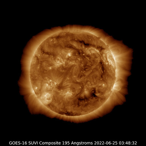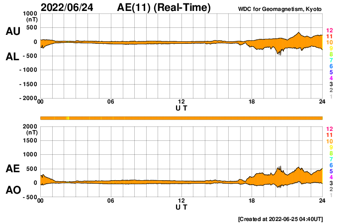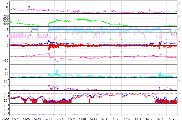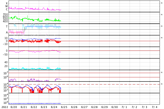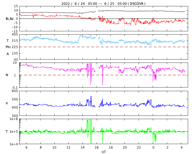 2022/ 6/25 13:48 更新 太陽風磁場が南向きに変化して、磁気圏の活動がやや強まりました。 担当 篠原 太陽風は、420lkm/秒と平均的な速度で安定しています。 磁場強度は、昨日は7nTでしたが、 今日に入る頃に10nTに強まり、 現在も8nTとやや強まった状態です。 弱いCME(コロナ質量放出)が発生して、 磁場の強まりが流れてきたのかもしれません。 磁場の南北成分は、 磁場が強まった頃から 南向きに -5nT程度で変化する様になっています。 磁気圏の活動もやや強まって、 AE指数は500nT程度の小規模の変化が続く様になっています。 太陽風のグラフでは、 磁場の南向きの変化は次第に小さくなっています。 この後は、磁気圏も穏やかになりそうです。 GOES衛星SUVI 195の太陽コロナ写真では、 コロナホールが更に西に進んでいます。 影響はやって来るでしょうか。 (SDO衛星の画像は、今日も更新されていません) 太陽は、C1の小さい小規模フレアが2回発生した程度で、 穏やかになっています。 STEREO Ahead衛星を見ても、 東端の向こう側に目立つ程の領域はない様で、 しばらくこの状態で推移するかもしれません。