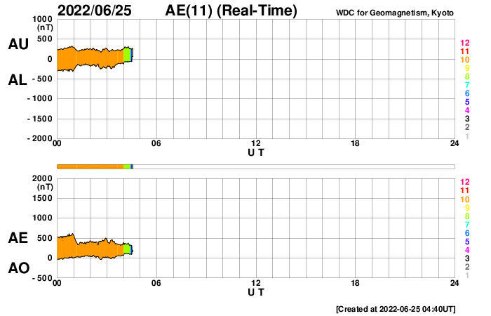(c) GOES (NOAA) ![]() DSCOVRが観測した太陽風の磁場(黒線は全体の強度、赤線は南北成分) 磁場の向き、プラズマの密度、速度、温度 (c) データ:NOAA/SWPC、作図:宇宙天気ニュース ![]() AE指数(速報値) 下段のAEグラフの値が高くなると、オーロラ活動が活発化しています。 (c) 京都大学WDC ![]() ![]() 27日の太陽周期に合わせた図 太陽が同じ面を地球に向けていた27日前の変化から、今後を予想することができます。 (c) 作図:宇宙天気ニュース