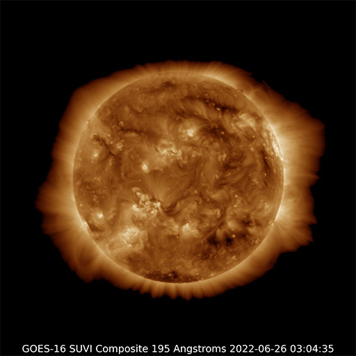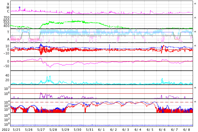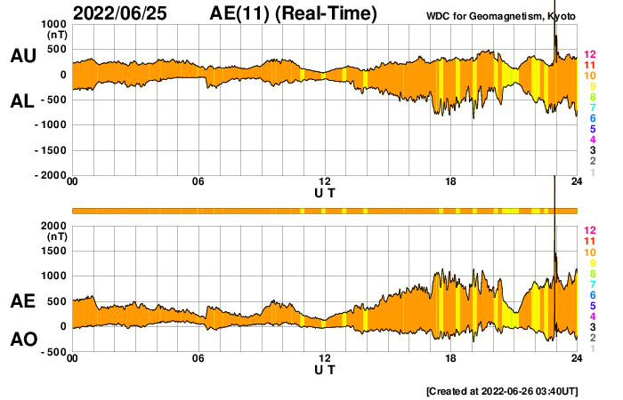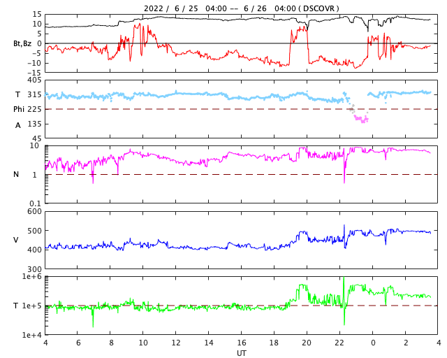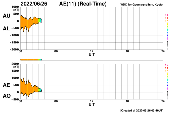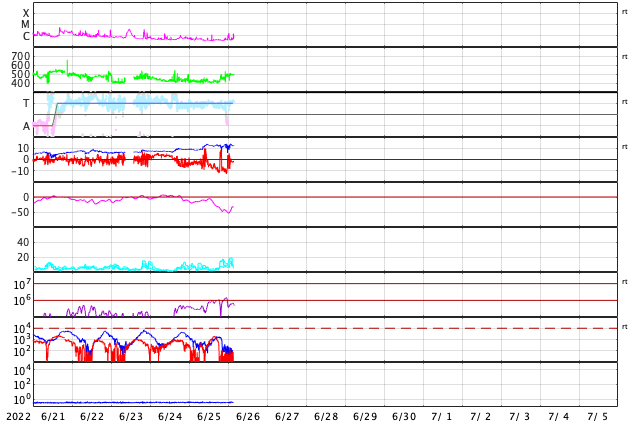 2022/ 6/26 12:50 更新 太陽風は高速風になっています。磁気圏の活動が強まりました。 担当 篠原 昨日の夕方に、太陽風の磁場強度はさらに強まり、 現在まで12nT前後で推移しています。 南北成分の南向きの変化も強まって、 -10nTに達する変化が6時間ほど発生しています。 今朝以降は、南北成分は0nT付近になっています。 太陽風の速度は、400km/秒と平均的な状態が続いていましたが、 今朝早くから上がり始め、 現在は500km/秒と高速風に達したところです。 速度の上昇は、コロナホールの影響が始まったためだと思われます。 太陽風磁場が南向きに強まった影響で、 磁気圏の活動も規模が大きくなり、 AE指数では、1000nTを超える大きな変化が後半に発生しています。 ただし、グラフの最後は変化が小さくなっていて、 磁場の南向きが弱まった影響でしょう。 SDO衛星の画像はまだ停止しています。 GOES衛星SUVI 195によると、 太陽の中心部にはコロナホールはない様です。 現在の高速風が数日続いて、 その後は穏やかな太陽風がしばらく続きそうです。 GOES衛星のX線グラフは、 C1の小さい小規模フレアが3つ見えているだけです。 フレアを起こしているのは、 太陽の中心部の南側にある3040黒点群です。 小さい活動を活発に起こしている様で、 規模が大きくなると注意が必要になるでしょう。