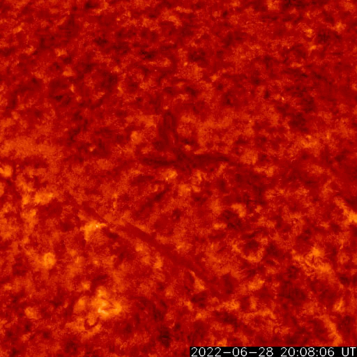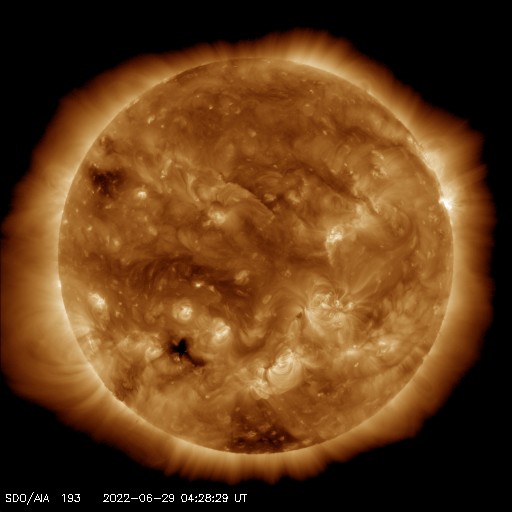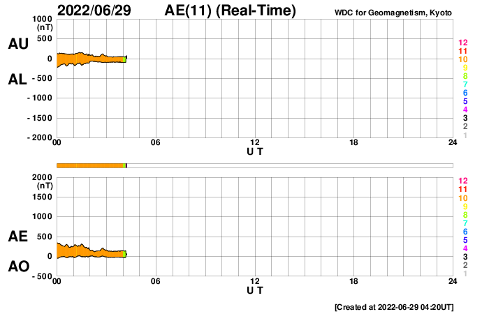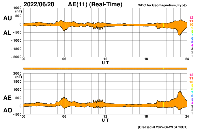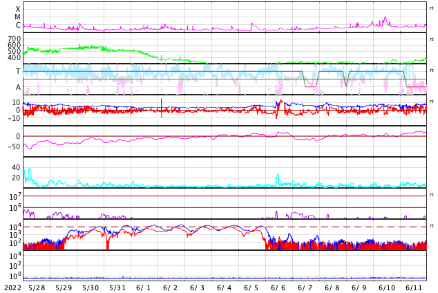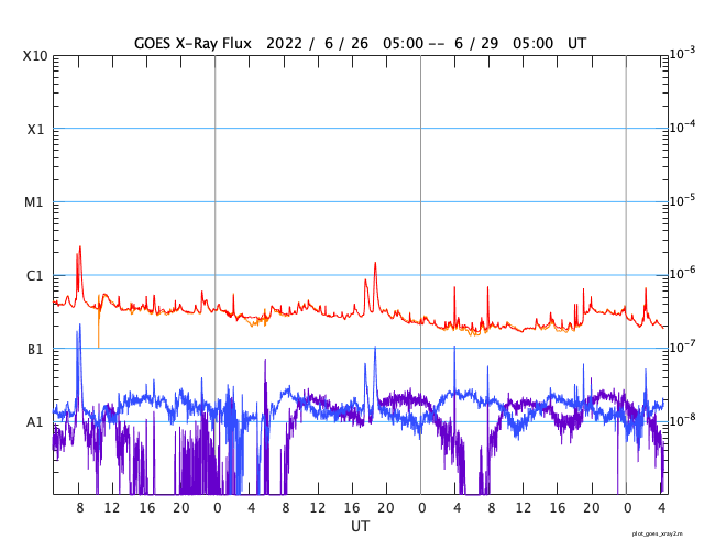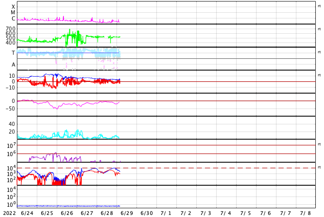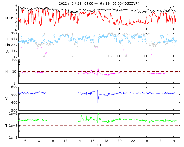 2022/ 6/29 13:31 更新 高速の太陽風が続いています。フィラメント噴出が発生しました。 担当 篠原 太陽風は、520km/秒と高速の風が安定して続いています。 26日の朝に始まった今回の高速風は、4日目に入っています。 磁場強度は、5nTから3nTへゆっくり下がり、 やや弱くなっています。 高速風の終わりが近付いているのかもしれません。 磁場の南北成分は、変化の幅は小さくなっています。 グラフの途中で南寄りになる時間帯があり、 この頃に、AE指数で900nTの中規模の変化が発生しています。 その他は、穏やかな状態です。 SDO衛星AIA193では、南東側(左下)や北東の端(左上)に 小さいコロナホールが見える程度です。 この後は穏やかな太陽風になりそうです。 太陽では、今朝、29日7時(世界時28日22時)頃に、 中心部の北側で、フィラメント噴出が発生しました。 SDO衛星AIA304の動画を掲載します。 薄暗く見えるコロナのガスが、太陽を飛び出す様子が見えています。 この噴出により、 CME(コロナ質量放出)が発生している可能性があります。 今後のSOHO衛星の画像に注目してください。 発生地点が中心に近いので、 太陽風の乱れは地球へ到来する可能性があります。 磁場の強まりがやって来て、南向きに強まった場合は、 磁気圏の活動も強まるでしょう。 X線グラフは、Bクラスの小さい変化ばかりで、 フレアの活動としては太陽は穏やかです。 放射線帯の高エネルギー電子は、 GOES17(青線)がちょうど1万の線に達しています。 ![]() 太陽の中心部で発生したフィラメント噴出。SDO衛星AIA304。 (c) SDO (NASA)、(動画加工 : 宇宙天気ニュース) ![]() SDO衛星のAIA193カメラによる太陽コロナの様子 (c) SDO (NASA) ![]() SDO衛星による太陽の可視光写真。マウスの矢印を写真に重ねると、黒点番号付きの写真に切り替わります。 (c) SDO (NASA) ![]() DSCOVRが観測した太陽風の磁場(黒線は全体の強度、赤線は南北成分) 磁場の向き、プラズマの密度、速度、温度 (c) データ:NOAA/SWPC、作図:宇宙天気ニュース ![]() AE指数(速報値) 下段のAEグラフの値が高くなると、オーロラ活動が活発化しています。 (c) 京都大学WDC ![]() ![]() 27日の太陽周期に合わせた図 太陽が同じ面を地球に向けていた27日前の変化から、今後を予想することができます。 (c) 作図:宇宙天気ニュース