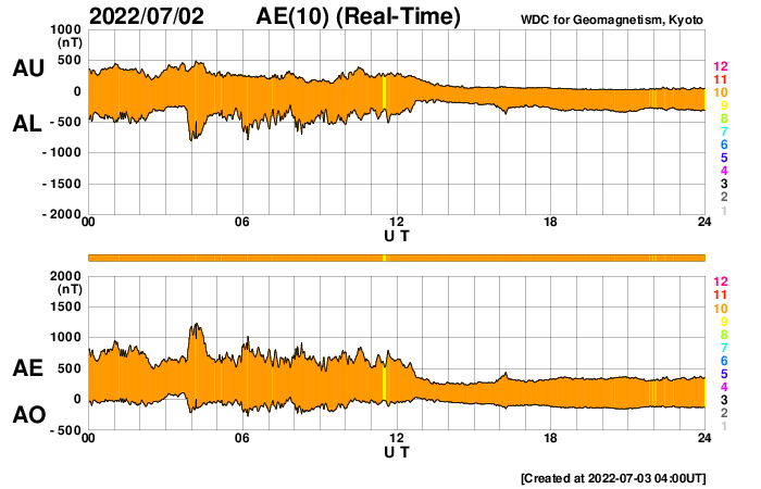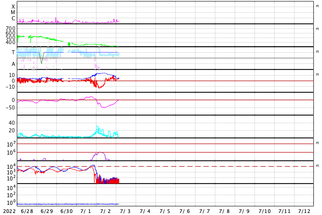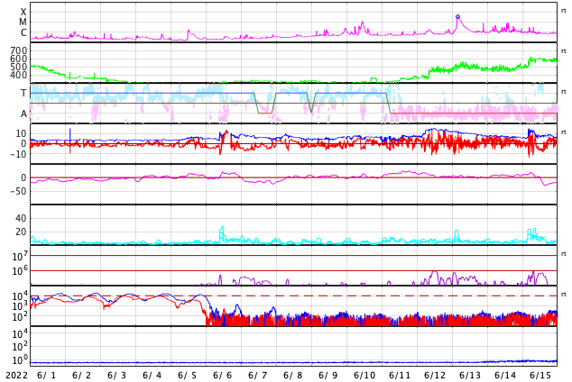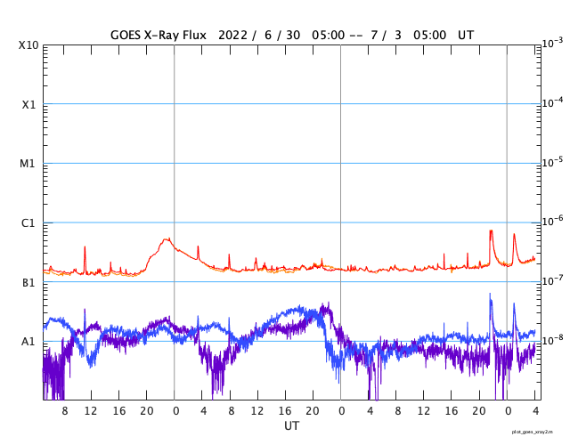 GOES衛星の太陽X線強度。赤・橙 = 0.1〜0.8 nm、青・紫 = 0.05〜0.4 nm (c) データ:NOAA/SWPC、作図:宇宙天気ニュース ![]() | ||||||||||||||||||||||||||||||||||||||||||||||||||||||||||||||||||||||||||||||||||||||||||||||||||||||||||||||||||||||||||||||||||||||||||||||||||||||||||||||||||||||||||||||||||||||||||||||||||||||||||||||||||||||||||