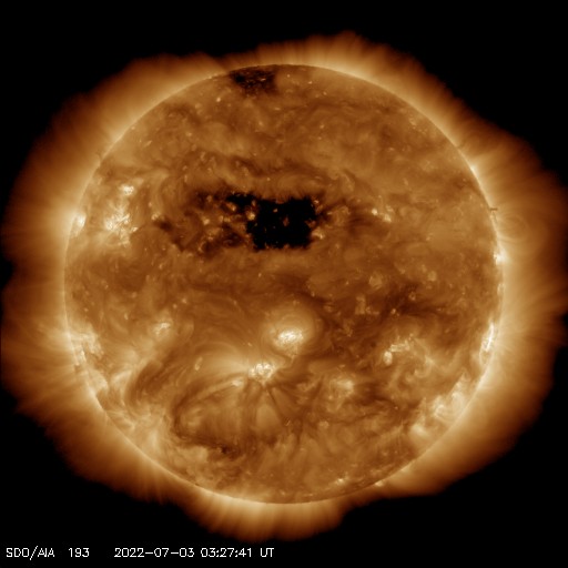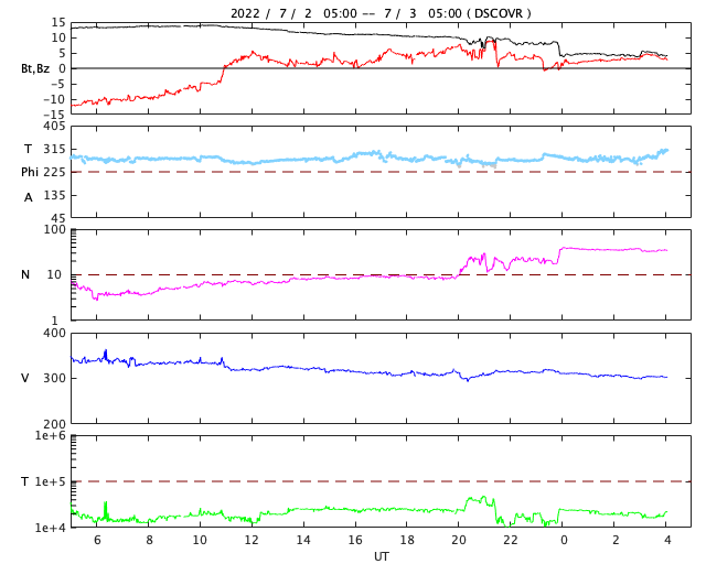 2022/ 7/ 3 13:15 更新 太陽風磁場の強まりは終わりました。太陽風は低速です。 担当 篠原 13nTに強まっていた太陽風の磁場強度は、 昨日の夜になるとゆっくりと下がり始め、 今朝、8nTまで下がったところで急に4nTへ下がり、 平均的な状態に戻っています。 太陽風の速度は、340km/秒から300km/秒へ下がり、 より低速になっています。 南向きに強まっていた磁場の南北成分は、 昨夜には北向きに切り替わり、以降、この状態です。 このため、磁気圏の活動も穏やかになっています。 AE指数のグラフを見ると、 初めの頃は700nT前後の変化が続いていますが、 途中から変化がなくなって、穏やかになっています。 (線が太いままなのは、一部のデータの関係だと思います) SDO衛星AIA193では、 北半球の真ん中にコロナホールが大きく広がっています。 この領域の影響で、 明後日くらいから、高速の太陽風が始まりそうです。 太陽は、北東(左上)の3046黒点群で Bクラスの小さいフレアが数回発生しています。 可視光写真では、左側に新しい黒点が現れています。 この後、更に発達するでしょうか。 ![]() SDO衛星のAIA193カメラによる太陽コロナの様子 (c) SDO (NASA) ![]() SDO衛星による太陽の可視光写真。マウスの矢印を写真に重ねると、黒点番号付きの写真に切り替わります。 (c) SDO (NASA) ![]() DSCOVRが観測した太陽風の磁場(黒線は全体の強度、赤線は南北成分) 磁場の向き、プラズマの密度、速度、温度 (c) データ:NOAA/SWPC、作図:宇宙天気ニュース ![]() AE指数(速報値) 下段のAEグラフの値が高くなると、オーロラ活動が活発化しています。 (c) 京都大学WDC ![]() ![]() 27日の太陽周期に合わせた図 太陽が同じ面を地球に向けていた27日前の変化から、今後を予想することができます。 (c) 作図:宇宙天気ニュース