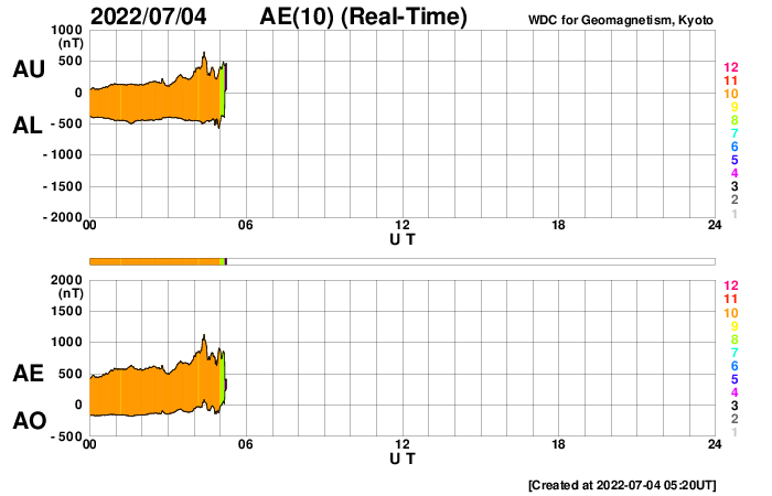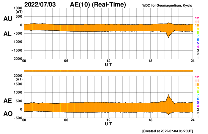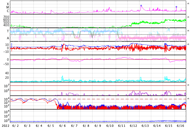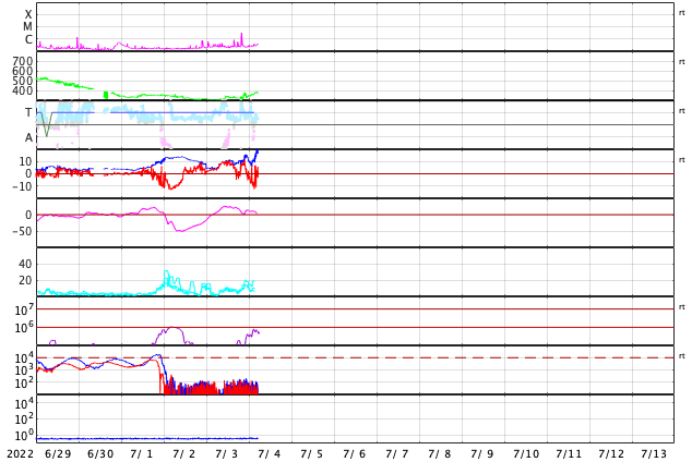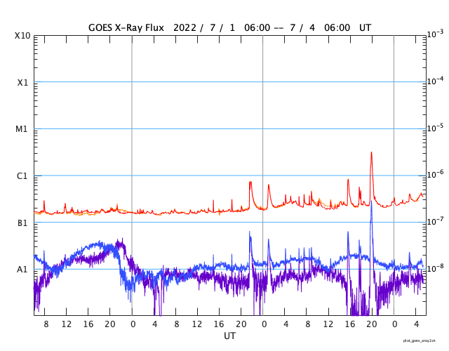 GOES衛星の太陽X線強度。赤・橙 = 0.1〜0.8 nm、青・紫 = 0.05〜0.4 nm (c) データ:NOAA/SWPC、作図:宇宙天気ニュース ![]() | ||||||||||||||||||||||||||||||||||||||||||||||||||||||||||||||||||||||||||||||||||||||||||||||||||||||||||||||||||||||||||||||||||||||||||||||||||||||||||||||||||||||||||||||||||||||||||||||||||||||||||||||||||||||