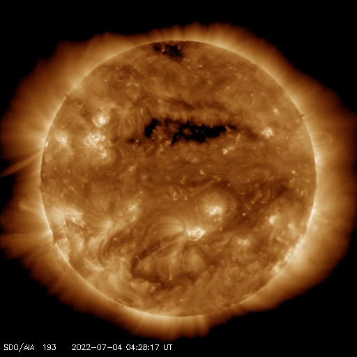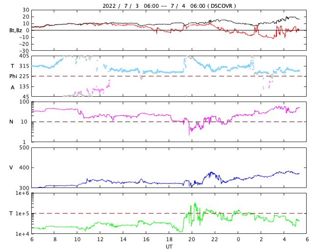 2022/ 7/ 4 14:31 更新 太陽風磁場が再び強まっています。コロナホールの影響が始まりそうです。 担当 篠原 太陽風は、昨日のニュースの後から磁場が強まり始め、 夜には10nTに達し、更に、今日の昼には20nTへ強まっています。 29日のフィラメント噴出による乱れが 到来した可能性があります。 300km/秒と低速だった太陽風の速度は、 昨夜以降320km/秒へ少し上がり、 今朝から再び上昇して、 現在は370km/秒とやや低速の状態に達しています。 太陽風磁場の南北成分は、 磁場の強まり以降北向きの傾向が続いていましたが、 今朝から昼にかけて南向きに強まり、現在は0nT付近です。 AE指数は、グラフが太くなっていて変化が見にくいですが、 グラフの中盤までは変化が少なく、 後半にやや大きい変化が発生している様です。 SDO衛星AIA193では、 北半球のコロナホールが更に西に進み、 影響が始まる目安の位置に近付いています。 今回の磁場の乱れに続く様に、 速度の高まりが始まるかもしれません この後の推移に注目して下さい。 太陽は、南西の端(右下)に沈んで行った3040黒点群で C3.1の小規模フレアが発生した程度で、 その他の領域は穏やかです。 鹿児島は、台風4号の影響で雨が次第に強まってきました。 今のところ、風は特にありません。 予報では、今夜から明日の午前中にかけて雨が強まる様です。 ![]() SDO衛星のAIA193カメラによる太陽コロナの様子 (c) SDO (NASA) ![]() SDO衛星による太陽の可視光写真。マウスの矢印を写真に重ねると、黒点番号付きの写真に切り替わります。 (c) SDO (NASA) ![]() DSCOVRが観測した太陽風の磁場(黒線は全体の強度、赤線は南北成分) 磁場の向き、プラズマの密度、速度、温度 (c) データ:NOAA/SWPC、作図:宇宙天気ニュース ![]() AE指数(速報値) 下段のAEグラフの値が高くなると、オーロラ活動が活発化しています。 (c) 京都大学WDC ![]() ![]() 27日の太陽周期に合わせた図 太陽が同じ面を地球に向けていた27日前の変化から、今後を予想することができます。 (c) 作図:宇宙天気ニュース