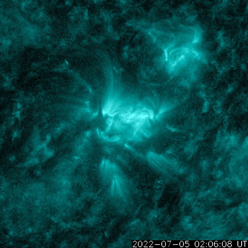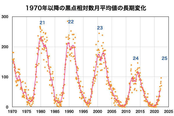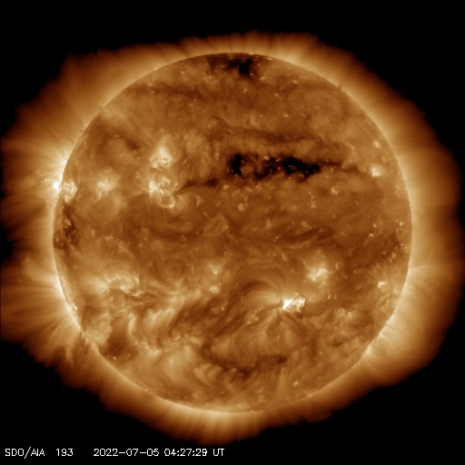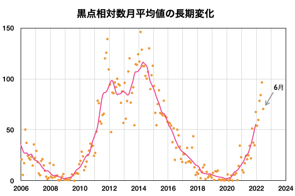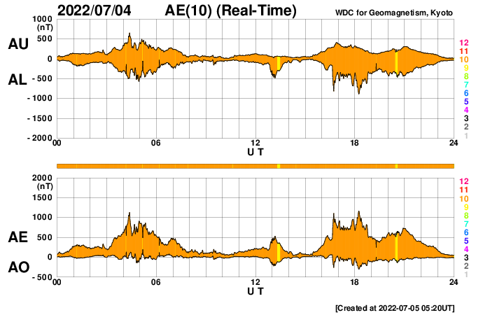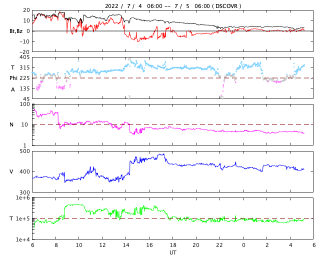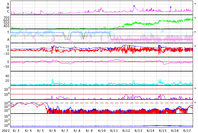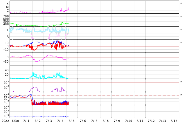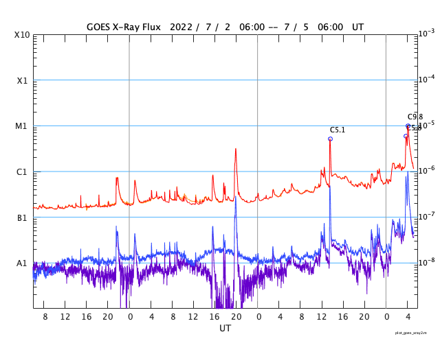 2022/ 7/ 5 14:24 更新 C9.8の小規模フレアが発生しています。6月の黒点相対数は 70.5 でした。 担当 篠原 WDC-SILSOより、6月の黒点相対数は 70.5 と発表されました。 その前の5月は 96.5 と、3桁まであと少しだったのですが、 一旦、下がることになりました。 その傾向はフレアの発生数でも現れていて、 NOAA/SWPCの記録を数えると、 C以上のフレアは、4月は226回、5月は257回起きていましたが、 6月は107回と半減しています。 全体としては活動の極大に向かっているので、 この後、再び増加することは間違いないでしょう。 引き続き活動の推移に注目してください。 その太陽では、昨夜からフレアの発生が増えて、 X線グラフの強度も上がっています。 目立つフレアは、中心部北東側(左上)の3050黒点群で (現在は黒点が見えなくなっています)、 昨夜、4日22時半(世界時4日13時半)にC5.1の小規模フレア。 北東の端で、5日12時半(世界時4日3時半)にC5.8の小規模フレア。 直後の5日13時(世界時5日4時)に、南東(右下)の3047群で C9.8とMクラス寸前の小規模フレアが発生しています。 最後のC9.8フレアの様子をSDO衛星AIA131の動画で紹介します。 太陽全体の画像では、直前のC5.8も左上の端で見えています。 この後も活動は続くでしょうか。 注目してください。 太陽風は、昨夜遅くまで磁場強度が15nTに強まった状態が続きましたが、 その後は低下して、現在は3nTとやや弱くなっています。 速度は、370km/秒とやや低速の状態から、 一旦、480km/秒に上がりましたが、 少し下がって、現在は420km/秒と平均的な速さに戻っています。 SDO衛星AIA193で見えているコロナホールの影響は、 これからの様です。 AE指数は、太陽風磁場が南向きに変化した頃に、 1000nTに達する大きな変化が発生しています。 現在は、磁場の南北成分は0nT付近で変化が小さくなっていて、 AE指数も変化が見られない状態になっています。