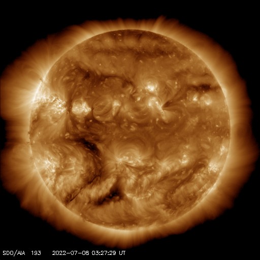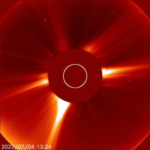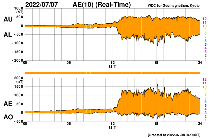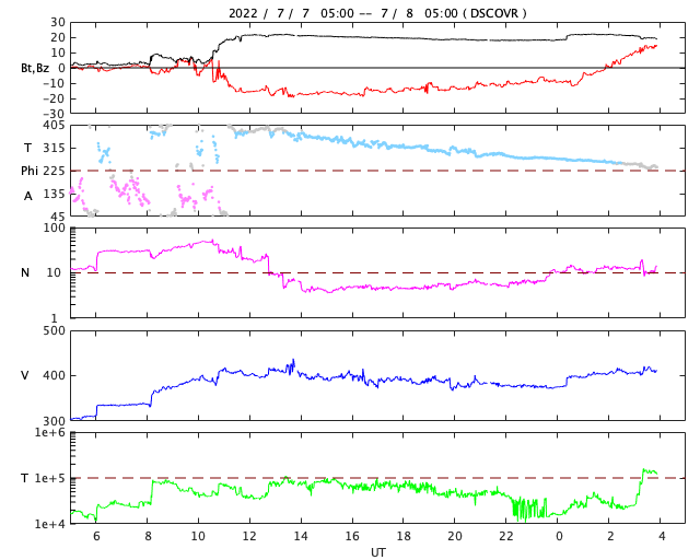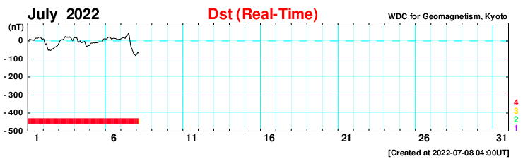 2022/ 7/ 8 13:08 更新 太陽風磁場の強まりが到来し、南向きに強まって磁気圏の活動が激しくなりました。 担当 篠原 昨夜から太陽風の磁場が強まり、 南向きに変化して磁気圏の活動を強めています。 DSCOVR衛星のデータを見ると、 最初の変化は、7日15時(世界時7日6時)の 速度と密度の急な高まりです。 変化は小さく、速度は310km/秒から330km/秒に上がった程度です。 続いて、7日17時(世界時7日8時)に小さい変化が到来し、 速度は330km/秒から360km/秒へ、 磁場強度も3nTから8nTへ少し強まります。 その後、速度は400km/秒へ次第に高まりますが、 7日19時(世界時7日10時)過ぎから磁場強度が本格的に強まり始め、 2時間ほどで22nTに達しました。 それから16時間ほど経過した現在まで、 磁場強度は20nT前後で推移しています。 速度は、400km/秒から370km/秒へ少し下がり、 再び400km/秒に上がっています。 磁場の変化の様子から、 CME(コロナ質量放出)により 太陽から磁場の強まりが運ばれてきたのではないかと思いますが、 原因と思われるはっきりした現象が見つかりません。 4日21時半(世界時4日13時半)に、 太陽の東側の3050黒点群で発生した C5.1の小規模フレアの時に見られたコロナの噴出が原因かもしれません。 GOES衛星SUVI 195の動画を掲載します。 フレアの時に、コロナのガスが左下に向かって飛び出す様子が見えています。 SOHO衛星LASCO C2、C3を見ると、 淡いコロナのガスが太陽の左下に向かって飛び出しています。 この変化だと、発生から3日ほどかけて地球に到来したことになり、 タイミングとしては問題ないと思います。 磁場の強まりが始まると、南北成分は南向きに大きく振れ始め、 -17nTに達する大きい変化になりました。 -10nTを超える変化は半日ほど続いています。 このため磁気圏の活動がかなり強められ、 AE指数では1000〜1500nTの大規模な変化が半日を超えて続きました。 Dst指数の速報値は、 -82nTに達していて、 中規模の磁気嵐が発生している様です。 (Dst指数はマイナス方向に強まります) 太陽風の磁場強度は、現在も20nTに強まった状態ですが、 南北成分は、8日11時(世界時8日2時)に北向きに切り替わりました。 この後、磁気圏の活動は穏やかになるでしょう。 太陽風磁場の強まりはどこまで続くでしょうか。 磁気圏は穏やかになりますが、引き続き注目してください。 太陽は、東側(左側)の3053黒点群が大きな姿を見せていますが、 フレアの活動は全体的に穏やかで、 南東(左下)の3055黒点群でC1.4の小規模フレアが発生した程度です。 ![]() 7月4日に発生したC5.1の小規模フレアとコロナの噴き出し。GOES衛星SUVI 195。 (c) GOES (NOAA)、(動画加工 : 宇宙天気ニュース) ![]() 太陽の左下に向かって淡いCMEが飛び出している。SOHO衛星LASCO C2、C3。 (c) SOHO (ESA & NASA)、 (動画加工 : 宇宙天気ニュース) ![]() Dst指数の速報値は、-82nTに達していて、中規模の磁気嵐が発生しています。 (c) 京都大学WDC ![]() 3053黒点群の様子。SDO衛星。 (c) SDO (NASA)、作図:宇宙天気ニュース ![]() SDO衛星のAIA193カメラによる太陽コロナの様子 (c) SDO (NASA) ![]() SDO衛星による太陽の可視光写真。マウスの矢印を写真に重ねると、黒点番号付きの写真に切り替わります。 (c) SDO (NASA) ![]() DSCOVRが観測した太陽風の磁場(黒線は全体の強度、赤線は南北成分) 磁場の向き、プラズマの密度、速度、温度 (c) データ:NOAA/SWPC、作図:宇宙天気ニュース ![]() AE指数(速報値) 下段のAEグラフの値が高くなると、オーロラ活動が活発化しています。 (c) 京都大学WDC ![]() ![]() 27日の太陽周期に合わせた図 太陽が同じ面を地球に向けていた27日前の変化から、今後を予想することができます。 (c) 作図:宇宙天気ニュース