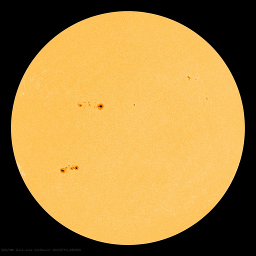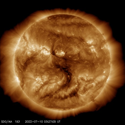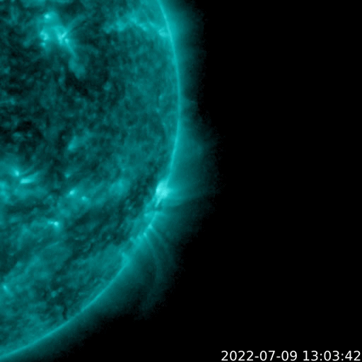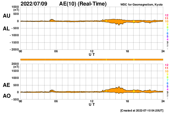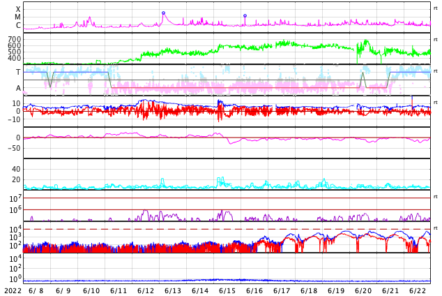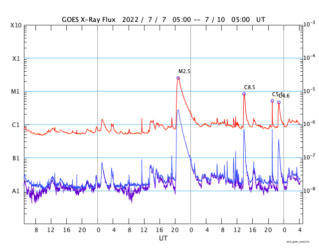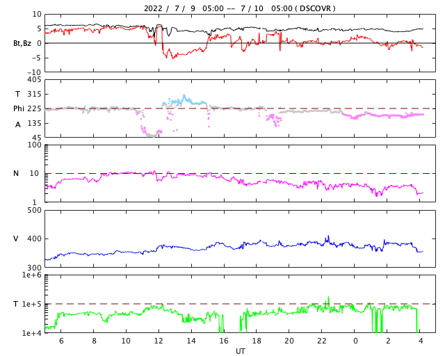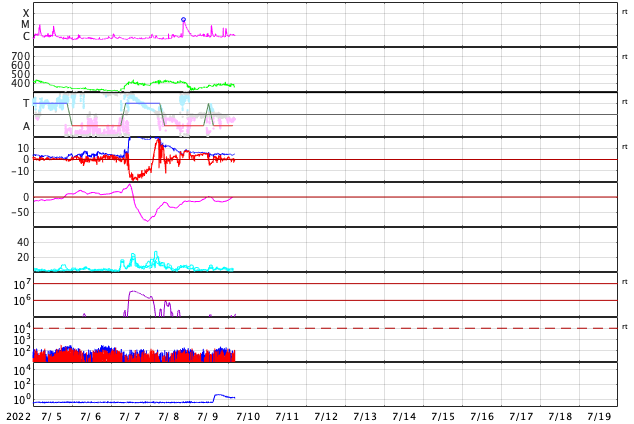 2022/ 7/10 13:24 更新 C8.5などの小規模フレアが発生しています。太陽風はやや低速で、磁気圏は穏やかです。 担当 篠原 昨夜、9日22時半(世界時9日13時半)に、 太陽の西の端近く(右端)の3047黒点群で C8.5の小規模フレアが発生しました。 GOES衛星SUVI 131、304による動画を掲載します。 赤色の304の画像では、 プロミネンスが噴出する様子が見えています。 このフレアに伴うCME(コロナ質量放出)を、 SOHO衛星LASCO C2、C3の動画で紹介します。 太陽から右に向かってコロナのガスが飛び出しています。 地球に対しては横向きなので、影響はないでしょう。 動画では、追いかけるように次のCMEが太陽の右上に向かっています。 これは、太陽の向こう側の現象の様です。 太陽では、今朝早くに、 北西側(右上)の3051群でC5.1、 中心部の3052群でC4.6の小規模フレアが発生しています。 以降は落ち着いていますが、この後はどう推移するでしょうか。 太陽風は、昨日のニュースの後ゆっくりと速度が上がり、 今日に入る頃から380km/秒とやや低速の状態です。 磁場強度は、5nTと平均的な状態です。 磁気圏は概ね静穏で、 AE指数は400nTの小規模の変化が1回起きている程度で、 その他は静かです。 SDO衛星AIA193の太陽コロナ写真は、 中心部から南側に濃い筋がいくつも伸びていますが、 これらはダークフィラメントの様です。 太陽風は穏やかに推移しそうです。