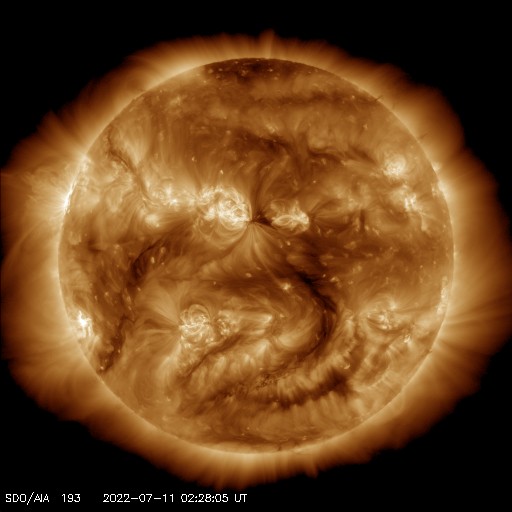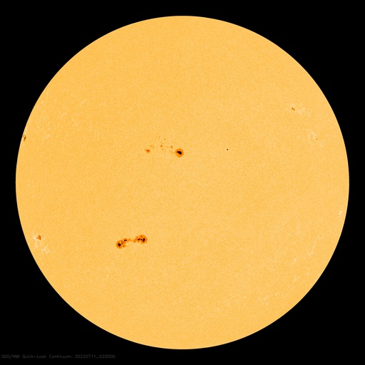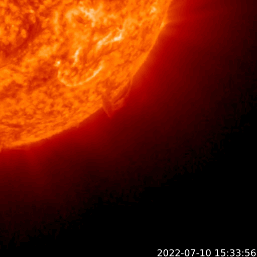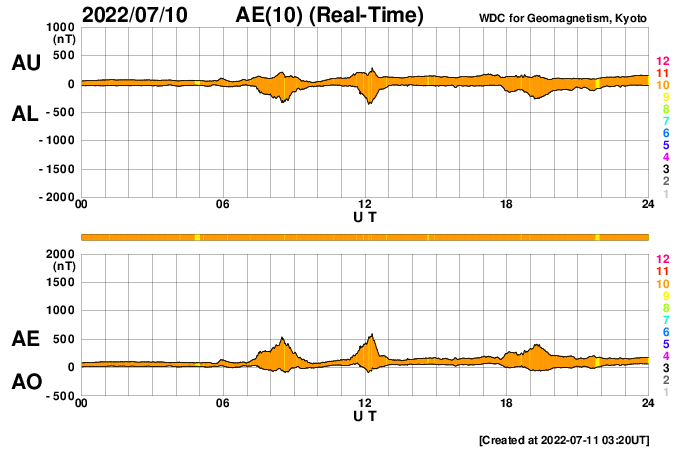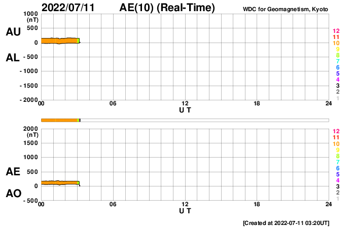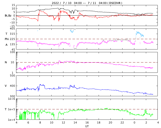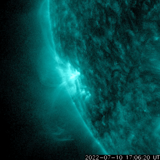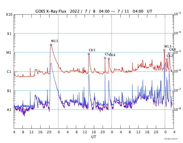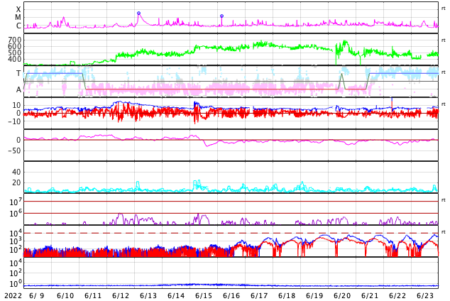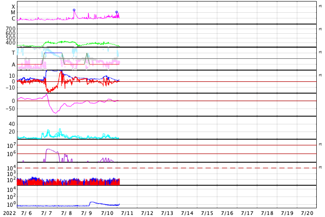 2022/ 7/11 12:21 更新 M1.3の中規模フレアが発生しました。太陽風は低速になっています。 担当 篠原 昨夜から、太陽の南東の端(左下)の3056黒点群で フレアの発生が続く様になり、 夜から今朝にかけて、C4.1、C4.2などを最大とする 小規模フレアが13回ほど発生し、 今朝、11日8時半(世界時10日23時半)には、 M1.3の中規模フレアが発生しました。 その様子を、SDO衛星AIA131の動画で紹介します。 左下の領域で小さい輝きが繰り返し発生しています。 3056群では、その後もC3.5、C8.8の小規模フレアが発生しています。 引き続き活動に注目してください。 太陽では、今日未明に南西の端(右下)で プロミネンスの噴出が発生しています。 GOES衛星SUVI 304の動画を掲載します。 雄大な噴き上がりをご覧下さい。 横向きの現象なので、地球への影響はありません。 太陽風の速度は、 昨夜までは370km/秒とやや低速で推移していましたが、 今日に入る頃からゆっくりと下がり、 現在は320km/秒と低速になっています。 磁場強度は、5nTから10nTへゆっくり上がり、 その後、3nTへゆっくり下がるという変化が発生しています。 AE指数は、500nT前後の変化が3回発生している程度で、 磁気圏は、全体としては穏やかです。