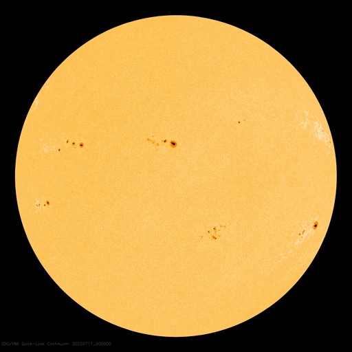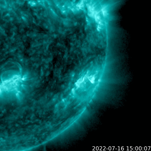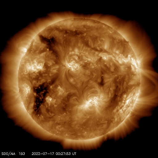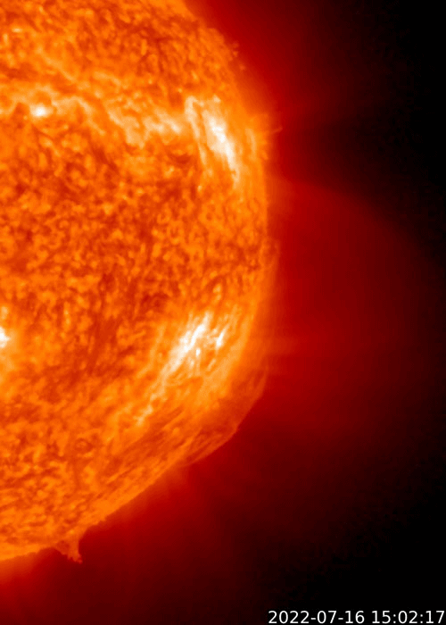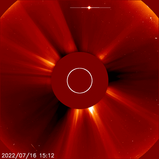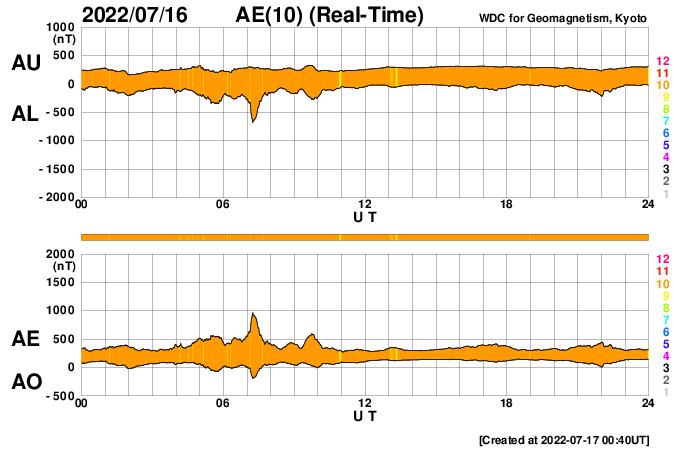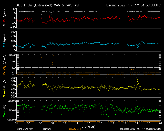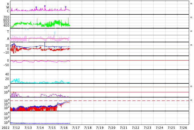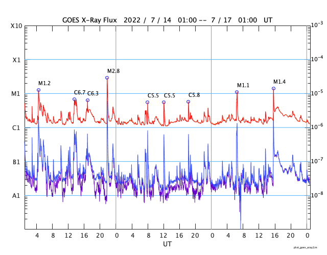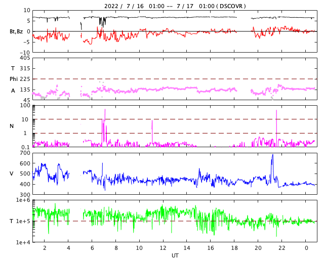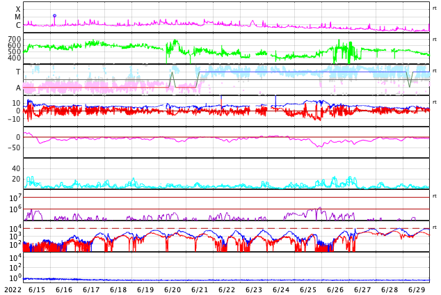 2022/ 7/17 09:55 更新 Mクラスのフレアが2回発生しました。太陽風は平均的な速度です。 担当 篠原 太陽の北と南でMクラスの中規模フレアが発生しています。 初めは、16日15時半(世界時16日6時半)に、 中心部北側の3057黒点群でM1.1が、 そして、深夜、17日0時半(世界時16日15時半)に、 南西の端近く(右下)の3055群でM1.4が発生しました。 GOES衛星SUVI 131、304による、 南西のM1.4フレアの動画を掲載します。 赤い304の画像では、フレアの後に、 北側と南側の領域からフィラメントが噴出しているのが見えます。 2枚目の動画で、この噴出を拡大して表示します。 北側の噴出は小さく、南側はより大きく噴出しています。 SOHO衛星LASCO C2、C3では、 右上に微かに、そして、右下にもう少し濃く 飛び出して行くCME(コロナ質量放出)が見えています。 左上にも飛び出すCMEが見えますが、 これは向こう側の別の現象です。 地球に対して斜めの噴出なので、 太陽風の乱れは到来しても小規模に留まりそうです。 太陽風のグラフは、500km/秒から450km/秒へ下がり、 最後は400km/秒と平均的な速度に変化しています。 NOAA/SWPCの図を見ると、 ACE衛星のデータに切り替えられている様です。 参考にACE衛星のグラフも掲載しますが、 速度のグラフは同じ推移です。 磁場強度は7nTと少し高めで、 南北成分は、前半は南寄りですが、 中盤以降は0nT付近になっています。 このため、AE指数は初めの頃に小中規模の変化が起きていますが、 その後は静かになっています。 SDO衛星AIA193の太陽コロナ写真を見ると、 東側(左側)の南北にコロナホールが広がっています。 次の太陽風速度の高まりは、この領域の影響になりそうです。