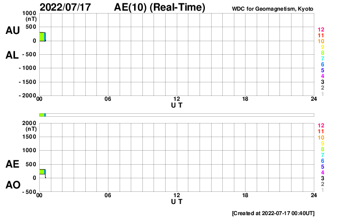 (c) GOES (NOAA)、(動画加工 : 宇宙天気ニュース) ![]() 太陽の西側の南北で発生したフィラメント噴出。GOES衛星SUVI 304。 (c) GOES (NOAA)、(動画加工 : 宇宙天気ニュース) ![]() フィラメント噴出によるCMEが太陽の右下に広がっている。SOHO衛星LASCO C2、C3。 (c) SOHO (ESA & NASA)、 (動画加工 : 宇宙天気ニュース) ![]() SDO衛星のAIA193カメラによる太陽コロナの様子 (c) SDO (NASA) ![]() SDO衛星による太陽の可視光写真。マウスの矢印を写真に重ねると、黒点番号付きの写真に切り替わります。 (c) SDO (NASA) ![]() GOES衛星の太陽X線強度。赤・橙 = 0.1〜0.8 nm、青・紫 = 0.05〜0.4 nm (c) データ:NOAA/SWPC、作図:宇宙天気ニュース ![]() DSCOVRが観測した太陽風の磁場(黒線は全体の強度、赤線は南北成分) 磁場の向き、プラズマの密度、速度、温度 (c) データ:NOAA/SWPC、作図:宇宙天気ニュース ![]() ACEが観測した太陽風の磁場(1番上の枠、白線は全体の強度、赤線は南北成分) および、太陽風の密度(3番目の橙線)、速度(4番目の黄線) (c) NOAA/SWPC ![]() AE指数(速報値) 下段のAEグラフの値が高くなると、オーロラ活動が活発化しています。 (c) 京都大学WDC ![]() ![]() 27日の太陽周期に合わせた図 太陽が同じ面を地球に向けていた27日前の変化から、今後を予想することができます。 (c) 作図:宇宙天気ニュース