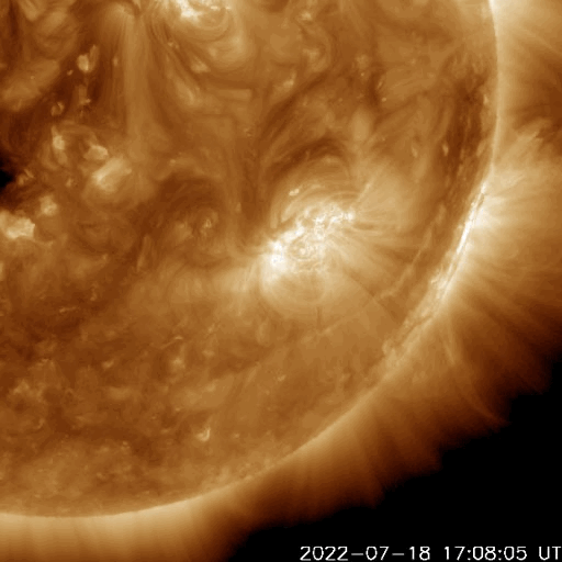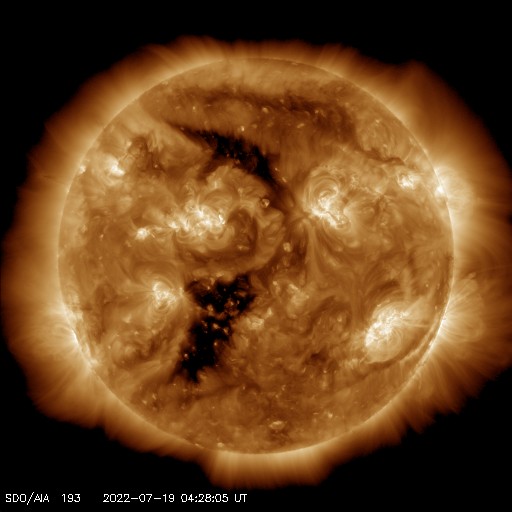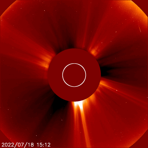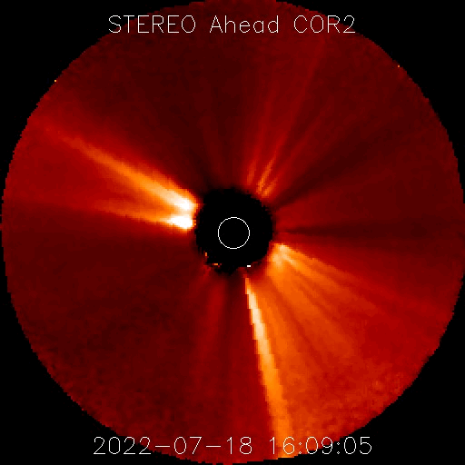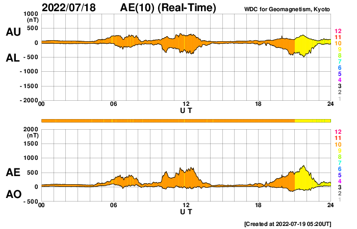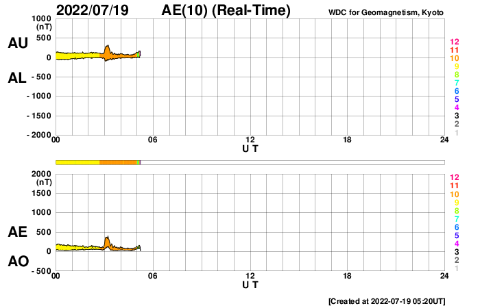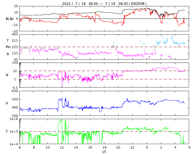 2022/ 7/19 14:38 更新 太陽風の乱れが到来しました。太陽風の速度はやや高まっています。 担当 篠原 今朝、19日5時半(世界時18日20時半)に、 太陽風の速度が400km/秒から470km/秒へ、 磁場強度が8nTから14nTへ急に強まる変化が発生しています。 16日のニュースでお知らせした、 15日夜のフィラメント噴出の時に発生した CME(コロナ質量放出)による乱れが到来したのかもしれません。 その場合、到来まで3日半となり、良さそうなタイミングです。 磁場の南北成分は、 グラフ全体としては北を向いたり南を向いたり、 傾向が変化していて、 南向きの頃に、 AE指数で500〜700nTの中規模の変化が発生しています。 グラフの最後は南向きに強まっていますが、 この傾向が続くと、この後の磁気圏の活動は高まるでしょう。 SDO衛星AIA193では、 太陽の中心部を南北にコロナホールが伸びています。 3日後くらいからこの領域の影響で、 太陽風の速度が高まりそうです。 太陽では、今朝、19日4時(世界時18日19時)頃に、 南西側(右下)で爆発現象が発生しています。 SDO衛星AIA193の動画を掲載します。 はっきりとした見え方ではありませんが、 コロナが急に変化する様子が見えています。 SOHO衛星LASCO C2、C3では、 太陽の南西(右下)に向かって CMEが飛び出す様子が撮影されています。 STEREO Ahead衛星COR2でもCMEは南側に偏っていて、 地球方向への噴出は小さい様です。 フレアは、3055、3057、3058群で C1〜3の小規模フレアが6回ほど発生した程度で、 太陽の活動は次第に小さくなっています。 ![]() 太陽の南西側で爆発現象が発生しました。SDO衛星AIA193。 (c) SDO (NASA)、(動画加工 : 宇宙天気ニュース) ![]() 太陽の南西に向かってCMEが発生しています。SOHO衛星LASCO C2、C3。 (c) SOHO (ESA & NASA)、 (動画加工 : 宇宙天気ニュース) ![]() STEREO Ahead衛星COR2によるCMEの様子。 (c) STEREO (NASA)、 (動画加工 : 宇宙天気ニュース) ![]() SDO衛星のAIA193カメラによる太陽コロナの様子 (c) SDO (NASA) ![]() SDO衛星による太陽の可視光写真。マウスの矢印を写真に重ねると、黒点番号付きの写真に切り替わります。 (c) SDO (NASA) ![]() DSCOVRが観測した太陽風の磁場(黒線は全体の強度、赤線は南北成分) 磁場の向き、プラズマの密度、速度、温度 (c) データ:NOAA/SWPC、作図:宇宙天気ニュース ![]() AE指数(速報値) 下段のAEグラフの値が高くなると、オーロラ活動が活発化しています。 (c) 京都大学WDC ![]() ![]() 27日の太陽周期に合わせた図 太陽が同じ面を地球に向けていた27日前の変化から、今後を予想することができます。 (c) 作図:宇宙天気ニュース