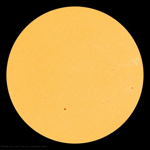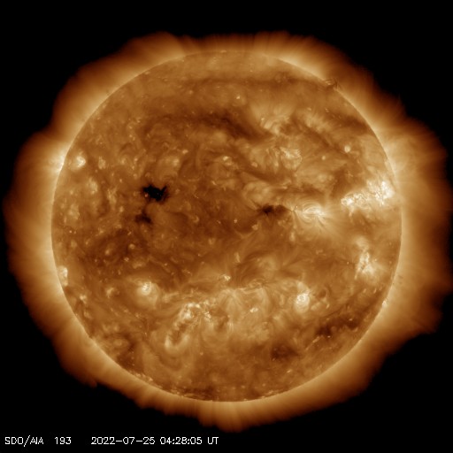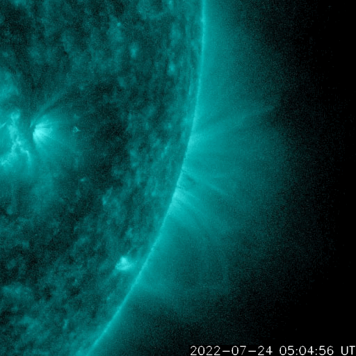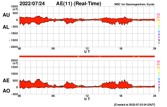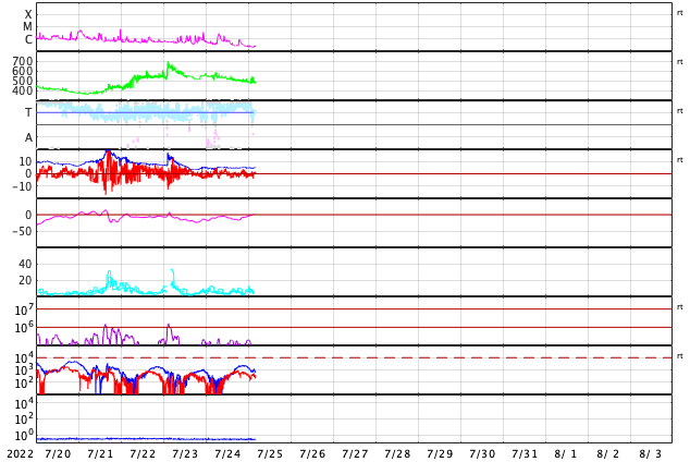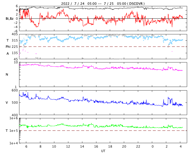 2022/ 7/25 13:40 更新 太陽風はやや高速で、太陽風は穏やかになりそうです。 担当 篠原 太陽風は、540km/秒から480km/秒へゆっくりと速度が下がり、 やや高速の状態です。 磁場強度は、5nTと平均的な状態が続いています。 磁場の南北成分は、弱い南寄りです。 磁気圏では時々活動が高まって、 AE指数は、300〜500nTの小規模の変化が数回発生しています。 SDO衛星AIA193では、 西側(右側)のコロナホールはほとんど見えなくなっています。 一方、中心部に目立つコロナホールはなく、 太陽風はこの後、穏やかな状態になりそうです。 太陽の可視光写真は、黒点が西側に偏って、 東側が寂しくなっています。 24日15時半(世界時24日6時半)に、 北西の端(右上)の向こう側でC2.6の小規模フレアが発生しました。 ほぼ同時刻に南西の端(右下)の向こう側でもフレアが発生した様で、 SDO衛星AIA131で、コロナのガスが噴き上がる様子が見えています。 C2.6を記録したのは北西側ですが、 南西の現象の方が目立つので、こちらの拡大写真の動画を掲載します。 太陽全体の画像の時に、右上のC2.6の輝きも小さく見えています。 SDO衛星AIA131、193どちらも、 太陽の左側に明るい領域がほとんど見られず、静かな状態です。