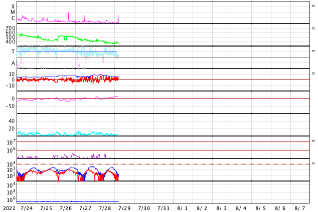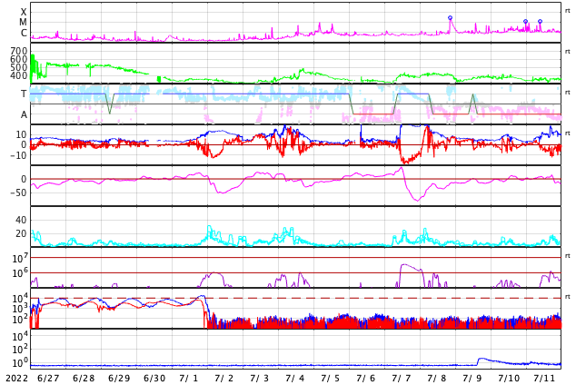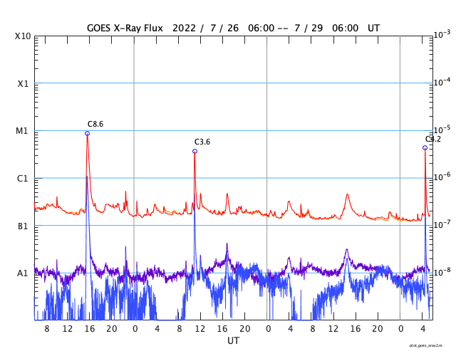 GOES衛星の太陽X線強度。赤・橙 = 0.1〜0.8 nm、青・紫 = 0.05〜0.4 nm (c) データ:NOAA/SWPC、作図:宇宙天気ニュース ![]() | |||||||||||||||||||||||||||||||||||||||||||||||||||||||||||||||||||||||||||||||||||||||||||||||||||||||||||||||||||||||||||||||||||||||||||||||||||||||||||||||||||||||||||||||||||||||||||||||||||||||||||||||||||||||||||||