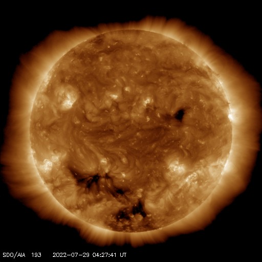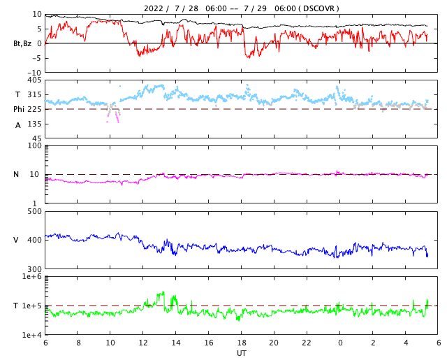 2022/ 7/29 14:31 更新 太陽風はやや低速になっています。磁気圏も概ね静穏です。 担当 篠原 太陽風の速度は、400km/から370km/秒へ少し下がり、 やや低速になっています。 磁場強度は、8nTから6nTへ下がって、 平均的な状態です。 磁場の南北成分は、北寄りの傾向になっていて、 時々南向きに変化しています。 そのタイミングで磁気圏の活動が少し高まって、 AE指数に300nTの小さい変化が発生していますが、 全体としては穏やかです。 SDO衛星AIA193では、 南半球の中緯度域にコロナホールが見えています。 3日後くらいから速度が高まるかもしれません。 太陽は、先ほど、29日13時半(世界時29日4時半)に、 南東の端(左下)の3068黒点群で C4.2の小規模フレアが発生しました。 3068群は、黒点が少し大きくなっています。 その他は目立った変化はなく、穏やかな状態です。 ![]() SDO衛星のAIA193カメラによる太陽コロナの様子 (c) SDO (NASA) ![]() SDO衛星による太陽の可視光写真。マウスの矢印を写真に重ねると、黒点番号付きの写真に切り替わります。 (c) SDO (NASA) ![]() DSCOVRが観測した太陽風の磁場(黒線は全体の強度、赤線は南北成分) 磁場の向き、プラズマの密度、速度、温度 (c) データ:NOAA/SWPC、作図:宇宙天気ニュース ![]() AE指数(速報値) 下段のAEグラフの値が高くなると、オーロラ活動が活発化しています。 (c) 京都大学WDC ![]() ![]() 27日の太陽周期に合わせた図 太陽が同じ面を地球に向けていた27日前の変化から、今後を予想することができます。 (c) 作図:宇宙天気ニュース