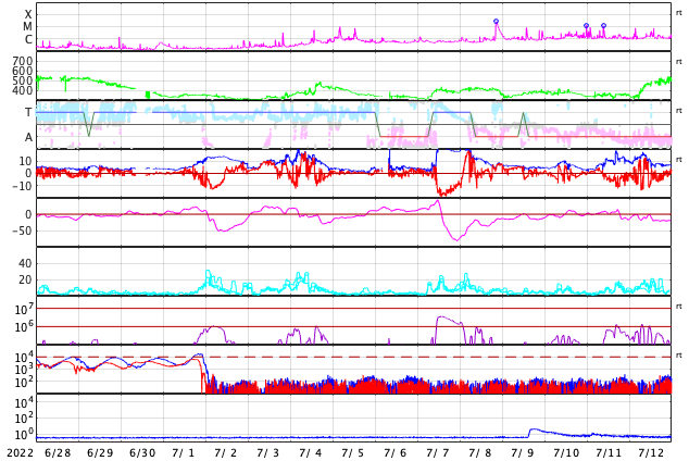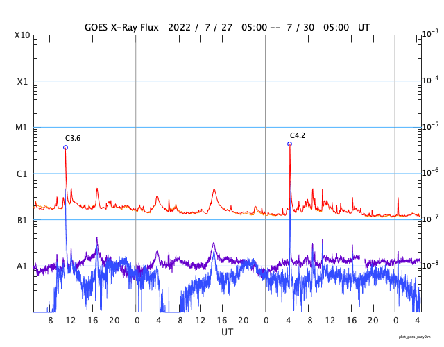 GOES衛星の太陽X線強度。赤・橙 = 0.1〜0.8 nm、青・紫 = 0.05〜0.4 nm (c) データ:NOAA/SWPC、作図:宇宙天気ニュース ![]() | ||||||||||||||||||||||||||||||||||||||||||||||||||||||||||||||||||||||||||||||||||||||||||||||||||||||||||||||||||||||||||||||||||||||||||||||||||||||||||||||||||||||||||||||||||||||||||||||||||||||||||||||||||||||||