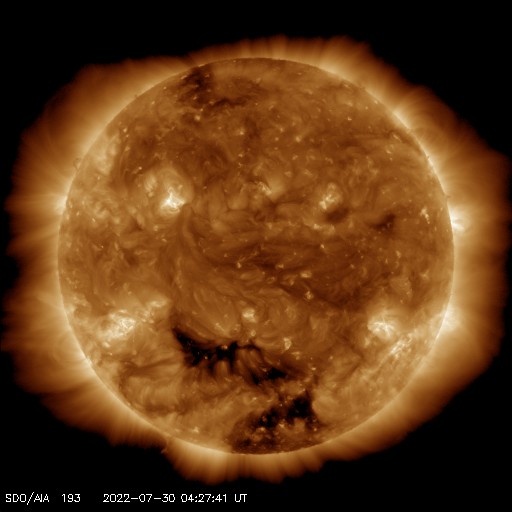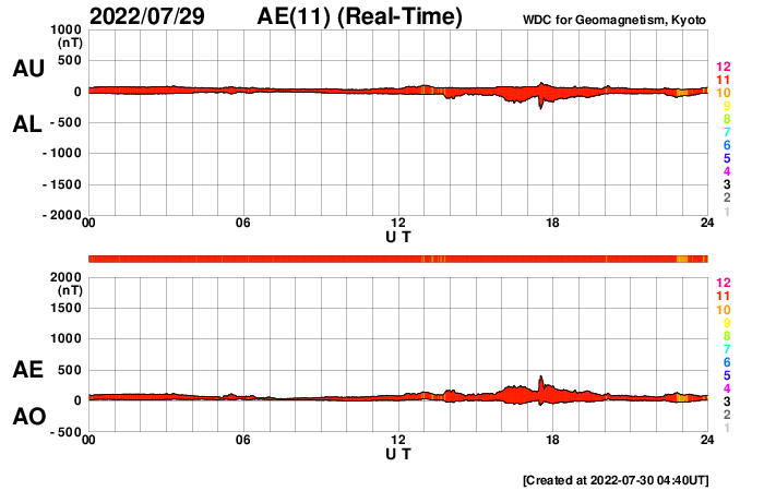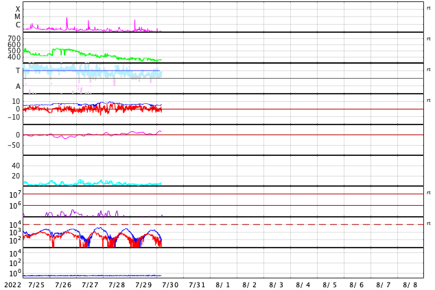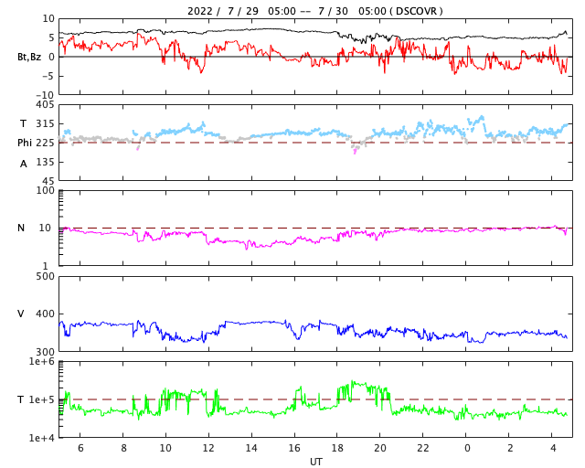 2022/ 7/30 13:51 更新 太陽風はより低速になっています。磁気圏も穏やかです。 担当 篠原 太陽風の速度は、370km/秒から350km/秒へ少し下がり、 より低速の状態になっています。 磁場強度は、5〜6nTと平均的な状態です。 磁気圏は穏やかで、 AE指数は、小さい変化がぽつんと見られる程度です。 SDO衛星AIA193では、 太陽の南半球にコロナホールが広がっています。 明後日くらいから、 この領域の影響で太陽風の速度が高まる可能性があります。 太陽は、南東(左下)の3068黒点群で、 Bクラスの小さいフレアが度々発生しています。 黒点も少し大きくなっている様で、 この後、活動の規模が大きくなるか、注目してください。