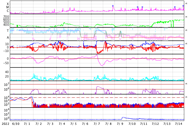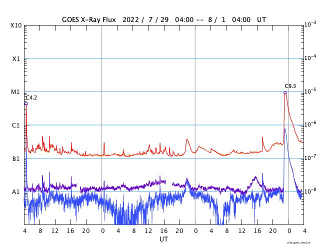 GOES衛星の太陽X線強度。赤・橙 = 0.1〜0.8 nm、青・紫 = 0.05〜0.4 nm (c) データ:NOAA/SWPC、作図:宇宙天気ニュース ![]() | ||||||||||||||||||||||||||||||||||||||||||||||||||||||||||||||||||||||||||||||||||||||||||||||||||||||||||||||||||||||||||||||||||||||||||||||||||||||||||||||||||||||||||||||||||||||||||||||||||||||||||||||||||||||||
