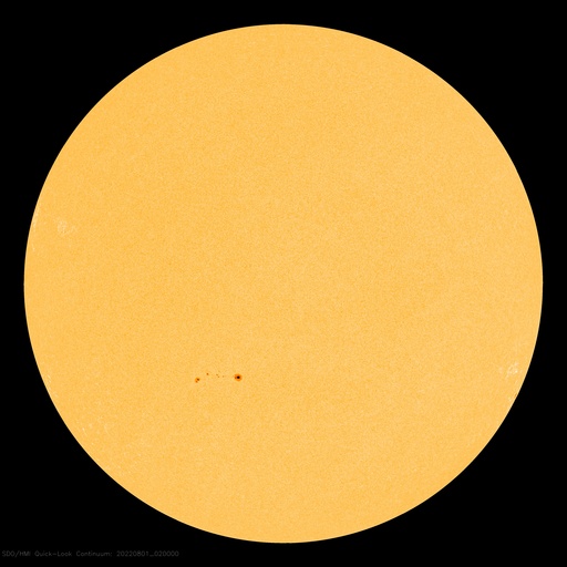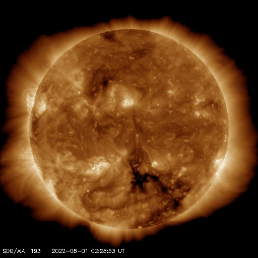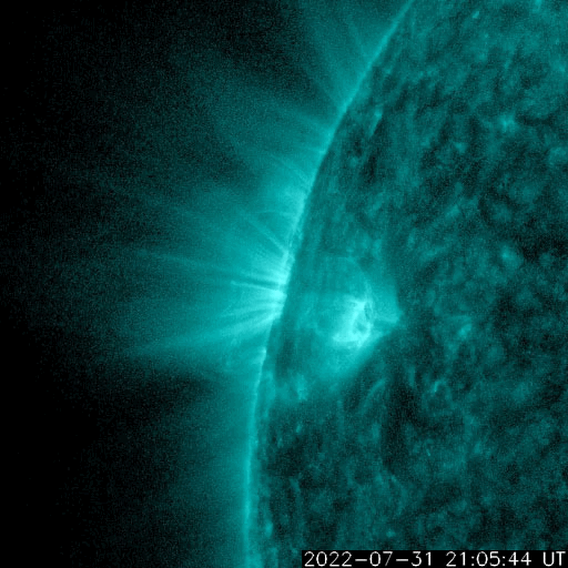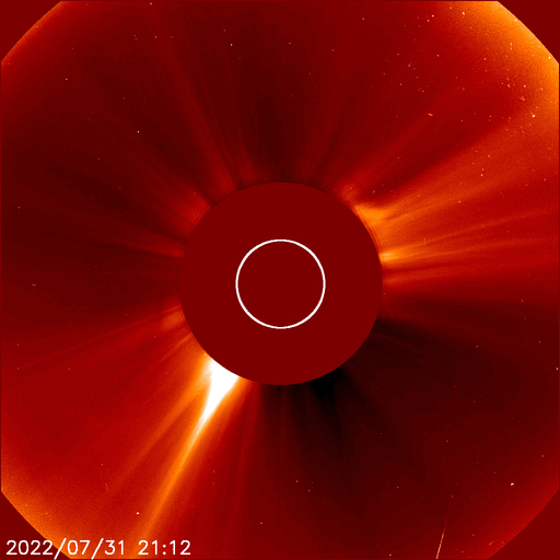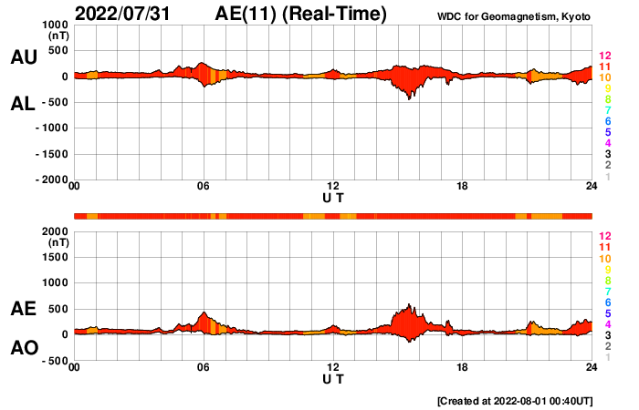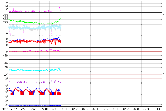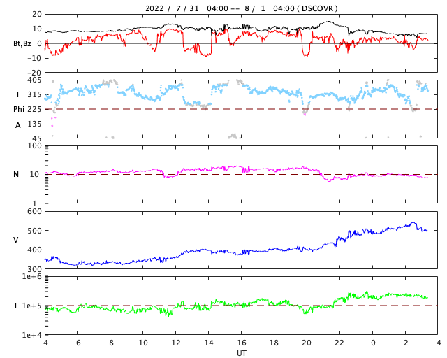 2022/ 8/ 1 12:31 更新 高速太陽風が始まりました。C9.3の小規模フレアが発生しました。 担当 篠原 昨日のニュースの後、 太陽風の速度は330km/秒へ下がりましたが、 夜になると400km/秒と平均的な速さに戻り、 そして、今朝、8月1日6時(世界時7月31日21時)頃から上昇を始め、 500km/秒に達して高速風に変わっています。 SDO衛星AIA193の太陽コロナ写真の南半球に見えていた コロナホールの影響が始まった様です。 太陽風の磁場強度は、昨夜以降10nTに高まり、 今朝の速度の高まり始めには、15nTまで強まりました。 その後は下がって、6〜7nTと平均的な状態にほぼ戻っています。 磁場の南北成分は、北寄りの傾向になっていて、 時々、南向きに変化する程度です。 AE指数のグラフは、基本的には静かで、 500nTに達するくらいの変化が数回発生した程度です。 SDO衛星AIA193では、南半球のコロナホールは、 最後の部分(薄暗い領域の左端の部分)が 太陽の中心線を超えるところです。 太陽風速度の高まりは、これから4日程度続くかもしれません。 今朝、1日7時半(世界時31日22時半)に、 北東の端(左上)の少し向こう側で、 C9.3と大きめの小規模フレアが発生しました。 SDO衛星AIA131の動画を掲載します。 フレアは、太陽の端を越えた輝きだけが見えています。 こちら側で発生していたら、Mクラスに達していたでしょうか。 SOHO衛星LASCO C2では、 太陽の左に向かって飛び出すCME(コロナ質量放出)が観測されています。 横方向の噴出なので、地球への影響はありません。 太陽では、この他に目立った活動はなく、 こちら側は穏やかな状態が続いています。
