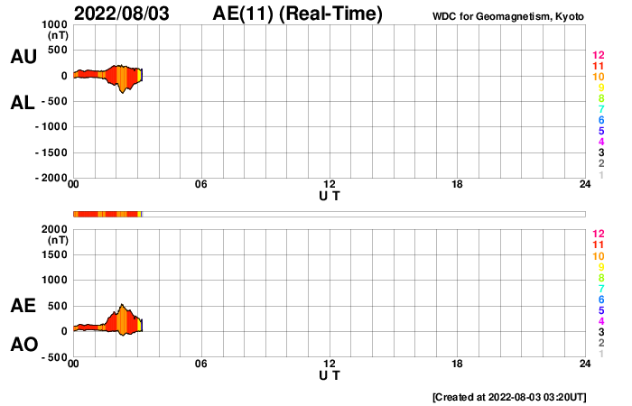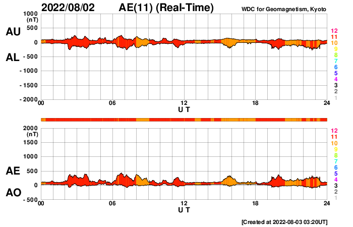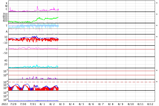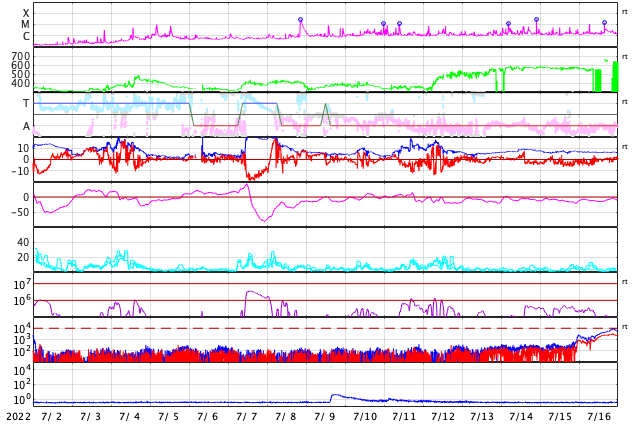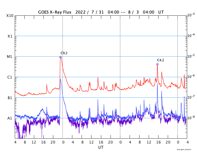 GOES衛星の太陽X線強度。赤・橙 = 0.1〜0.8 nm、青・紫 = 0.05〜0.4 nm (c) データ:NOAA/SWPC、作図:宇宙天気ニュース ![]() | ||||||||||||||||||||||||||||||||||||||||||||||||||||||||||||||||||||||||||||||||||||||||||||||||||||||||||||||||||||||||||||||||||||||||||||||||||||||||||||||||||||||||||||||||||||||||||||||||||||||||||||||||||||