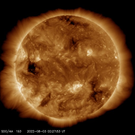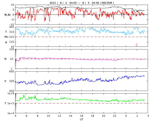 2022/ 8/ 3 12:31 更新 高速太陽風は、速度がもう一段高まっています。 担当 篠原 太陽風の速度は、昨夜から更に上昇を始め、 現在は550km/秒に達しています。 高速風は、より強まっています。 一方、磁場強度は、 今朝まで7〜8nTと少し強まった状態が続きましたが、 今朝くらいから低下が始まって、現在は4nTです。 磁場強度が下がってきたので、 速度の高まりはこの辺りがピークかもしれません。 磁場の南北成分は、比較的北寄りの状態で、 時々、南向きに変化しています。 このため、速度は高まっていますが、 磁気圏活動の高まりは限定的で、 AE指数は変化が頻繁に発生していますが、 300nTの小規模の変化に留まっています。 SDO衛星AIA193では、 南半球のコロナホールは、 南西の端(右下)にだいぶ近付いています。 太陽風速度の高まりは、終わりに向かいそうです。 太陽は、南西の端(右下)に沈んだ領域で、 今日未明に、C4.2、C1.7の小規模フレアが発生しました。 また、中心部南西側(右下)の3068黒点群で、 先ほど、3日11時半(世界時3日2時半)に、 C1.3と小さい小規模フレアが発生しています。 太陽は、全体としては穏やかな状態が続いています。 可視光写真では、南東の端(左下)に新しい黒点が現れていますが、 今のところ、特にフレアは起こしていません。 ![]() SDO衛星のAIA193カメラによる太陽コロナの様子 (c) SDO (NASA) ![]() SDO衛星による太陽の可視光写真。マウスの矢印を写真に重ねると、黒点番号付きの写真に切り替わります。 (c) SDO (NASA) ![]() DSCOVRが観測した太陽風の磁場(黒線は全体の強度、赤線は南北成分) 磁場の向き、プラズマの密度、速度、温度 (c) データ:NOAA/SWPC、作図:宇宙天気ニュース ![]() AE指数(速報値) 下段のAEグラフの値が高くなると、オーロラ活動が活発化しています。 (c) 京都大学WDC ![]() ![]() 27日の太陽周期に合わせた図 太陽が同じ面を地球に向けていた27日前の変化から、今後を予想することができます。 (c) 作図:宇宙天気ニュース