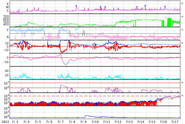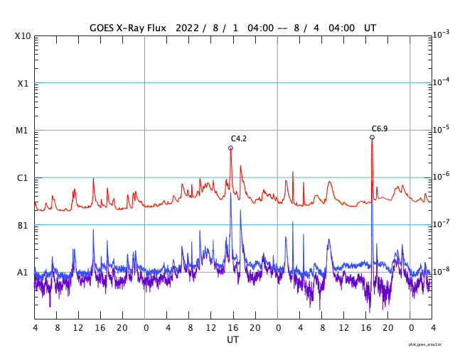 GOES衛星の太陽X線強度。赤・橙 = 0.1〜0.8 nm、青・紫 = 0.05〜0.4 nm (c) データ:NOAA/SWPC、作図:宇宙天気ニュース ![]() | ||||||||||||||||||||||||||||||||||||||||||||||||||||||||||||||||||||||||||||||||||||||||||||||||||||||||||||||||||||||||||||||||||||||||||||||||||||||||||||||||||||||||||||||||||||||||||||||||||||||||||||||||||||||||||