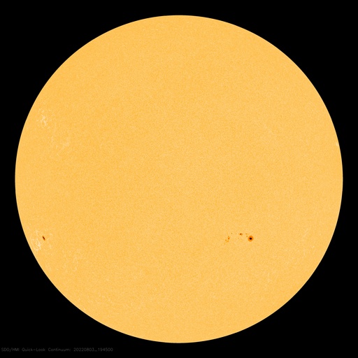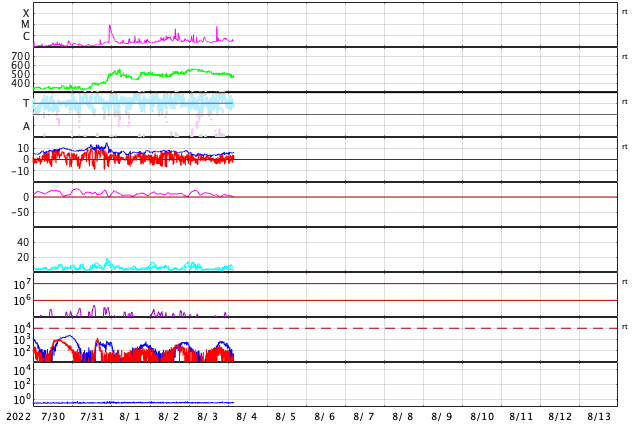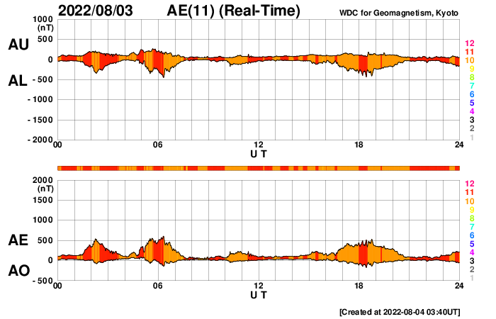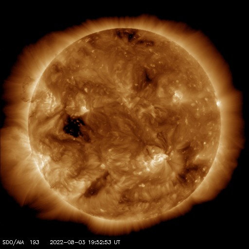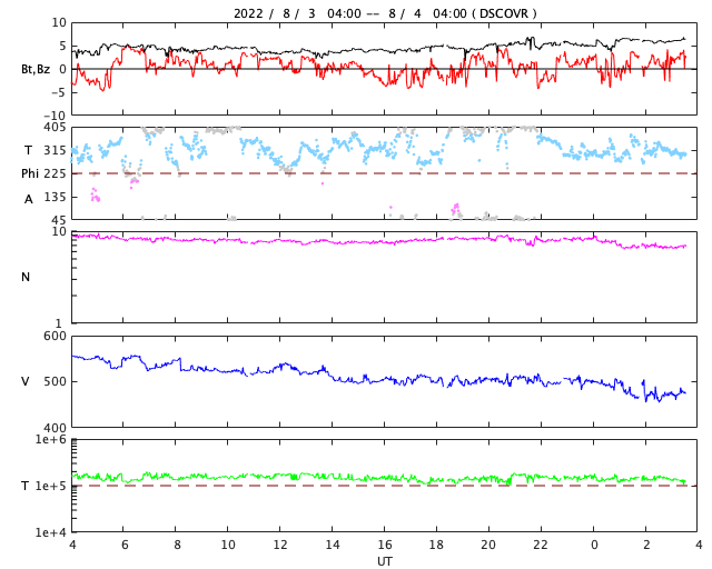 2022/ 8/ 4 12:46 更新 高速太陽風は終わりに近付いています。 担当 篠原 550km/秒に高まっていた太陽風の速度は、 昨日のニュース以降ゆっくりと下がって、 今朝には500km/秒台を割り、 現在は470km/秒とやや高速くらいになっています。 高速太陽風の領域は終わりを迎えている様です。 太陽風の磁場強度は、5〜6nTと平均的な状態です。 南北成分は、小幅ですが南北に変化しています。 AE指数は、500nTに達するくらいの変化が 時々発生しています。 太陽風の速度が下がってきたので、 この後の磁気圏は、より穏やかになりそうです。 SDO衛星AIA193では、 太陽の中心部の東側(左側)にコロナホールが見えています。 広がりはそれほど大きくありませんが、 赤道付近にあるので、 5日後くらいに太陽風速度の高まりがやって来るるかもしれません。 太陽は、南西(右下)の3068黒点群で、 今日未明、4日2時(世界時3日17時)に、 C6.9の小規模フレアが発生しています。 その他は、特に活動はありません。