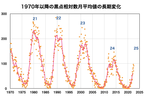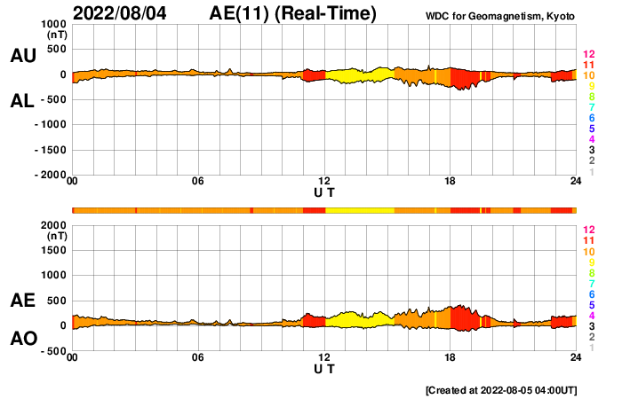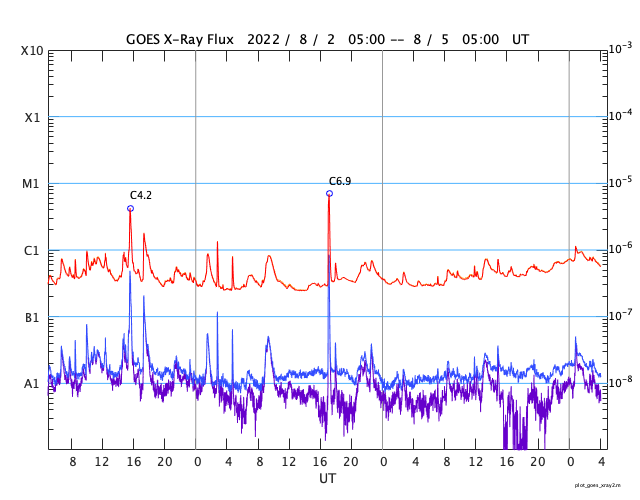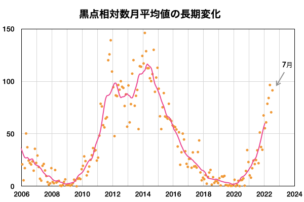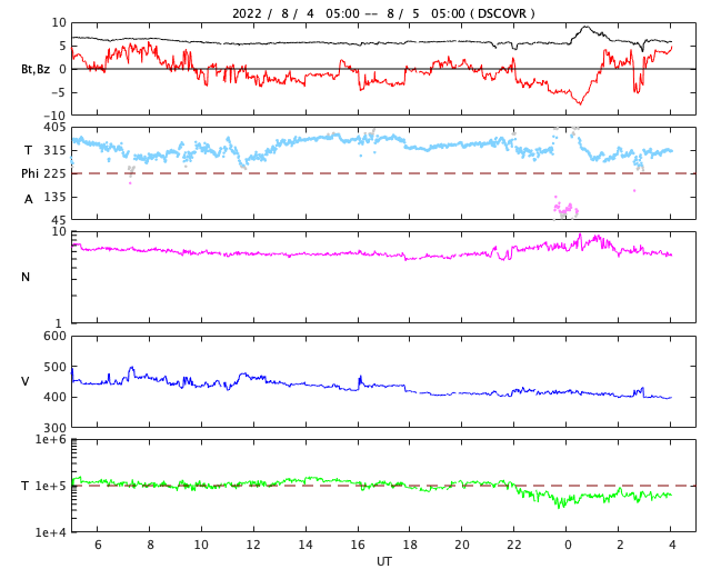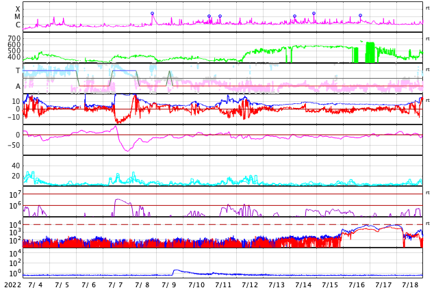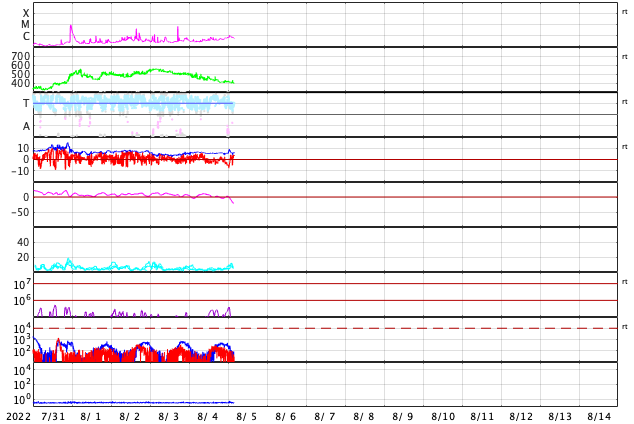 2022/ 8/ 5 13:11 更新 太陽風は平均的な状態です。7月の黒点相対数は 91.4 でした。 担当 篠原 WDC-SILSOより、7月の黒点相対数は 91.4 と発表されました。 5月の96.5から、6月は70.5と下がっていたのですが、 今回は90台に戻っています。 このところ、黒点の少ない日が続いていますが、 2枚目の動画を見ると、7月の中頃は黒点が多くなっていて、 7月10日から21日にかけて、 黒点相対数は100を超えていました(最大は16日の152)。 この高まりが、月平均値を高めたと言えそうです。 また、1枚目の図を見ると、黒点相対数は上下に変動しながらも、 極大に向かって高まる流れの中にあります。 前の周期の立ち上がり(2009年以降)を見ると、 始まって3年目の2012年に前半のピークを迎えています。 今期も2023年に同じタイミングを迎えますが、 これから、月平均値が100を超える様になっていくのでしょうか。 長期的な視点で注目してください。 今日の太陽は、X線グラフに目立つ変化はなく、 穏やかな状態です。 X線の全体の強度は次第に上がっていて、 これは、GOES衛星SUVI 195の南東(左下)や北東(左上)から 活動的な領域が近付いている影響の様です。 どの様な領域が現れるでしょうか。 現在、SDO衛星の画像の更新が停止しているため、 可視光写真は掲載していません。 太陽風は、速度が400km/秒まで下がり、 平均的な速度に戻っています。 磁場強度は、6nTと平均的な状態です。 磁場の南北成分は、グラフの後半で、 磁場強度の一時的な強まりとともに、 -7nTと南向きにやや強まる変化が発生しています。 AE指数では、この頃に700nTの中規模の変化が発生しています。 グラフの最後では、磁場は北向きに切り替わっているので、 磁気圏活動の高まりは一時的なもので終わりそうです。 GOES衛星SUVI 195の太陽コロナ写真では、 中心部の東寄り(左寄り)に、コロナホールが見えています。 この領域の影響は3〜4日後くらいでしょうか。 それまでは、太陽風は穏やかな状態が続きそうです。