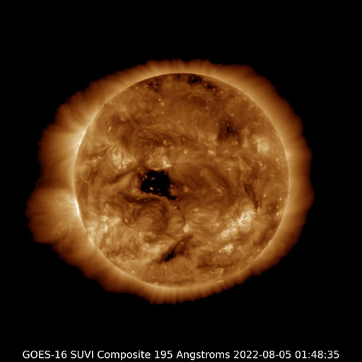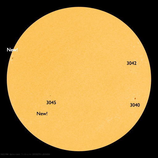 (c) 黒点データ:WDC-SILSO、作図:宇宙天気ニュース ![]() 7月の太陽黒点の推移。SDO衛星。 (c) SDO (NASA)、作図:宇宙天気ニュース ![]() 1970年以降の太陽黒点相対数の長期変化。 (c) 黒点データ:WDC-SILSO、作図:宇宙天気ニュース ![]() GOES衛星SUVI 195による太陽コロナの様子。 (c) GOES (NOAA) ![]() GOES衛星の太陽X線強度。赤・橙 = 0.1〜0.8 nm、青・紫 = 0.05〜0.4 nm (c) データ:NOAA/SWPC、作図:宇宙天気ニュース ![]() DSCOVRが観測した太陽風の磁場(黒線は全体の強度、赤線は南北成分) 磁場の向き、プラズマの密度、速度、温度 (c) データ:NOAA/SWPC、作図:宇宙天気ニュース ![]() AE指数(速報値) 下段のAEグラフの値が高くなると、オーロラ活動が活発化しています。 (c) 京都大学WDC ![]() ![]() 27日の太陽周期に合わせた図 太陽が同じ面を地球に向けていた27日前の変化から、今後を予想することができます。 (c) 作図:宇宙天気ニュース