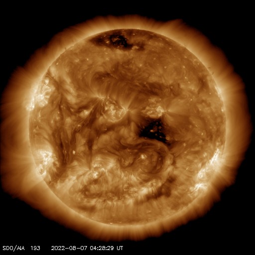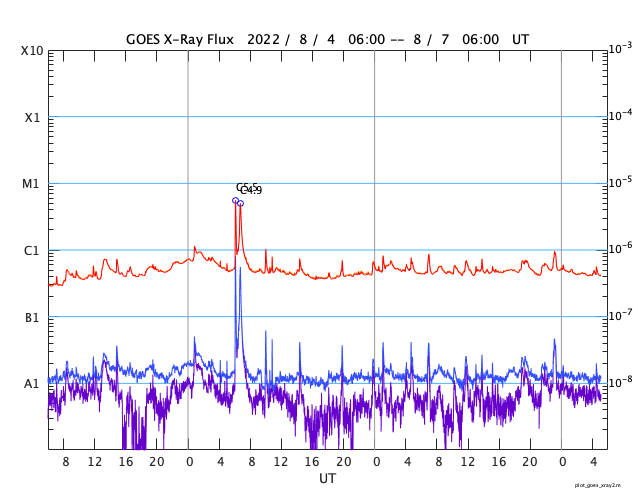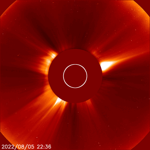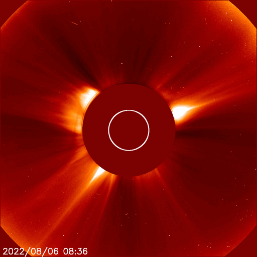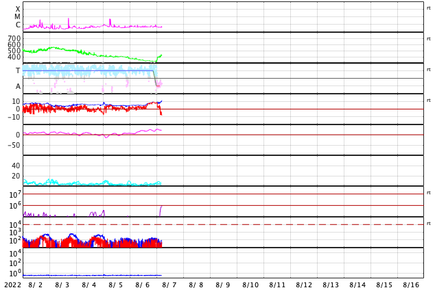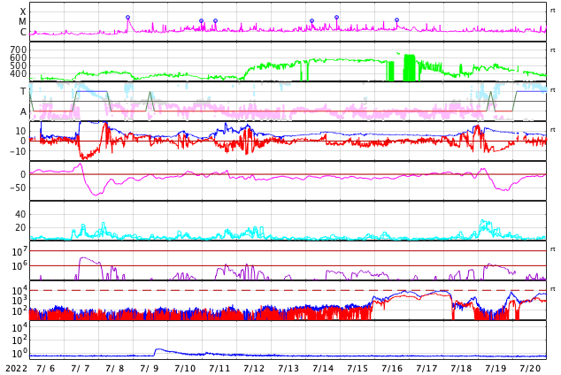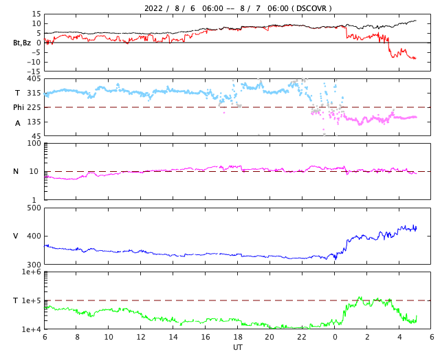 2022/ 8/ 7 14:19 更新 太陽の向こう側でCMEが発生しています。太陽風は平均的な速度に戻っています。 担当 篠原 昨日紹介したフィラメント噴出によるCME(コロナ質量放出)を SOHO衛星LASCO C2の1枚目の動画で紹介します。 昨日の動画で見えていたガスの飛び出しを、 そのまま延長させた様な見え方になっています。 地球への影響はないでしょう。 そして、昨夜、6日19時(世界時6日10時)頃に、 太陽の北東(左上)に向かうCMEが発生しています。 SOHO衛星の2枚目の動画で紹介します。 CMEが広がる様子から、 フィラメント噴出によるCMEではないかと思います。 しかし、太陽のこちら側では、 この時間帯に目立った変化は発生していません。 太陽の向こう側で発生した現象の様です。 青い写真のLASCO C3では、 太陽の右下に短い尾を伸ばした小さい彗星が見えていて、 太陽に向かって進んでいます。 また、写真の右端近くに見える星の集まりは、 かに座のプレセペ星団です。 太陽は、南西(右下)の3068、3072黒点群で、 Bクラスの小さいフレアが発生した程度で、 太陽のこちら側は穏やかです。 太陽風は、今朝にかけて速度がゆっくりと低下して、 320km/秒まで下がりましたが、 7日9時(世界時7日0時)頃から高まり始め、 現在は420km/秒と平均的な速度に戻っています。 一方、磁場強度は昨夜から上がり始めて、 現在は11nTに強まっています。 SDO衛星AIA193で太陽の中心部に見えていた コロナホールの影響が早めに始まっているのかもしれません。 この後の太陽風の変化に注目して下さい。 磁気圏は、ここまではとても穏やかで、 AE指数はほとんど変化のない状態です。 しかし、太陽風のグラフの最後では、 磁場が南向きにやや大きく変化しています。 このため、この後、磁気圏の活動がある程度高まりそうです。 ![]() 昨日のニュースで紹介したフィラメント噴出によるCME。SOHO衛星LASCO C2。 (c) SOHO (ESA & NASA)、 (動画加工 : 宇宙天気ニュース) ![]() 太陽の向こう側で発生したCME。SOHO衛星LASCO C2、C3。 (c) SOHO (ESA & NASA)、 (動画加工 : 宇宙天気ニュース) ![]() SDO衛星のAIA193カメラによる太陽コロナの様子 (c) SDO (NASA) ![]() SDO衛星による太陽の可視光写真。マウスの矢印を写真に重ねると、黒点番号付きの写真に切り替わります。 (c) SDO (NASA) ![]() GOES衛星の太陽X線強度。赤・橙 = 0.1〜0.8 nm、青・紫 = 0.05〜0.4 nm (c) データ:NOAA/SWPC、作図:宇宙天気ニュース ![]() DSCOVRが観測した太陽風の磁場(黒線は全体の強度、赤線は南北成分) 磁場の向き、プラズマの密度、速度、温度 (c) データ:NOAA/SWPC、作図:宇宙天気ニュース ![]() AE指数(速報値) 下段のAEグラフの値が高くなると、オーロラ活動が活発化しています。 (c) 京都大学WDC ![]() ![]() 27日の太陽周期に合わせた図 太陽が同じ面を地球に向けていた27日前の変化から、今後を予想することができます。 (c) 作図:宇宙天気ニュース