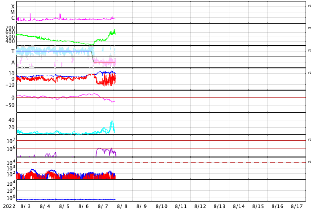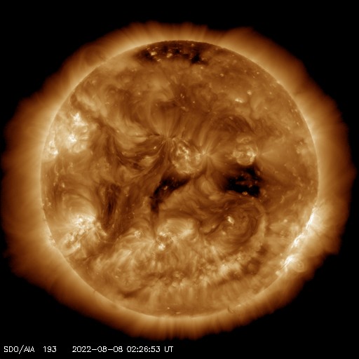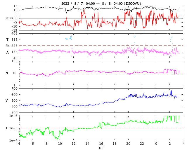 2022/ 8/ 8 12:36 更新 太陽コロナの立体視画像を作りました。太陽風は高速になっています。 担当 篠原 太陽を地球よりも左斜めから観測しているSTEREO Ahead衛星は、 日々地球に近付いていて、 現在の地球との開きは22度と、 横から観測する利点はだいぶ小さくなってしまいました。 一方、地球との視差が小さくなってきたので、 SDO衛星と組み合わせて太陽の立体視画像を作ってみました。 1枚目の動画は、左にSDO衛星AIA193、 右にSTEREO Ahead衛星SUVI 195と、 白黒に変換した画像を組み合わせたもので、 立体視の交差法、左の太陽を右目で、右の太陽を左目で見て下さい。 目を寄り目にして、太陽が1つに重なるように視線を調節します。 (太陽が3つに見えるとも言えそうです) 掲載しているのは、横幅を 800 pixel にした動画です。 大きい画像の方が細部が良く分かりますが、目には負担がかかります。 3種類の動画ファイルを作りましたので、見やすい画像をご覧下さい。 800幅の動画 (11MB) (下に表示している画像です) 1200幅の動画 (22MB) 1600幅の動画 (34MB) 掲載している太陽は、7月15日の1日分です。 中心部北側(上側)のフィラメント噴出の様子や、 東側(左側)の活動領域の活動、コロナのガスの立体的な構造など、 太陽の様子が立体的に感じられます。 現在の太陽は、南西の端(左下)の3072群でC1.1、 3068群でC1.6の小規模フレアが発生した程度で、 穏やかな状態です。 太陽風は、今日未明から速度が更に高まって、 現在は570km/秒前後の高速風になっています。 コロナホールの影響がより強まって来た様です。 太陽風の磁場強度は、 10〜14nTに強まった状態で推移しています。 速度は高まっていますが、磁場強度は強まったままなので、 引き続き速度の変化に注目してください。 太陽風磁場の南北成分は、 昨日までは南向きに強まった状態が続き、 以降は、南北に変化する様に傾向が変わっています。 AE指数は、昨日のニュース以降は 700〜1000nTと中規模の活動が連続しています。 磁場の南向きの傾向が弱まって来たので、 この後の活動は下がるかもしれません。 SDO衛星AIA193の太陽コロナ写真を見ると、 中心部に次のコロナホールが見えています。 広がりは小さいですが、この領域の影響も考えると、 太陽風速度の高まりは、これから4〜5日続くかもしれません。 ![]() 2022年7月15日の(左)SDO衛星AIA193、(右)STEREO Ahead衛星SUVI 195の画像を組み合わせて立体視する動画。 (c) STEREO (NASA)、SDO (NASA)、作図:宇宙天気ニュース ![]() SDO衛星のAIA193カメラによる太陽コロナの様子 (c) SDO (NASA) ![]() SDO衛星による太陽の可視光写真。マウスの矢印を写真に重ねると、黒点番号付きの写真に切り替わります。 (c) SDO (NASA) ![]() GOES衛星の太陽X線強度。赤・橙 = 0.1〜0.8 nm、青・紫 = 0.05〜0.4 nm (c) データ:NOAA/SWPC、作図:宇宙天気ニュース ![]() DSCOVRが観測した太陽風の磁場(黒線は全体の強度、赤線は南北成分) 磁場の向き、プラズマの密度、速度、温度 (c) データ:NOAA/SWPC、作図:宇宙天気ニュース ![]() AE指数(速報値) 下段のAEグラフの値が高くなると、オーロラ活動が活発化しています。 (c) 京都大学WDC ![]() ![]() 27日の太陽周期に合わせた図 太陽が同じ面を地球に向けていた27日前の変化から、今後を予想することができます。 (c) 作図:宇宙天気ニュース