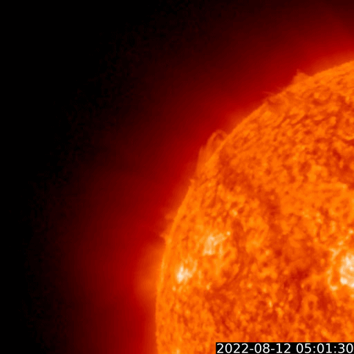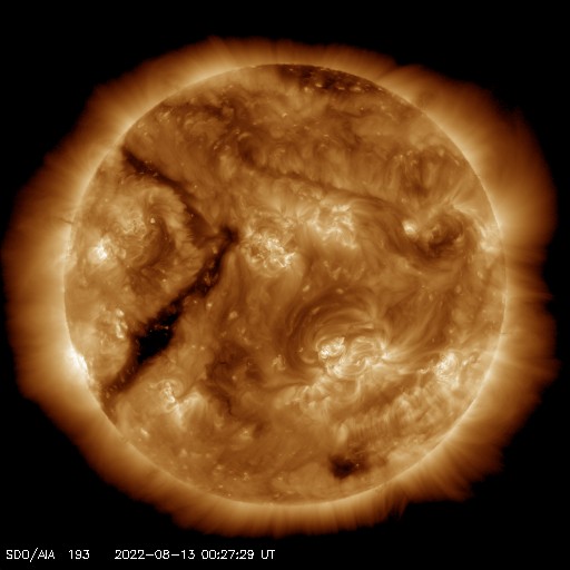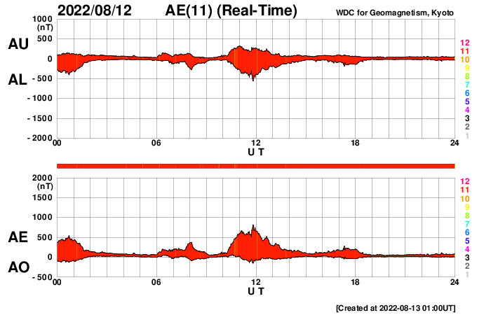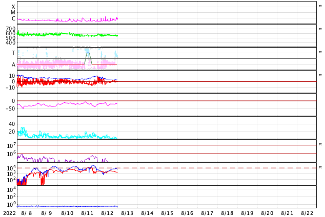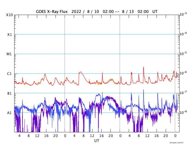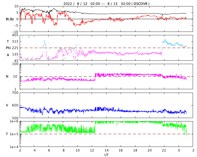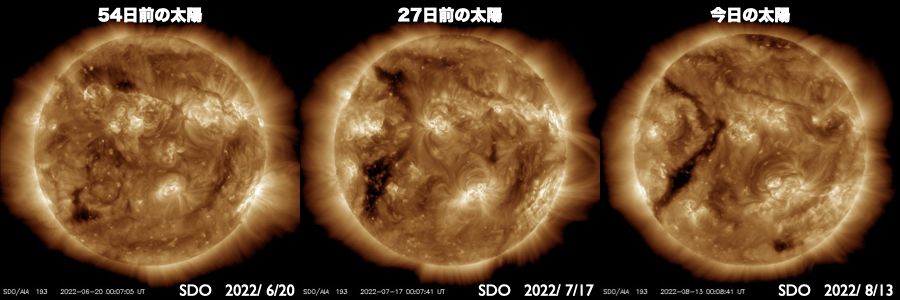 2022/ 8/13 10:20 更新 太陽でC1〜2のフレアが発生しています。太陽風は高速の状態が続いています。 担当 篠原 昨夕から夜にかけて、 太陽の北東の端(左上)でプロミネンスの噴出が発生しました。 きれいに見えていたので、 GOES衛星SUVI 304の動画を掲載します。 地球への影響はありません。 太陽では、中心部北側の3076黒点群と、 昨日から見え始めた 中心部南側の3079黒点群の活動が少し高まっていて、 C1台の小規模フレアが5回と、 その他にも小さい活動が頻繁に発生しています。 特に3079群は、これからどのように変化するか注目して下さい。 1日間のフレアとしては、 3077群で発生したC2.1の小規模フレアが最大です。 太陽では、あちこちで新しい黒点が出現しています。 フレアの発生も増えるでしょうか。 太陽風は、550km/秒の高速の風が続いています。 8日に始まった高速風は、6日目に入っています。 SDO衛星AIA193では、 コロナホールは西の端に達しています。 太陽風速度の高まりはどこまで続くでしょうか。 太陽風の磁場強度は、4nTに下がっています。 南北成分は、途中で南を向いた以外は、 0nT付近か北向きの傾向です。 このため、AE指数も途中に700nTの中規模の変化がありますが、 その他では変化は小さく、現在の磁気圏は穏やかです。 SDO衛星AIA193の太陽コロナ写真では、 東側(左側)に ">" の様に縦に伸びるコロナホールが見えています。 前の周期の画像と比べると(2枚目の写真)、 2周期前(54日前)は、南北に小さい広がりがあるだけでしたが、 1周期前(27日前)には、縦に広がりが大きくなり、 今回、赤道でしっかり繋がった様に見えています。 27日周期の図を見ると、 前周期は7月22日に太陽風速度の高まりが始まっています。 これを現在のグラフに対応させると、8月18日に相当しますが、 実際にはどの様な変化になるでしょうか。 放射線帯の高エネルギー電子は、 今日は少し下がっていて、どちらのグラフも1万を割っています。 ![]() 太陽の北西の端で発生したプロミネンス噴出。GOES衛星SUVI 304。 (c) GOES (NOAA)、(動画加工 : 宇宙天気ニュース) ![]() 2周期前(54日前)、1周期前(27日前)、現在のコロナホールの様子。SDO衛星AIA193。 (c) SDO (NASA)、作図:宇宙天気ニュース ![]() SDO衛星のAIA193カメラによる太陽コロナの様子 (c) SDO (NASA) ![]() SDO衛星による太陽の可視光写真。マウスの矢印を写真に重ねると、黒点番号付きの写真に切り替わります。 (c) SDO (NASA) ![]() GOES衛星の太陽X線強度。赤・橙 = 0.1〜0.8 nm、青・紫 = 0.05〜0.4 nm (c) データ:NOAA/SWPC、作図:宇宙天気ニュース ![]() DSCOVRが観測した太陽風の磁場(黒線は全体の強度、赤線は南北成分) 磁場の向き、プラズマの密度、速度、温度 (c) データ:NOAA/SWPC、作図:宇宙天気ニュース ![]() AE指数(速報値) 下段のAEグラフの値が高くなると、オーロラ活動が活発化しています。 (c) 京都大学WDC ![]() ![]() 27日の太陽周期に合わせた図 太陽が同じ面を地球に向けていた27日前の変化から、今後を予想することができます。 (c) 作図:宇宙天気ニュース