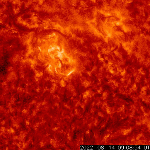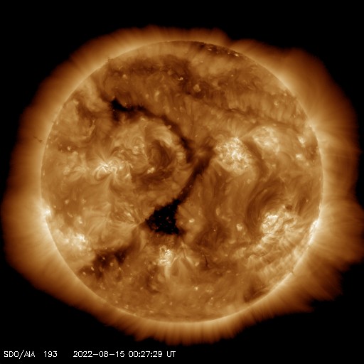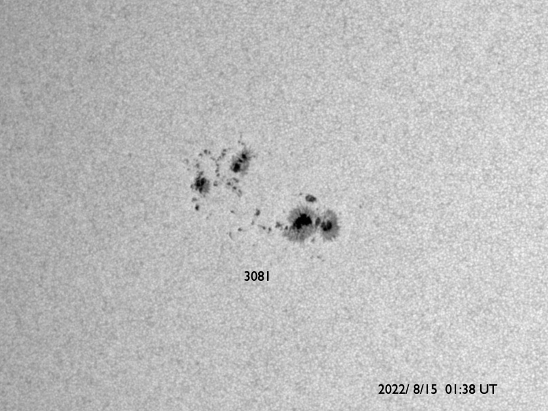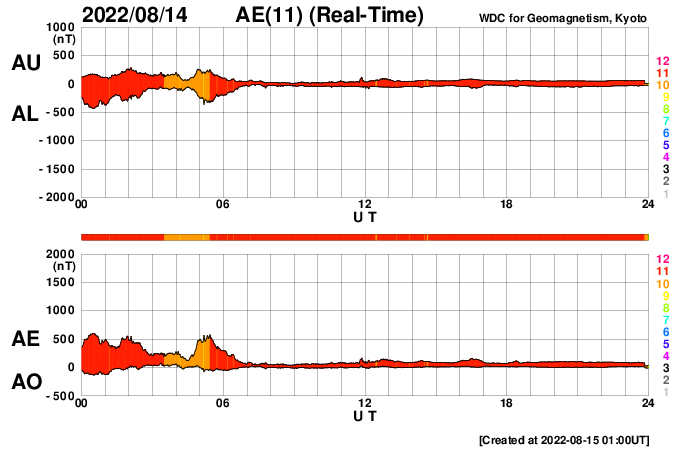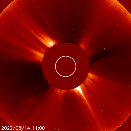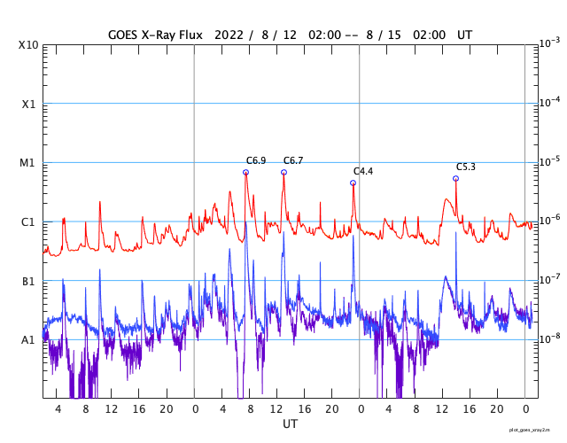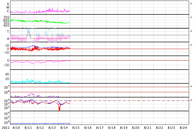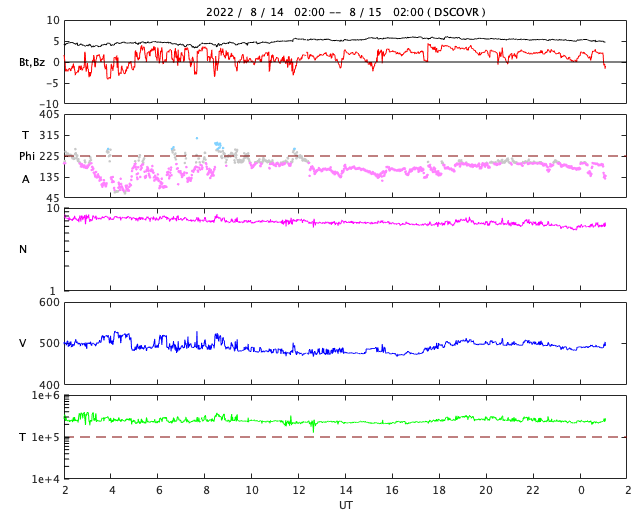 2022/ 8/15 10:18 更新 フィラメント噴出によりCMEが発生しています。太陽風はやや高速です。 担当 篠原 昨夜、14日20時半(世界時14日11時半)頃に、 太陽の中心部でフィラメント噴出が発生しました。 SDO衛星AIA304の動画を掲載します。 暗い筋状に見えていたダークフィラメントが、 右下へ向かって勢い良く飛び出しています。 この噴出はCME(コロナ質量放出)となって、 SOHO衛星LASCO C2、C3のコロナグラフで観測されています。 フィラメントの噴出の方向と同じく、 右下を中心に太陽を丸く囲むようにコロナのガスが広がっています。 発生地点が太陽の中心に近いので、 飛び出したガスは地球へも向かっていると思われます。 到来まで2〜3日程度と考えると、 明日、16日の夜から17日にかけてではないでしょうか。 (日付の記述に誤りがありました。訂正しています。) 現在、コロナホールが太陽の中心付近にあり、 ここから噴き出している高速太陽風に重なる形で到来しそうです。 磁場の強まりが到来して南向きに大きく変化すると、 速度の高まりと重なって、磁気圏活動が激しくなる可能性があります。 注目してください。 また、太陽のあちこちでCクラスの小規模フレアが発生しています。 最大のフレアは、 3079黒点群で、昨夜、14日23時(世界時14日14時)に発生したC5.3で、 その他は、C1〜2の小さい規模が10回ほど、 3076、3078、3079、3081群と、 あちこちの黒点群で発生しています。 黒点としては、東側(左側)の3081群が少し大きくなっています。 SDO衛星による拡大写真を掲載します。 この後、どの様に変化するでしょうか。 太陽風は、速度の低下は小さく、 480〜490km/秒とやや高速の状態で推移しています。 磁場強度は、5〜6nTと平均的な状態です。 SDO衛星AIA193の太陽コロナ写真では、 ">" の形をしたコロナホールが太陽の中心線を越えています。 このまま、この領域の影響に繋がっていくのでしょうか。 磁場の南北成分は、 昨日のフレア以降北寄りの傾向になっています。 このため、磁気圏の活動は穏やかになり、 AE指数は変化が見られない状態です。 放射線帯の高エネルギー電子は、少し減少して、 今日は1万の線を割っています。