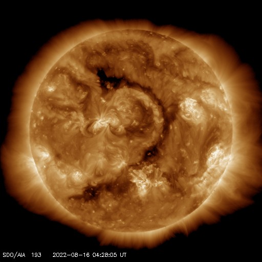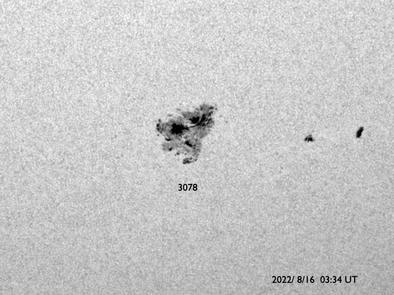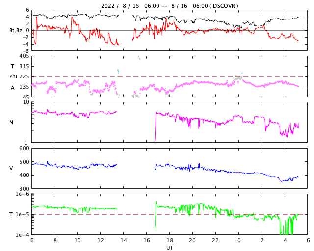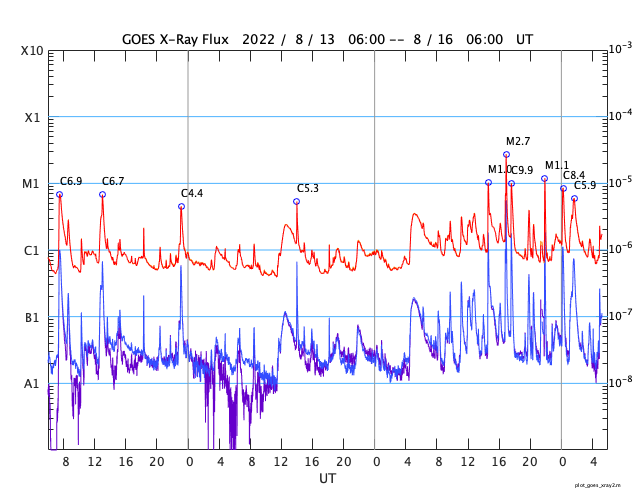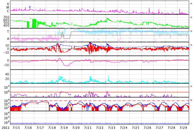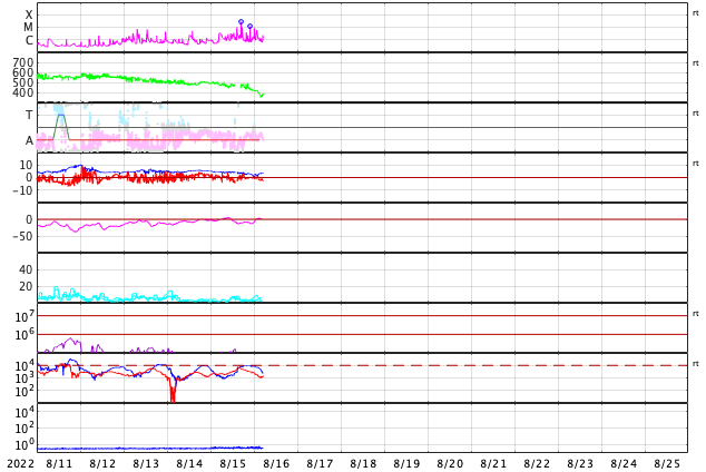 2022/ 8/16 14:22 更新 Mクラスの中規模フレアが3回発生しました。太陽風はやや低速になっています。 担当 篠原 昨日のニュース以降、 太陽の南側の3078黒点群の活動が活発になり、 15日23時半(世界時15日14時半)にM1.0、 16日1時半(世界時15日16時半)にM2.7、 16日7時(世界時15日22時)にM1.1と、 Mクラスの中規模フレアが3回発生しています。 Mクラスのフレアの発生は、 世界時7月16日のM1.4以来で、ほぼ1か月ぶりです。 3078群は、この他にも、 C2.6、C3.1、C3.9、C8.4、C5.9など、 Cクラスの小規模フレアをいくつも起こしています。 この様子を、SDO衛星AIA131の動画で紹介します。 どの爆発がどのフレアか、対応させるのも大変です。 3078群は、黒点もより大きく、複雑になっています。 SDO衛星による拡大写真を掲載します。 この領域の活動に、今後も注目してください。 太陽では、昨日の昼、15日13時(世界時15日4時)に、 太陽の南西側(右下)でフィラメント噴出が発生しています。 GOES衛星SUVI 304の動画を掲載します。 太陽の右下に向かって、コロナのガスが噴出しています。 この噴出によるCME(コロナ質量放出)の様子を、 SOHO衛星LASCO C2、C3の動画で紹介します。 この動画では、15日22時(世界時15日13時)以降にも、 次々とCMEが飛び出しています。 これは、3078群や南西側の領域で発生した活動によるものです。 これらのCMEは、地球に対しては斜め方向の噴出で、 影響は小さいものに留まりそうです。 そして、今日の昼、16日11時(世界時16日2時)に 3078黒点群で発生したC5.9の小規模フレアの時に、 GOES衛星SUVI 304では、 コロナのガスが噴出する様子が見えています。 これもCMEとなっている様です。 太陽が一気ににぎやかになっています。 引き続き注目してください。 太陽風は、昨日のニュース以降はゆっくりと速度が下がり、 今朝、400km/秒台を割って、 現在は370km/秒とやや低速の状態になっています。 磁場強度は、5nTから一旦2nTに下がり、 現在は4nTくらいに戻っています。 磁気圏は概ね静穏で、 AE指数は、500nTの中規模の変化が1回発生した程度で、 その他は変化がありません。 SDO衛星AIA193では、 北半球から南半球へ、 コロナホールが大きく曲がりながら伸びています。 明日くらいからこの領域の影響で、 太陽風の速度が再び高まる可能性があります。 また、昨日お知らせした、 14日夜のフィラメント噴出による太陽風の乱れが、 今夜から明日にかけて到来する可能性があります。 高速風の立ち上がりと重なって、 変化が分かりにくくなるかもしれません。 太陽風磁場の強まりや、南向きの変化に注目してください。