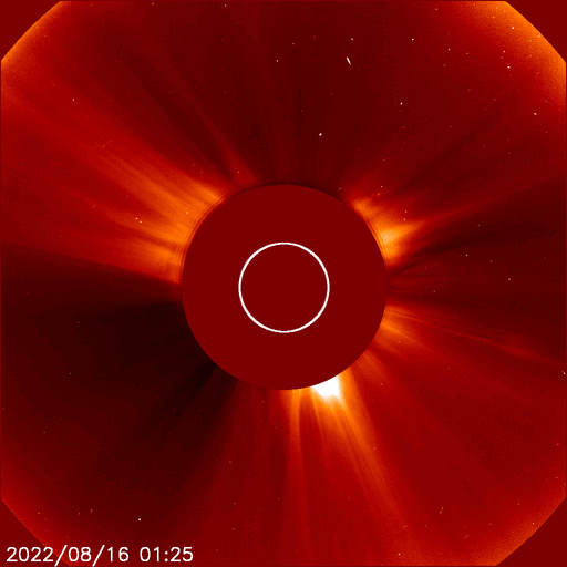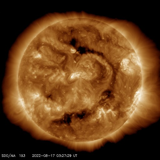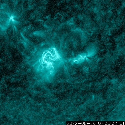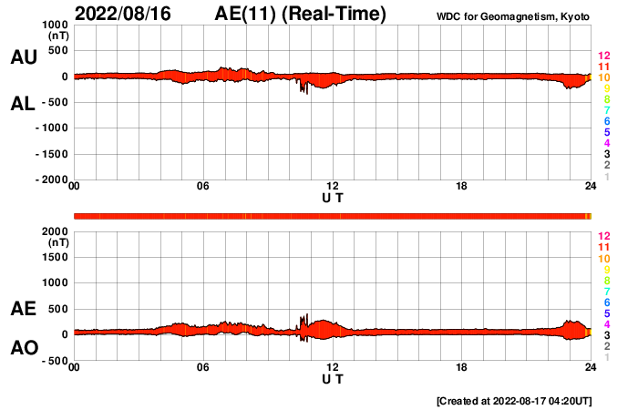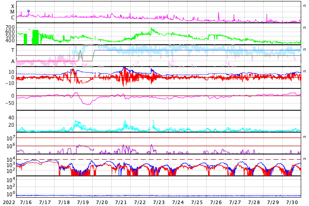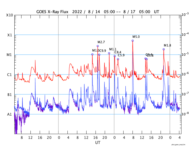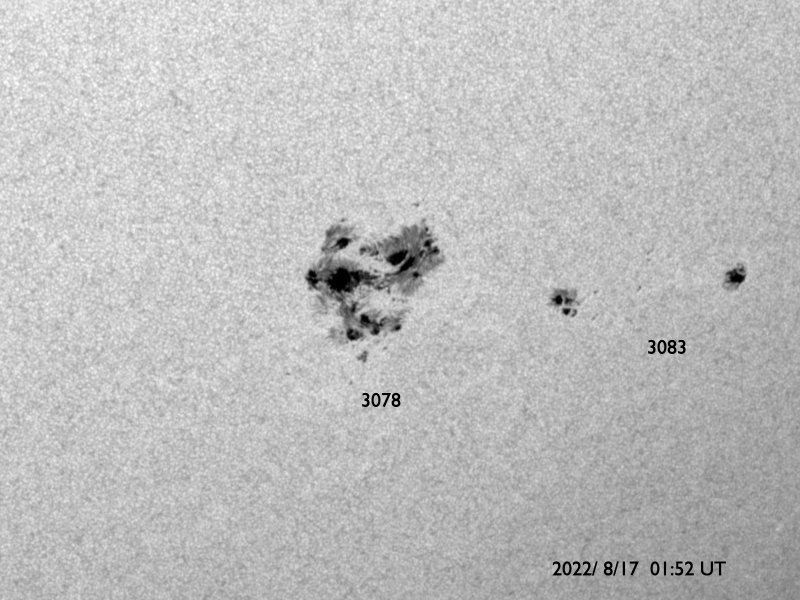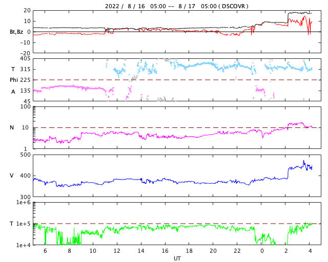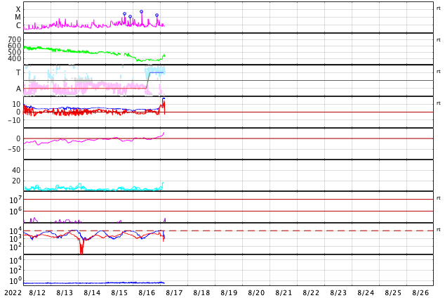 2022/ 8/17 13:27 更新 M5.0、M1.8の中規模フレアが発生しました。太陽風の乱れが到来しています。 担当 篠原 昨日のニュース以降も、 太陽の南側の3078黒点群の活動は続き、 昨夕、16日17時(世界時16日8時)には、 M5.0の中規模フレアが発生しました。 M5に達するフレアの発生は、 5月19日のM5.6以来で、3か月ぶりです。 3078群の活動は更に続き、 16日22〜23時(世界時16日13〜14時)には、 C6.4、C5.8と大きめの小規模フレアが、 そして、今朝、17日6時(世界時16日21時)には、M1.8と、 3078群として5回目になる中規模フレアが発生しています。 M5.0からM1.8にかけての活動の様子を、 SDO衛星AIA131の動画で紹介します。 3078群の左側と右側で次々にフレアが起きる様子が印象的です。 SDO衛星による3078群の拡大写真を2枚目に掲載します。 黒点群は複雑な状態を保っています。 この後もフレアの発生に注目してください。 昨日のニュースで紹介した、 16日11時(世界時16日2時)頃のコロナの噴出による CME(コロナ質量放出)の様子を、 SOHO衛星LASCO C2、C3の動画で紹介します。 太陽の下に向かって噴出しており、 地球への影響は特に見られないのではないでしょうか。 太陽風は、DSCOVR衛星で先ほど、 17日11時(世界時17日2時)に、 速度が390km/秒から440km/秒へ、 磁場強度が9nTから18nTへ急に高まる変化が到来しています。 磁場は強まっていますが、速度は平均的な状態に留まっています。 14日の夜に発生したフィラメント噴出による太陽風の乱れが 到来したのではないでしょうか。 その場合、地球まで2日半ほどでやって来たことになります。 現在、磁場の南北成分は北向きに強まっています。 この状態では、磁気圏の活動は強まらないでしょう。 今後、磁場が南向きに切り替わって強まって行くと、 磁気圏の活動も活発になる可能性があります。 その頃に速度が高速になっているかどうか注目してください。 ここまでのAE指数は、特に大きな変化はなく、 磁気圏は穏やかです。 SDO衛星AIA193の太陽コロナ写真では、 大きく曲がって見えるコロナホールの先頭(右端)は、 太陽の西半球の半分程度まで進んでいます。 この領域の影響が始まる目安の位置に達しています。 ![]() M5.0からM1.8にかけて、3078黒点群のフレアの様子。SDO衛星AIA131。 (c) SDO (NASA)、(動画加工 : 宇宙天気ニュース) ![]() 3078黒点群の拡大写真。SDO衛星。 (c) SDO (NASA)、作図:宇宙天気ニュース ![]() 16日の昼に発生したCMEの様子。SOHO衛星LASCO C2、C3。 (c) SOHO (ESA & NASA)、 (動画加工 : 宇宙天気ニュース) ![]() SDO衛星のAIA193カメラによる太陽コロナの様子 (c) SDO (NASA) ![]() SDO衛星による太陽の可視光写真。マウスの矢印を写真に重ねると、黒点番号付きの写真に切り替わります。 (c) SDO (NASA) ![]() GOES衛星の太陽X線強度。赤・橙 = 0.1〜0.8 nm、青・紫 = 0.05〜0.4 nm (c) データ:NOAA/SWPC、作図:宇宙天気ニュース ![]() DSCOVRが観測した太陽風の磁場(黒線は全体の強度、赤線は南北成分) 磁場の向き、プラズマの密度、速度、温度 (c) データ:NOAA/SWPC、作図:宇宙天気ニュース ![]() AE指数(速報値) 下段のAEグラフの値が高くなると、オーロラ活動が活発化しています。 (c) 京都大学WDC ![]() ![]() 27日の太陽周期に合わせた図 太陽が同じ面を地球に向けていた27日前の変化から、今後を予想することができます。 (c) 作図:宇宙天気ニュース