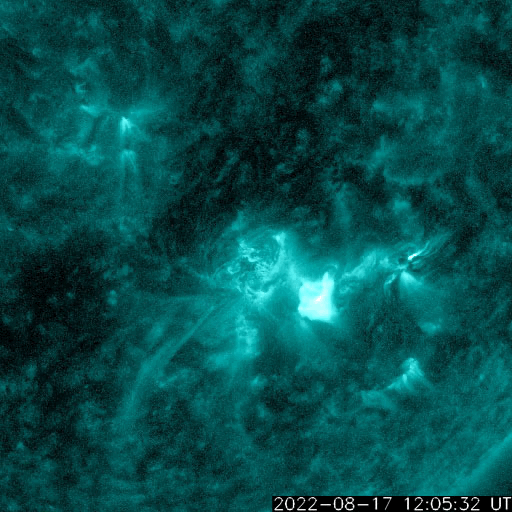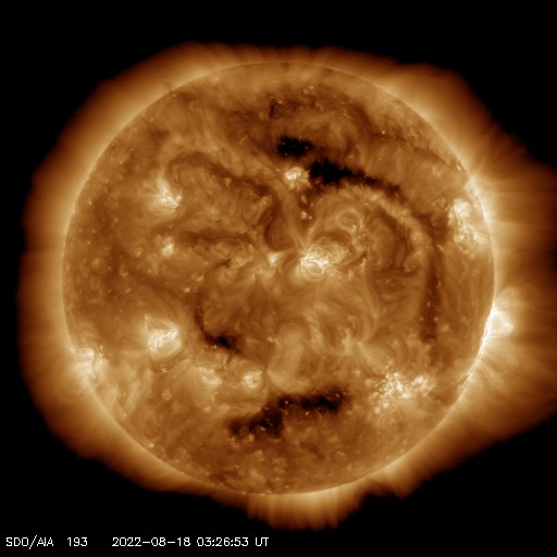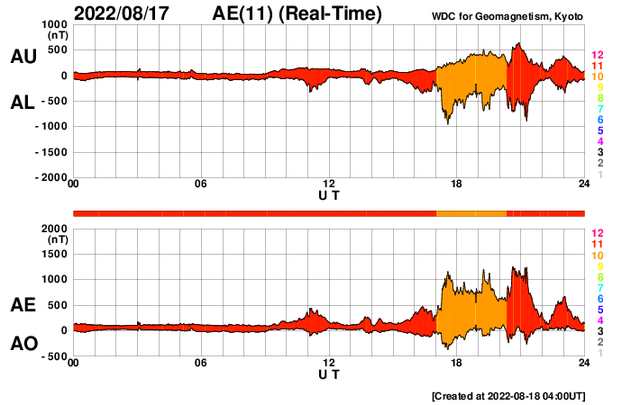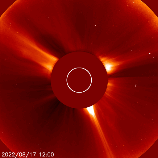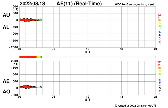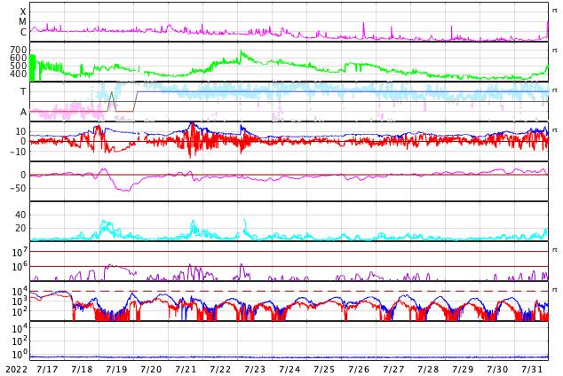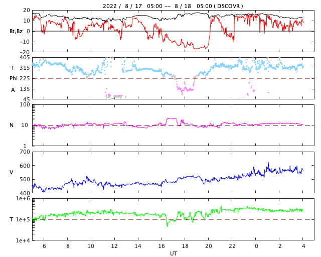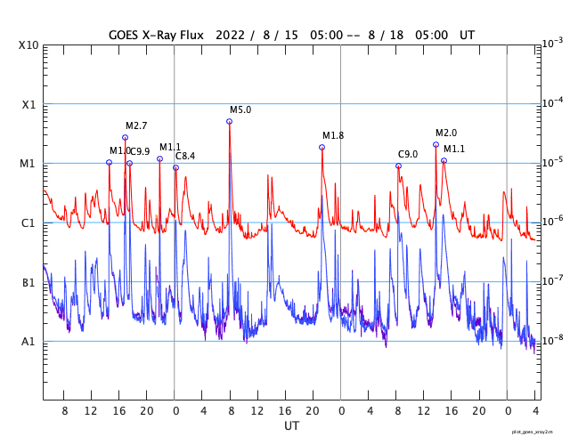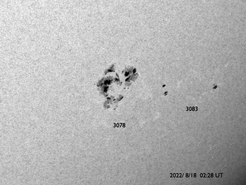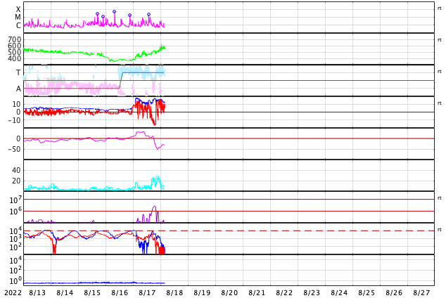 2022/ 8/18 13:13 更新 Mクラスのフレアが2回発生しました。太陽風の速度は570km/秒に高まっています。 担当 篠原 太陽の南西側(右下)の3078黒点群の活動が続いています。 昨日は、17日17時(世界時17日8時)に、 C9.0と大きい小規模フレアが発生し、 17日22時半(世界時17日13時半)にM2.0、 17日23時半(世界時17日14時半)にM1.0と、 中規模フレアが連続して発生しています。 2つのMフレアの様子を、 SDO衛星AIA131の動画(青緑の写真)で紹介します。 初めに領域の上側で輝きが発生し、 それが下に伸びて行って次の爆発に繋がっています。 また、活動の様子をSDO衛星AIA304(赤色の写真)で見ると、 Mフレアの直前に、 3078群の右の領域でフィラメント噴出が発生しています。 そして、それを追いかけるように、 Mフレアに伴ってコロナのガスの噴出が 3078群の領域から発生しています。 この噴出により、CME(コロナ質量放出)が発生しています。 SOHO衛星LASCO C2、C3の動画を見ると、 右側のフィラメント噴出のCMEが少し先に現れて、 Mフレアの噴出が重なるように広がって行く様に見えます。 地球に対しては、斜め方向の噴出になっているので、 影響は到来しても小さいのではないかと思います。 3078群は、その後はC1〜3の小さい小規模フレアが発生した程度です。 活動は落ち着いて行くのでしょうか。 太陽では、北西(左上)の3082群でも C1〜3の小規模フレアが度々発生しています。 太陽風は、今日の未明から速度が上がり始め、 現在は570km/秒と高速の状態です。 コロナホールの影響が強まって来た様です。 太陽風の磁場強度は、10〜18nTの間を上下していて、 強まった状態です。 グラフの最後は12nTになっていますが、 速度が高まったので、 磁場強度は次第に下がっていくかもしれません。 磁場の南北成分は、北寄りの傾向が続いていたのですが、 18日1時(世界時17日16時)から18日5時(世界時17日20時)にかけて、 最大で -17nTに達する強い南向きの磁場が到来しました。 速度が500km/秒程度に高まっていたこともあり、 磁気圏の活動は一時的に強まって、 AE指数は、最大で1200nTに達する大きい変化が、 4時間ほど発生しています。 その後は、磁場は北向きに切り替わり、 AE指数も変化はなくなっています SDO衛星AIA193では、 コロナホールは南北の中緯度域に見えています。 この領域の影響が及ぶ4〜5日後くらいまで、 太陽風の速度は高まった状態が続くかもしれません。 ![]() 3078黒点群で発生したM2.0、M1.0のフレアの様子。SDO衛星AIA131、304。 (c) SDO (NASA)、(動画加工 : 宇宙天気ニュース) ![]() 太陽の下側にCMEが広がっています。SOHO衛星LASCO C2、C3。 (c) SOHO (ESA & NASA)、 (動画加工 : 宇宙天気ニュース) ![]() 3078黒点群の拡大写真。SDO衛星。 (c) SDO (NASA)、作図:宇宙天気ニュース ![]() SDO衛星のAIA193カメラによる太陽コロナの様子 (c) SDO (NASA) ![]() SDO衛星による太陽の可視光写真。マウスの矢印を写真に重ねると、黒点番号付きの写真に切り替わります。 (c) SDO (NASA) ![]() GOES衛星の太陽X線強度。赤・橙 = 0.1〜0.8 nm、青・紫 = 0.05〜0.4 nm (c) データ:NOAA/SWPC、作図:宇宙天気ニュース ![]() DSCOVRが観測した太陽風の磁場(黒線は全体の強度、赤線は南北成分) 磁場の向き、プラズマの密度、速度、温度 (c) データ:NOAA/SWPC、作図:宇宙天気ニュース ![]() AE指数(速報値) 下段のAEグラフの値が高くなると、オーロラ活動が活発化しています。 (c) 京都大学WDC ![]() ![]() 27日の太陽周期に合わせた図 太陽が同じ面を地球に向けていた27日前の変化から、今後を予想することができます。 (c) 作図:宇宙天気ニュース