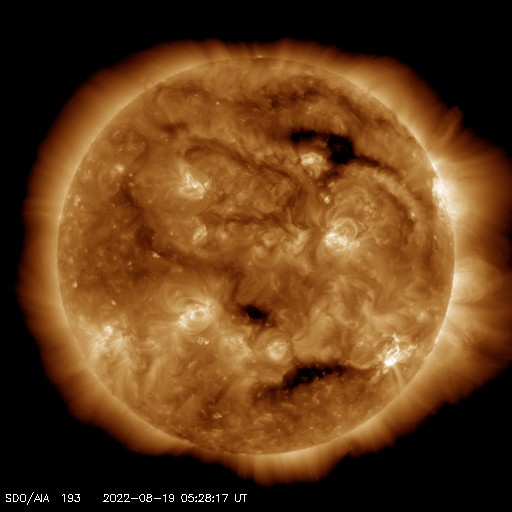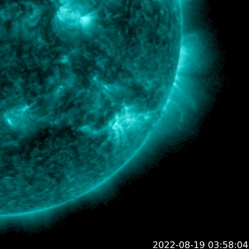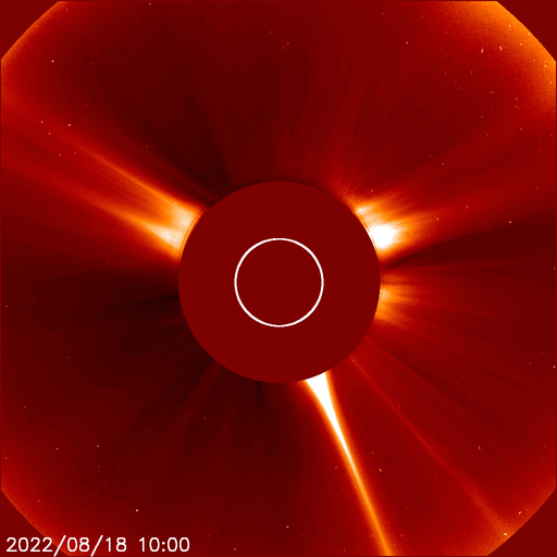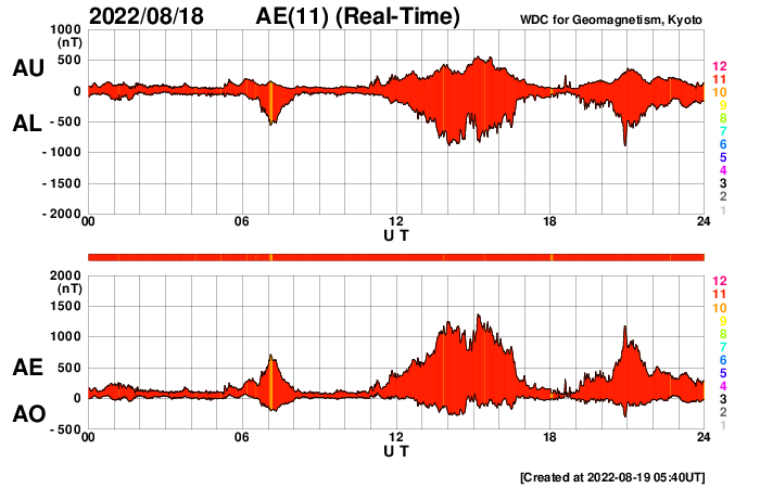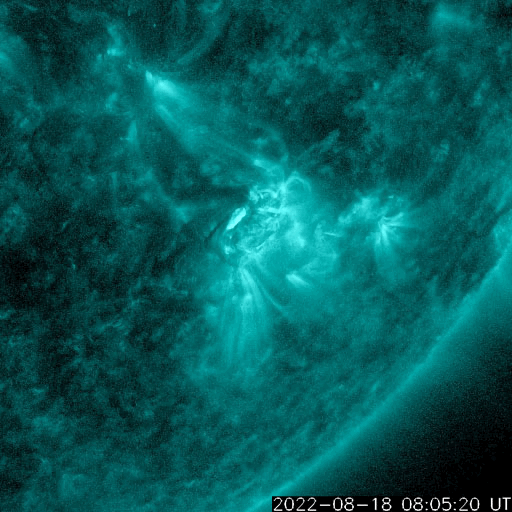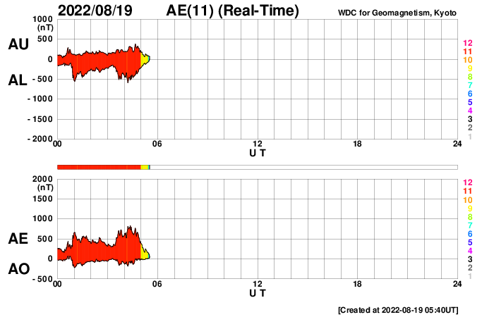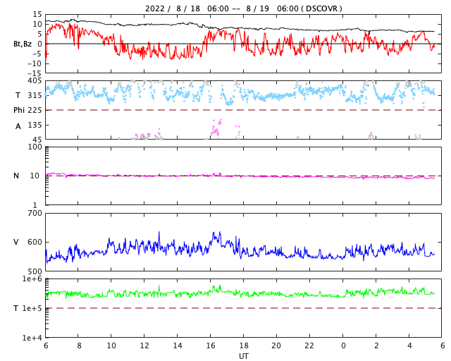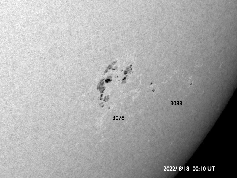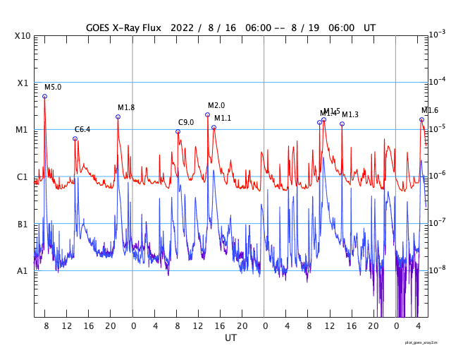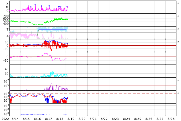 2022/ 8/19 14:49 更新 3078黒点群でMクラスの中規模フレアが4回発生しています。高速の太陽風が続いています。 担当 篠原 3078黒点群の活動が続いています。 昨夜は、18日19時(世界時18日10時)にM1.3、 18日19時半(世界時18日10時半)にM1.5、 18日23時(世界時18日14時)にM1.3と、 中規模フレアを3回起こし(1枚目の動画)、 先ほど、19日13時半(世界時19日4時半)にも、 3078群として11回目になる M1.6の中規模フレアを起こしています(5枚目の動画)。 その他にもCクラスの小規模フレアを繰り返し起こしていて、 X線グラフは頻繁に変化が発生しています。 昨夜のM1.5のフレアでは、コロナの噴出も発生しています。 2枚目のGOES衛星SUVI 304の動画で紹介します。 この動画では、直後に太陽の北西側(右上)からも 別の噴出が発生しています。 これらの噴出によるCME(コロナ質量放出)の様子を、 3枚目のSOHO衛星LASCO C2、C3の動画でご覧下さい。 これを見ると、あまり濃い噴出ではなかった様です。 地球に対しては斜め方向の噴出なので、 影響は到来しても小さいと思われます。 3078黒点群では、 今朝、19日7時半(世界時18日22時半)に C4.4の小規模フレアが発生したのですが、 この時もコロナの噴出が見られました。 4枚目のGOES衛星SUVI 304の動画で紹介します。 この噴出もCMEになっているでしょう。 6枚目にSDO衛星による3078黒点群の拡大写真を掲載します。 9日に太陽の南東の端(左下)に現れた3078群ですが、 10日経って南西の端に近付いて来ました。 黒点の見え方は昨日よりも小さくなっている様です。 フレアは続いていますが、この後はどの様に推移するのでしょうか。 引き続き注目してください。 太陽風は、550〜580km/秒の高速の風が続いています。 磁場強度は12nTから6nTへゆっくりと下がり、 平均的な値に戻っています。 磁場の南北成分は、昨夕以降南寄りに傾向が変わっています。 このため磁気圏の活動は強まっていて、 AE指数は1000nTを超える大規模な変化が発生し、 グラフの最後でも500〜800nTの中規模の変化が続いています。 SDO衛星AIA193の太陽コロナ写真では、 コロナホールは西側の南北に見えていて、 もう3〜4日程度は高速の風が続きそうです。