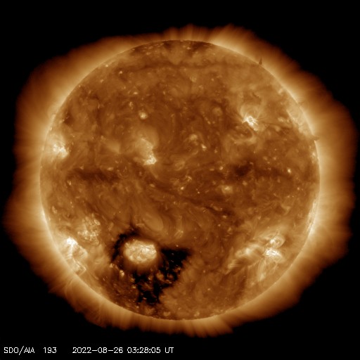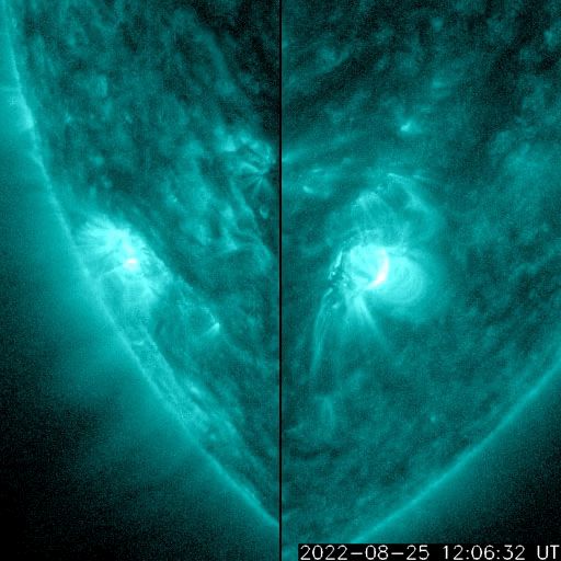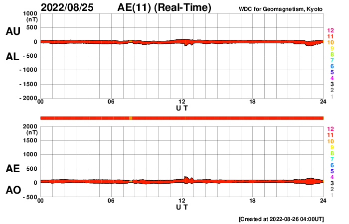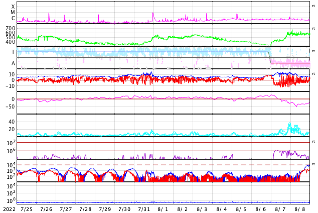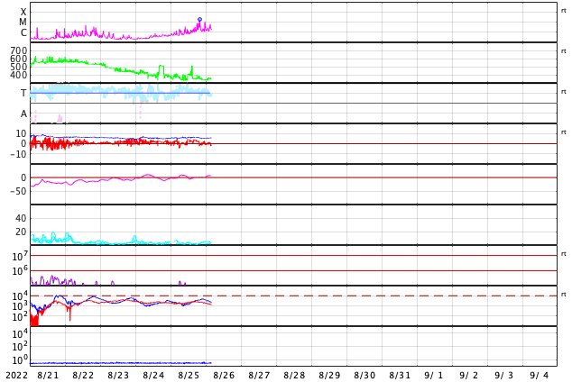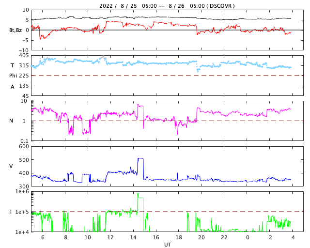 2022/ 8/26 13:07 更新 Mフレアが2回発生しています。太陽風は低速になっています。 担当 篠原 昨日の午後から太陽の南東(左下)の3089黒点群と、 南西(右下)の3088黒点群の活動が活発になり、 Cクラスの小規模フレアが頻繁に発生する様になりました。 X線グラフを見ると、全体の強度が上昇し、 フレアの細かいピークが多数発生する様になっています。 そして、今朝、26日4時半(世界時25日19時半)にM1.8、 続いて、26日8時半(世界時25日23時半)にM1.0と、 中規模フレアが2回発生しています。 SDO衛星AIA131によるフレア活動の動画を掲載します。 左側が3089群、右側が3088群の拡大写真ですが、 東西に離れた2つの領域が競っているかのように フレアの輝きが頻発しています。 NOAA/SWPCの記録では M1.8フレアは3088群、 M1.0フレアは3089群の発生となっています。 3088群は、黒点が大きな姿を保っています。 昨日からの変化を可視光写真の動画で紹介します。 この後も、3089群、3088群の活動に注目して下さい。 太陽風は、昨日のニュースの後に速度が350km/秒へ下がり、 低速の風に変わっています。 磁場強度は、5〜6nTと平均的な状態です。 磁場の南北成分は、0nT付近か弱い北寄りで、 速度が下がったこともあり、磁気圏は穏やかです。 AE指数は変化がない状態です。 SDO衛星AIA193では、 南半球のコロナホールが中心線を越えたところです。 2〜3日後くらいから、太陽風の速度は高まる可能性があります。