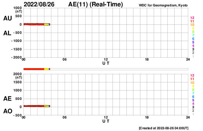 (c) SDO (NASA)、(動画加工 : 宇宙天気ニュース) ![]() 南西の3088黒点群の変化。SDO衛星。 (c) SDO (NASA)、作図:宇宙天気ニュース ![]() SDO衛星のAIA193カメラによる太陽コロナの様子 (c) SDO (NASA) ![]() SDO衛星による太陽の可視光写真。マウスの矢印を写真に重ねると、黒点番号付きの写真に切り替わります。 (c) SDO (NASA) ![]() GOES衛星の太陽X線強度。赤・橙 = 0.1〜0.8 nm、青・紫 = 0.05〜0.4 nm (c) データ:NOAA/SWPC、作図:宇宙天気ニュース ![]() DSCOVRが観測した太陽風の磁場(黒線は全体の強度、赤線は南北成分) 磁場の向き、プラズマの密度、速度、温度 (c) データ:NOAA/SWPC、作図:宇宙天気ニュース ![]() AE指数(速報値) 下段のAEグラフの値が高くなると、オーロラ活動が活発化しています。 (c) 京都大学WDC ![]() ![]() 27日の太陽周期に合わせた図 太陽が同じ面を地球に向けていた27日前の変化から、今後を予想することができます。 (c) 作図:宇宙天気ニュース