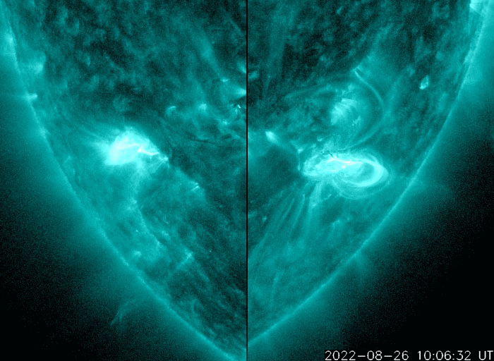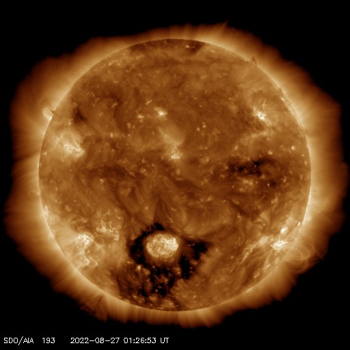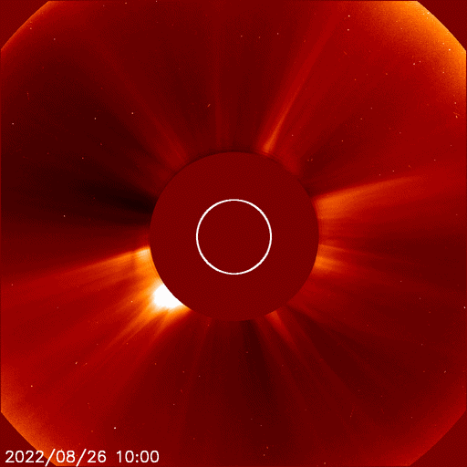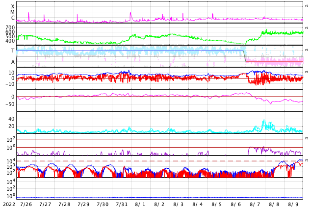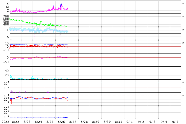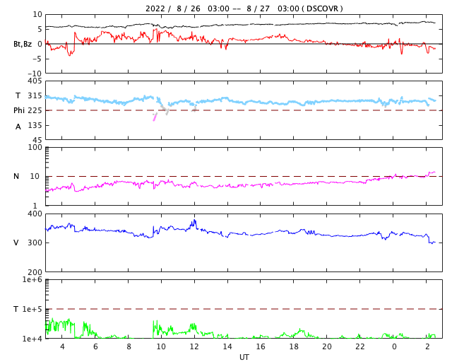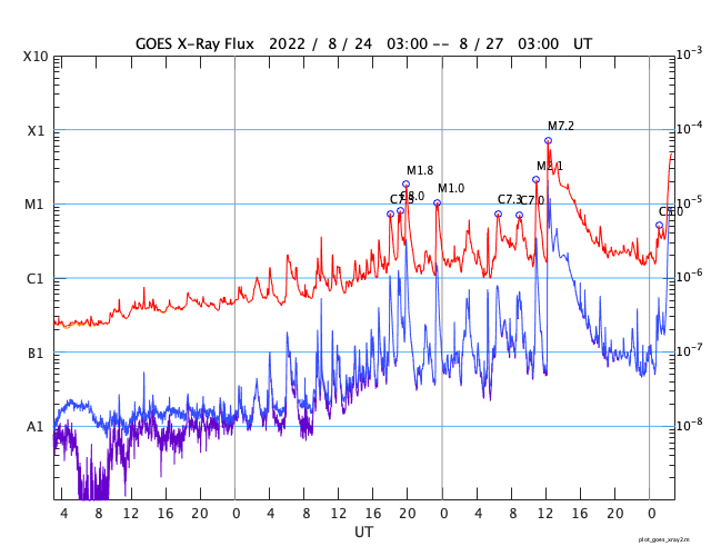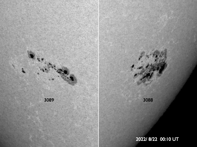 2022/ 8/27 11:46 更新 M7.2、M5.3などの中規模フレアが発生しました。太陽風は低速です。 担当 篠原 太陽の南東(左下)の3089黒点群と、 南西(右下)の3088黒点群の活動は続き、 昨夜、26日21時(世界時26日12時)に、 3089群でM7.2と大きめの中規模フレアが発生しました。 M7を超える規模のフレアの発生は、 5月10日のX1.5以来、3か月半ぶりです。 3089群では、その直前にM2.1、 直後にM5.3と中規模フレアが連続しています。 また、GOES衛星のX線グラフでは、 その後も、M3.6、M1.9などの変化が見えています。 2つの活動領域の様子を、SDO衛星AIA131の動画で紹介します。 M5.3までは左の3089群で輝きが発生していますが、 その後は右の3088群でフレアが発生しています。 この右側のフレアに伴ってCME(コロナ質量放出)が発生していて、 SOHO衛星LASCO C2、C3を見ると、 太陽の右側に向かってコロナのガスが勢い良く飛び出しています。 地球に対しては横向きに近い噴出で、 太陽風の乱れは、到来しても小規模の変化に留まりそうです。 一方、太陽の左に向かうCMEは見られず、 M7.2やM5.3によるフレアは発生していない様です。 3089群と3088群の拡大写真を掲載します。 3089群が昨日よりも大きくなっています。 この後も、2つの領域の活動に注目してください。 と、記事を書いていたところで、 南西の3088群でM4.8に達する中規模フレアが発生しました。 GOES衛星SUVI 131の動画を掲載します (フレアの発生途中での作成です)。 このフレアでもCMEが発生している可能性があります。 太陽風は、320〜330km/秒とより低速の風になっています。 磁場強度は、6nTから7nTへ少し上がっています。 磁場の南北成分は、 弱い北寄りの状態から、0nT付近で変化する様になっています。 磁気圏は穏やかで、AE指数は特に変化は見られません。 SDO衛星AIA193では、南半球のコロナホールは西側に進んでいます。 1〜2日後くらいから、この領域の影響が始まる可能性があります。 太陽風の磁場強度や速度の高まりに注目して下さい。 ![]() 3089群(南東)と3088群(南西)のフレアの様子。SDO衛星AIA131。 (c) SDO (NASA)、(動画加工 : 宇宙天気ニュース) ![]() 太陽の右側に噴出するCME。SOHO衛星LASCO C2、C3。 (c) SOHO (ESA & NASA)、 (動画加工 : 宇宙天気ニュース) ![]() 2つの黒点群の拡大写真。SDO衛星。 (c) SDO (NASA)、作図:宇宙天気ニュース ![]() 3088群で発生したM4.8の中規模フレア。GOES衛星SUVI 131。 (c) GOES (NOAA)、(動画加工 : 宇宙天気ニュース) ![]() SDO衛星のAIA193カメラによる太陽コロナの様子 (c) SDO (NASA) ![]() SDO衛星による太陽の可視光写真。マウスの矢印を写真に重ねると、黒点番号付きの写真に切り替わります。 (c) SDO (NASA) ![]() GOES衛星の太陽X線強度。赤・橙 = 0.1〜0.8 nm、青・紫 = 0.05〜0.4 nm (c) データ:NOAA/SWPC、作図:宇宙天気ニュース ![]() DSCOVRが観測した太陽風の磁場(黒線は全体の強度、赤線は南北成分) 磁場の向き、プラズマの密度、速度、温度 (c) データ:NOAA/SWPC、作図:宇宙天気ニュース ![]() AE指数(速報値) 下段のAEグラフの値が高くなると、オーロラ活動が活発化しています。 (c) 京都大学WDC ![]() ![]() 27日の太陽周期に合わせた図 太陽が同じ面を地球に向けていた27日前の変化から、今後を予想することができます。 (c) 作図:宇宙天気ニュース