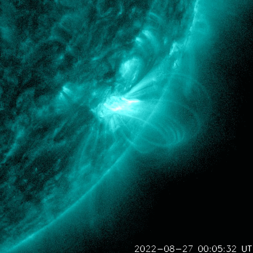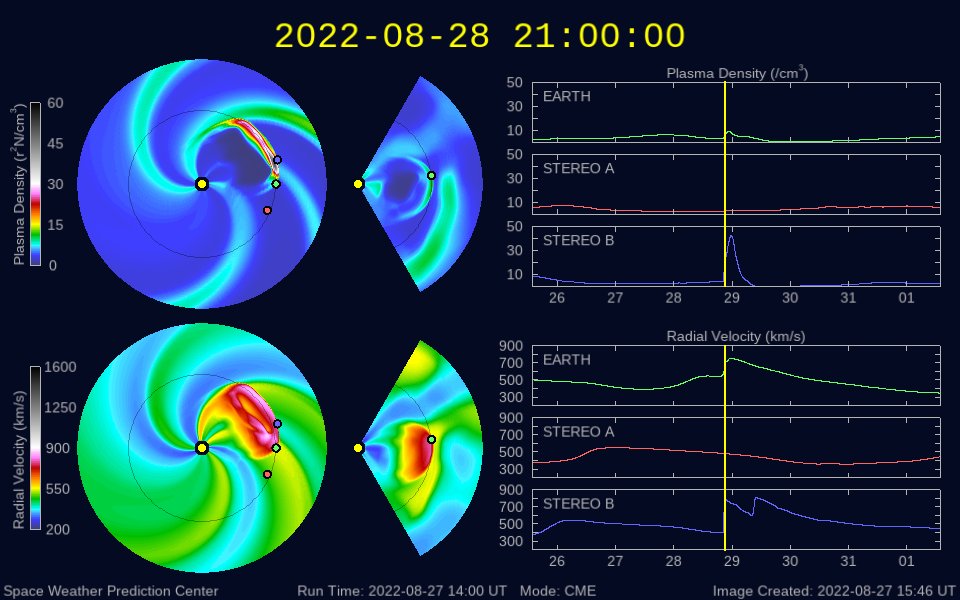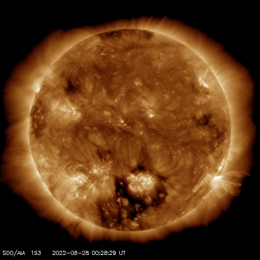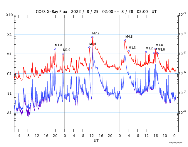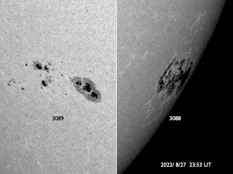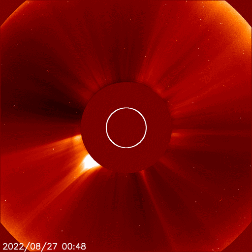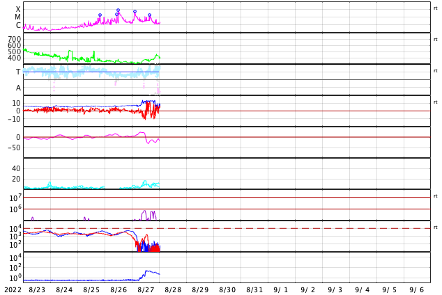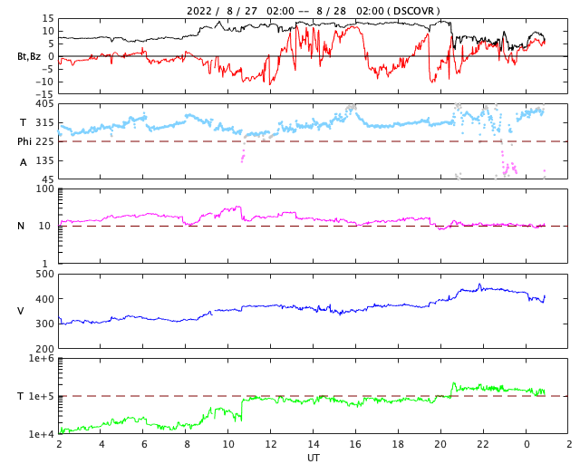 2022/ 8/28 10:06 更新 3088黒点群の活動が続いています。CMEによる太陽風の乱れが到来する可能性があります。 担当 篠原 昨日、27日11時(世界時27日2時)に3088黒点群で発生した M4.8の中規模フレアの様子を、 SDO衛星AIA131の動画で紹介します。 昨日のニュースでは初めの部分を紹介しただけでしたが、 フレアは長い時間輝きが続くタイプで、 GOES衛星のX線グラフでも 大きな山となって変化が現れています。 このフレアに伴って、 CME(コロナ質量放出)が発生しています。 SOHO衛星LASCO C2、C3の動画を掲載します。 青色のC3は途中の写真が欠けているので、 ガスの動きが見にくくなっています。 地球に対してかなり斜めの噴出ですが、 NOAA/SWPCの予報では(3枚目の図)、 飛び出したガスの端が、 明日の朝、29日6時(世界時28日21時)頃に 地球に到来するとのことです。 その場合、発生から2日程度でやって来ることになります。 太陽風は、コロナホールの影響で速度が高まる可能性があり、 その高速風に重なる様に乱れが到来するのでしょうか。 3088群は、この後も、 27日20時半(世界時27日11時半)にM1.2、 28日0時(世界時27日15時)にM1.1、 28日2時(世界時27日16時)にM1.8の中規模フレアと、 C9.6、C8.8などCクラスの小規模フレアを10回以上起こしています。 引き続き注目してください。 一方、可視光写真を見ると、 3088群は西の端に達していて、これから沈んで行きます。 もうひとつの3089群の活動は少なくなっているので、 太陽は静かになるかもしれません。 太陽風は、昨日の夕方に磁場強度が7nTから12nTへ強まり、 速度も、310km/秒と低速の状態から、 360km/秒、そして430km/秒と次第に高まっています。 現在は、磁場強度は5〜8nTで変化し、 速度は400km/秒と平均的な状態です。 SDO衛星AIA193で南半球に見えている コロナホールの影響が始まったのでしょうか。 この後、さらに速度が高まって行くか注目して下さい。 磁場の南北成分は、磁場が強まったこともあり、 大きく南北に変化する様になりました。 このため磁気圏の活動も強まって、 AE指数は800nTの中規模の変化が発生しています。 太陽風のグラフの最後では、磁場は北向きになっています。 この傾向が続くと、磁気圏は穏やかになりますが、 どうなるでしょうか。 ![]() 27日11時(世界時27日2時)に発生したM4.8フレア。SDO衛星AIA131。 (c) SDO (NASA)、(動画加工 : 宇宙天気ニュース) ![]() M4.8フレアの伴って発生したCME。SOHO衛星LASCO C2、C3。 (c) SOHO (ESA & NASA)、 (動画加工 : 宇宙天気ニュース) ![]() CMEによる太陽風の乱れは29日6時(世界時28日21時)頃に到来する可能性があります。 (c) NOAA/SWPC ![]() 3089、3088黒点群の拡大写真。SDO衛星。 (c) SDO (NASA)、作図:宇宙天気ニュース ![]() SDO衛星のAIA193カメラによる太陽コロナの様子 (c) SDO (NASA) ![]() SDO衛星による太陽の可視光写真。マウスの矢印を写真に重ねると、黒点番号付きの写真に切り替わります。 (c) SDO (NASA) ![]() GOES衛星の太陽X線強度。赤・橙 = 0.1〜0.8 nm、青・紫 = 0.05〜0.4 nm (c) データ:NOAA/SWPC、作図:宇宙天気ニュース ![]() DSCOVRが観測した太陽風の磁場(黒線は全体の強度、赤線は南北成分) 磁場の向き、プラズマの密度、速度、温度 (c) データ:NOAA/SWPC、作図:宇宙天気ニュース ![]() AE指数(速報値) 下段のAEグラフの値が高くなると、オーロラ活動が活発化しています。 (c) 京都大学WDC ![]() ![]() 27日の太陽周期に合わせた図 太陽が同じ面を地球に向けていた27日前の変化から、今後を予想することができます。 (c) 作図:宇宙天気ニュース