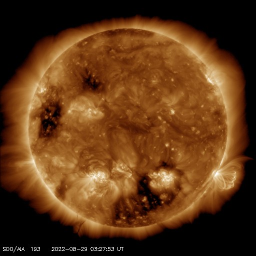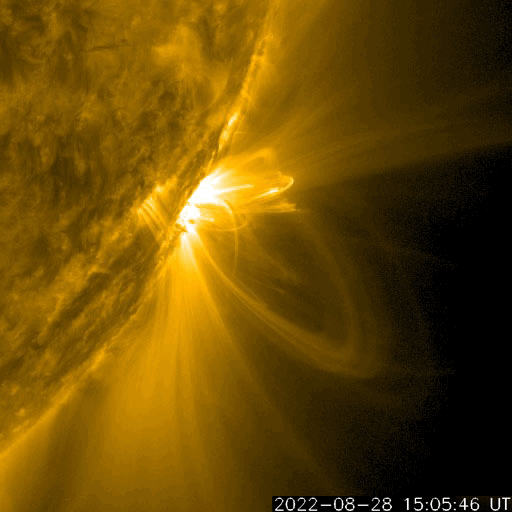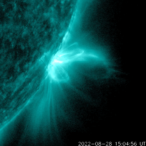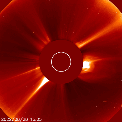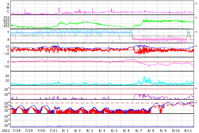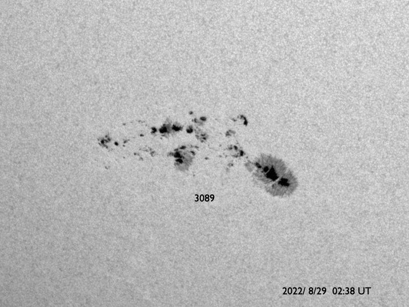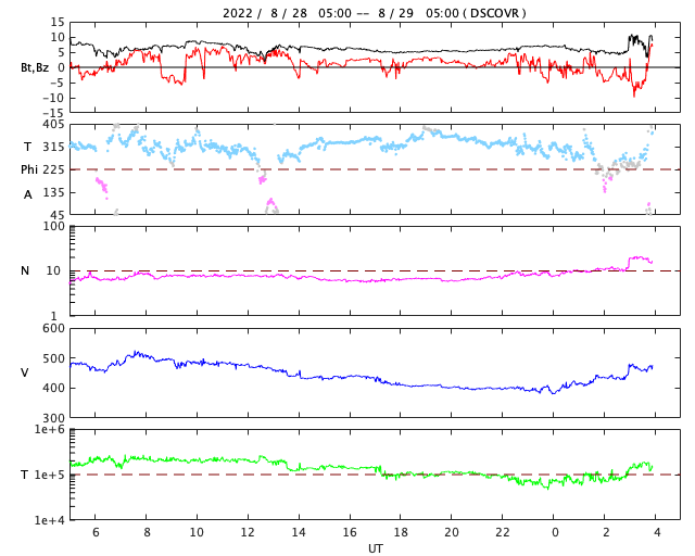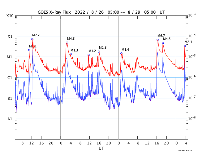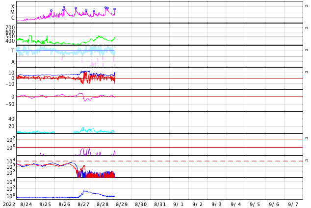 2022/ 8/29 13:04 更新 M6.7、M4.6の中規模フレアが発生しました。CMEの乱れも到来しています。 担当 篠原 今日未明、29日1時(世界時28日16時)に、 太陽の南西の端近く(右下)の3088黒点群で、 M6.7の中規模フレアが発生しました。 3088群が起こしたフレアでは、最大の規模です。 3088群は、直後の29日3時半(世界時28日18時半)にも、 M4.6の中規模フレアを起こしています。 SDO衛星AIA131の動画を掲載します。 明るい部分が上に向かって噴き上がるような、 激しい活動が発生しています。 また、SDO衛星AIA171の動画を2枚目に掲載しています。 こちらでは、ポストフレアループが きれいに輝く様子を見ることができます。 このフレアに伴って、CME(コロナ質量放出)が発生しています。 SOHO衛星LASCO C2、C3の動画では、 コロナのガスが太陽の右に向かって勢い良く飛び出しています。 直前に別の現象によるCMEが飛び出し始めていたのですが、 それを吹き飛ばす様に噴出しています。 太陽からほぼ横向きに噴き出しているので、 地球への影響はなさそうです。 3088群は、現在はほぼ見えなくなっています。 このため、太陽の活動は穏やかになりそうです。 その一方、南東(左下)の3089群は黒点が大きくなっています。 目立ったフレアの発生はなくなっているのですが、 この後はどの様に推移するでしょうか。 と書いている所で、 西に沈んだ3088群でM3.3の中規模フレアが発生しました。 X線グラフの最後にピークが現れています。 沈んだ領域のフレアなので、 本当の規模はこれよりも大きかった可能性があります。 太陽風は、注目していた27日のCMEによる太陽風の乱れが、 29日12時(世界時29日3時)に、DSCOVR衛星で観測された様です。 太陽風の速度は、昨日のニュースの後に500lkm/秒へ高まりましたが、 その後、今朝にかけて400km/秒へ下がっていました。 ここから急に470km/秒へ高まる小幅の変化が発生しています。 磁場強度も、今日に入る頃から5nTと平均的な値で安定していましたが、 グラフの最後で10nTに急に強まっています。 磁場の南北成分は、南向きに変化しています。 しかし、-5nT程度とそれほど大きくなく、 速度もあまり高まっていないので、 この状態であれば、磁気圏の活動はやや強まる程度でしょう。 太陽風のグラフの最後では、 速度も磁場強度も一旦下がって、再び上がる変化が発生しています。 引き続き、太陽風の変化に注目してください。