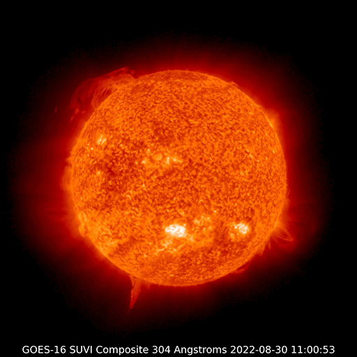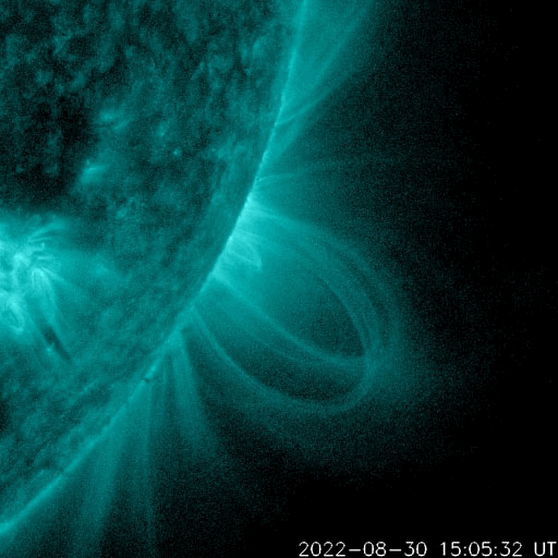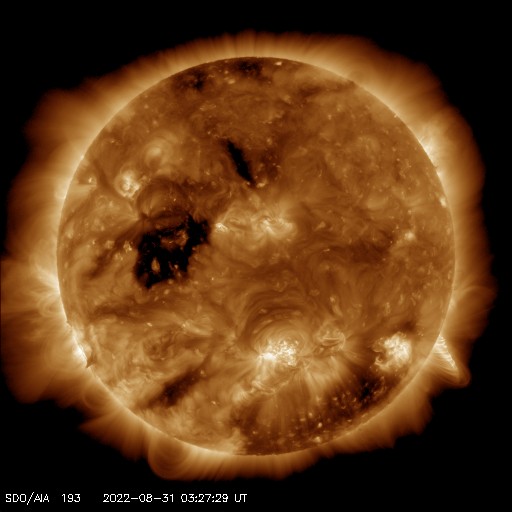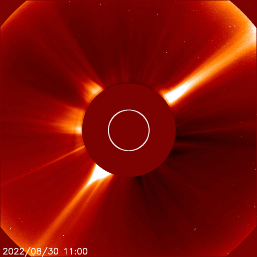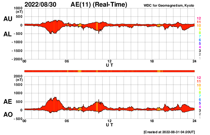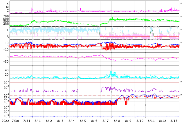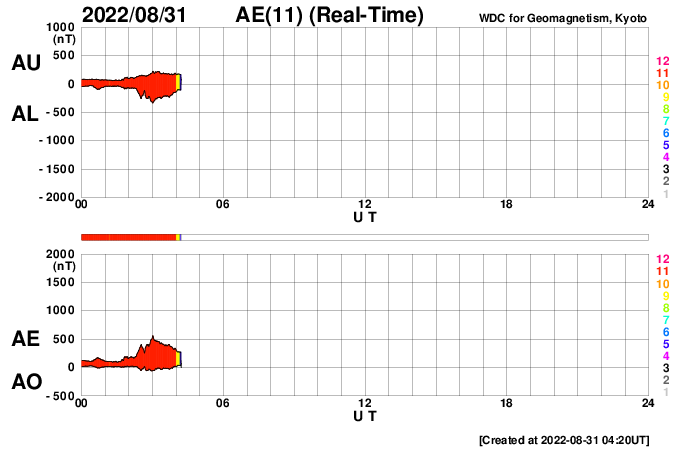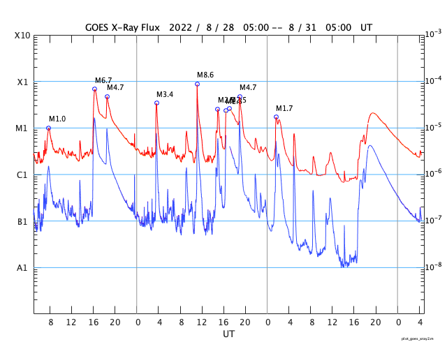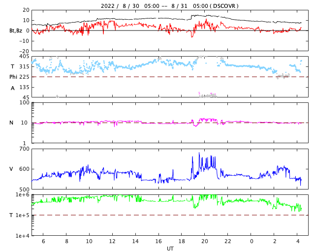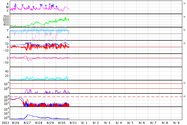 2022/ 8/31 13:34 更新 3088群でM2.1の中規模フレアが発生しました。太陽風はより高速になっています。 担当 篠原 太陽の南西の端に沈んで行った3088黒点群の活動が続き、 太陽の端を超えた部分を地球から見ることができています。 中でも、今日未明、31日2時(世界時30日17時)頃から始まった活動では、 初めにC5.4、C7.2と小規模フレアのX線強度の強まりが観測され、 そこから更にM2.1と中規模フレアに高まる変化が発生しました。 SDO衛星AIA131の動画を掲載します。 初めに2つの短時間の輝きが起き、 そこから領域全体が輝くような変化が発生しています。 3088群は、29日の昼頃に完全に見えなくなったので、 それから1日半分、太陽の向こう側へ進んでいます。 その状況で太陽の端から顔を出した領域だけで M2.1のX線強度が観測されたのです。 実際の規模はどのくらいだったのでしょうか。 このフレアに伴って、CME(コロナ質量放出)が発生しています。 SOHO衛星LASCO C2、C3の動画を掲載しますが、 この動画では、初めに右上、続いて左下にCMEが飛び出し、 それらを追いかける様に、右方向、 そして、青い写真のC3を見ると、 太陽全体を丸く囲むように広がるハロー型のCMEも発生しています。 初めの2つは、プロミネンス噴出によるもので、 次のGOES衛星SUVI 304の動画を見て下さい。 太陽の右上と左下でそれぞれ噴出が起きています。 これに続くCMEが3088群のフレアに関係するものですが、 3088群がある右横に噴き出すだけでなく、 太陽の反対方向に向かって噴き出す時に見られる ハロー型のCMEが発生している点が興味深いです。 3088群から向こう斜め方向に飛び出したのか、 3088群のさらに向こう側の領域で活動が発生したのでしょうか。 今後は、フレアはもう見えなくなりそうですが、 CMEによって活動の様子を探ることはできます。 引き続き注目してください。 太陽のこちら側は、3089黒点群が大きな姿を保っています。 しかし、フレアの発生は少なく、穏やかな状態です。 太陽風は、速度が550〜600km/秒と、 昨日よりも高まった状態になっています。 磁場強度は、5nTから12nTに強まり、 途中、15nTへの急な変化が発生しますが、 以降は次第に下がって、 現在は7nTと平均的な状態に戻りかけています。 SDO衛星AIA193の南西側(右下)に達している コロナホールの影響が強まっている様です。 しかし、今後は影響が弱まって、 次は東側(左)のコロナホールの影響が、 4〜5日後くらいからやって来るのではないでしょうか。 太陽風磁場の南北成分は、 北寄りの傾向になっていますが、時々弱い南向きになり、 AE指数で小規模の変化が発生しています。