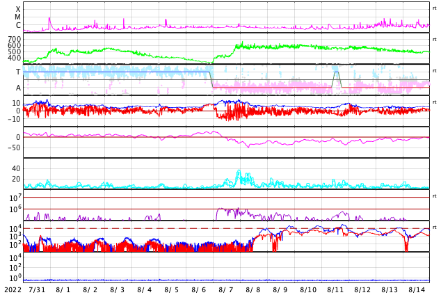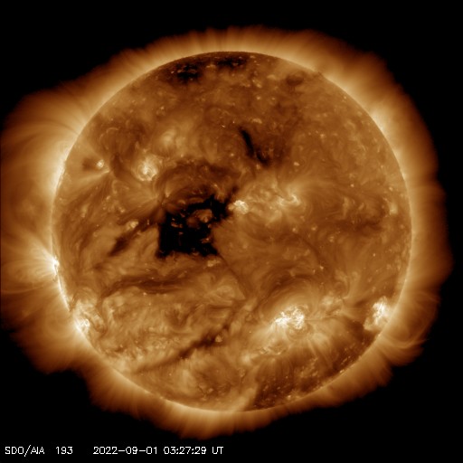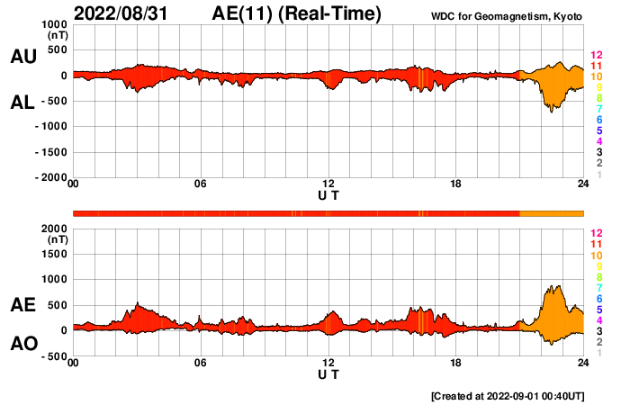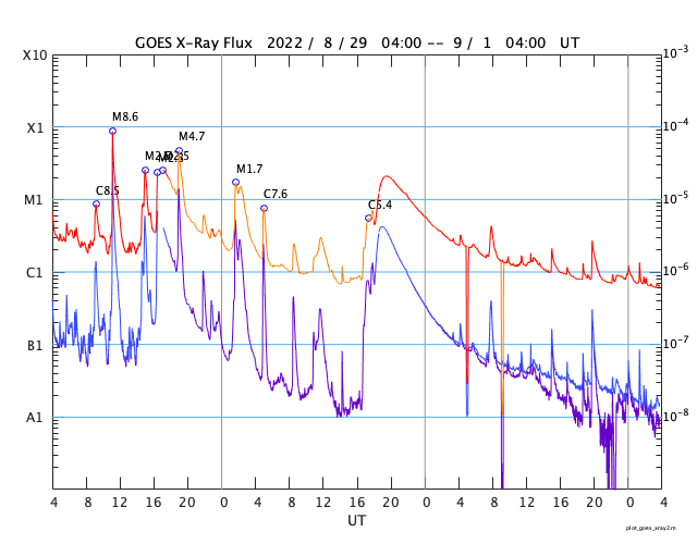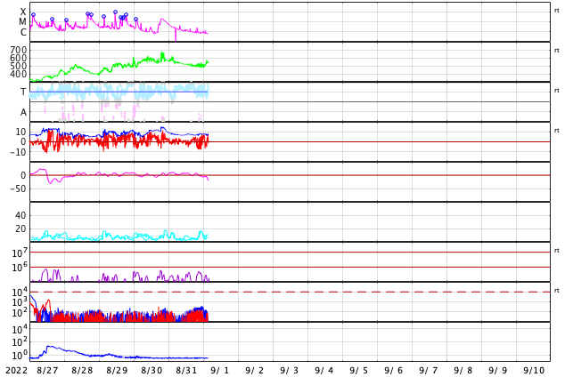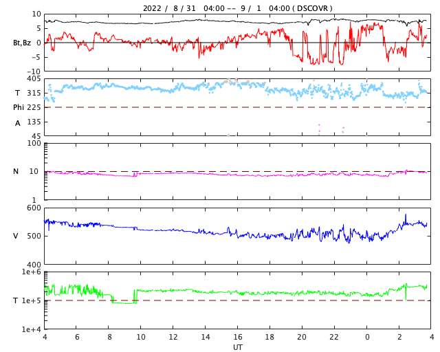 2022/ 9/ 1 12:56 更新 太陽は穏やかになっています。高速の太陽風が続いています。 担当 篠原 3088黒点群が見えなくなり、 太陽は、南西(右下)の3089黒点群が目立つだけになっています。 この領域では、昨日の午後からフレアが発生するようになり、 31日16時半(世界時31日7時半)のC4.3の小規模フレアや、 C1〜2の小さい小規模フレアが数回発生しています。 活動が強まる様子はありませんが、この後どうなるでしょうか。 SOHO衛星LASCO C2では、 CME(コロナ質量放出)の噴出は特にありません。 太陽の向こう側に進んだ3088群は、 現在は落ち着いているのでしょうか。 太陽風は高速の状態が続いています。 速度は、550km/秒から500km/秒へゆっくりと下がり、 今朝から再び540km/秒へ高まる変化が発生しています。 磁場強度は、7nT前後で推移しています。 磁場の南北成分は、 グラフの後半で南向きの変化が見られ、 AE指数では800nTの中規模の変化になっています。 太陽風の速度が高まっているので、 磁場の振れ方によって磁気圏の活動は強まりやすい状態です。 SDO衛星AIA193では、コロナホールが太陽の中心線に達しています。 3日後くらいからこの領域の影響が始まりそうです。 現在の高速風がどこまで続くかですが、 この後下がっても、すぐに高まることになりそうです。 ![]() SDO衛星のAIA193カメラによる太陽コロナの様子 (c) SDO (NASA) ![]() SDO衛星による太陽の可視光写真。マウスの矢印を写真に重ねると、黒点番号付きの写真に切り替わります。 (c) SDO (NASA) ![]() GOES衛星の太陽X線強度。赤・橙 = 0.1〜0.8 nm、青・紫 = 0.05〜0.4 nm (c) データ:NOAA/SWPC、作図:宇宙天気ニュース ![]() DSCOVRが観測した太陽風の磁場(黒線は全体の強度、赤線は南北成分) 磁場の向き、プラズマの密度、速度、温度 (c) データ:NOAA/SWPC、作図:宇宙天気ニュース ![]() AE指数(速報値) 下段のAEグラフの値が高くなると、オーロラ活動が活発化しています。 (c) 京都大学WDC ![]() ![]() 27日の太陽周期に合わせた図 太陽が同じ面を地球に向けていた27日前の変化から、今後を予想することができます。 (c) 作図:宇宙天気ニュース