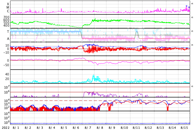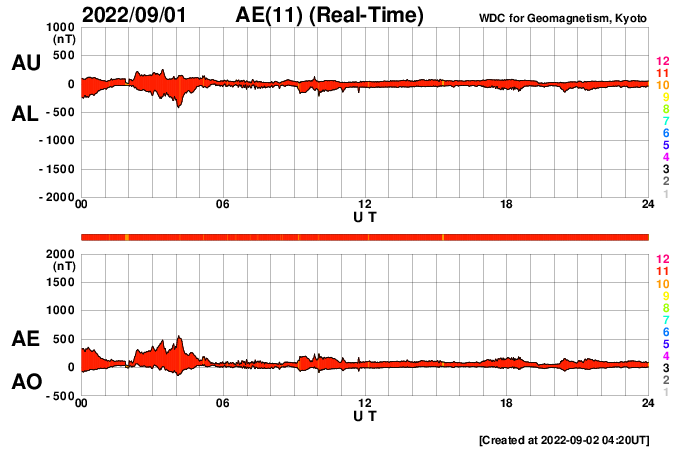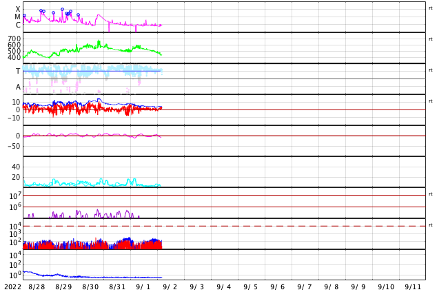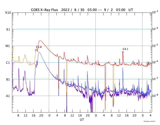 GOES衛星の太陽X線強度。赤・橙 = 0.1〜0.8 nm、青・紫 = 0.05〜0.4 nm (c) データ:NOAA/SWPC、作図:宇宙天気ニュース ![]() | ||||||||||||||||||||||||||||||||||||||||||||||||||||||||||||||||||||||||||||||||||||||||||||||||||||||||||||||||||||||||||||||||||||||||||||||||||||||||||||||||||||||||||||||||||||||||||||||||||||||||||||||||||||||||||||||||||||||||||||