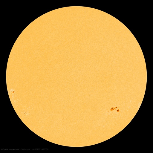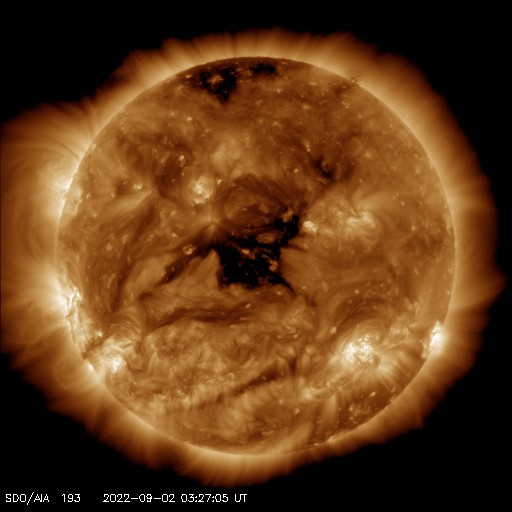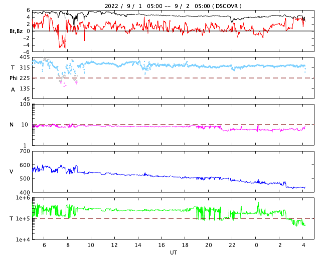 2022/ 9/ 2 13:25 更新 太陽風は平均的な速度に下がりました。磁気圏は穏やかです。 担当 篠原 太陽風の速度は、昨日の午後以降ゆっくりと低下して、 現在は430km/秒と平均的な速度に戻っています。 磁場強度も4nTと平均的な状態です。 磁場の南北成分は、弱い北寄りになっています。 磁気圏は穏やかで、AE指数はほとんど変化のない状態です。 SDO衛星AIA193の太陽コロナ写真では、 ちょうど太陽の中心に、 薄暗いコロナホールの広がりが見えていて、 地球に向かって速度の高い太陽風を吹きつけているところです。 明後日くらいから、この領域の影響で速度が高まりそうです。 27日周期の図を見ると、 前周期は、世界時の8月7日の後半から速度が高まっています。 今回はどのくらいから速度が高まるでしょうか。 太陽は、C1〜4の小規模フレアが数回発生しています。 最大は、東端の3092黒点群で発生したC4.1です。 また、北東の端(左上)の向こう側にも活動的な領域がある様です。 SOHO衛星では、CME(コロナ質量放出)は特に見られず、 太陽の向こう側の3088群は、穏やかになったのかもしれません。 ![]() SDO衛星のAIA193カメラによる太陽コロナの様子 (c) SDO (NASA) ![]() SDO衛星による太陽の可視光写真。マウスの矢印を写真に重ねると、黒点番号付きの写真に切り替わります。 (c) SDO (NASA) ![]() DSCOVRが観測した太陽風の磁場(黒線は全体の強度、赤線は南北成分) 磁場の向き、プラズマの密度、速度、温度 (c) データ:NOAA/SWPC、作図:宇宙天気ニュース ![]() AE指数(速報値) 下段のAEグラフの値が高くなると、オーロラ活動が活発化しています。 (c) 京都大学WDC ![]() ![]() 27日の太陽周期に合わせた図 太陽が同じ面を地球に向けていた27日前の変化から、今後を予想することができます。 (c) 作図:宇宙天気ニュース