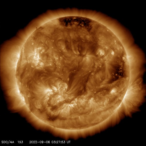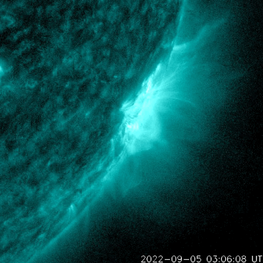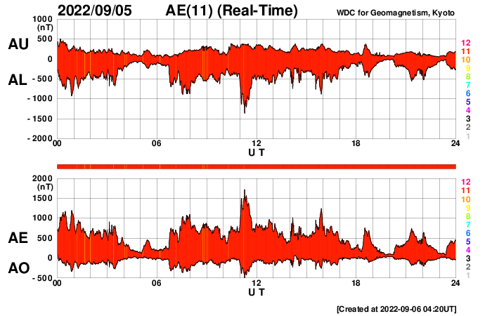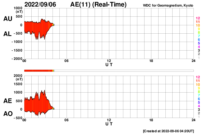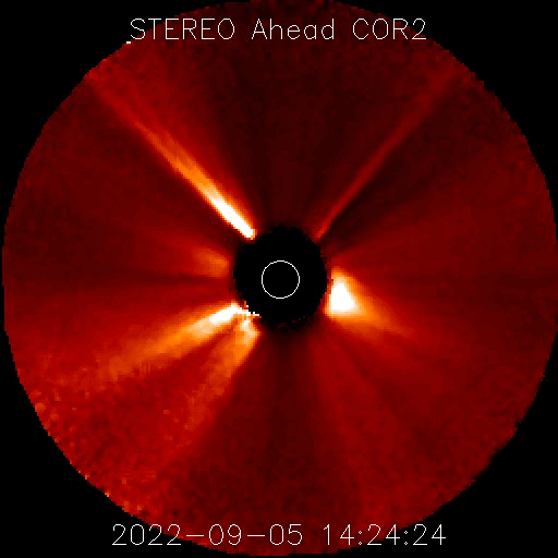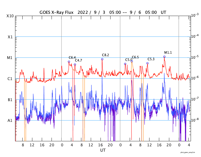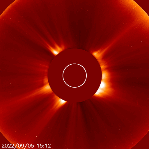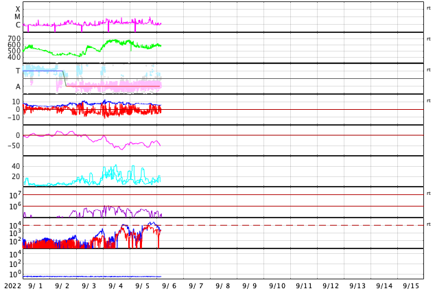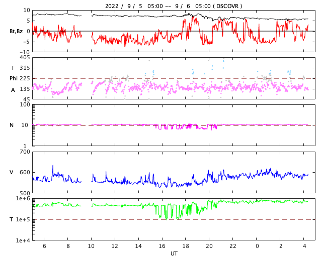 2022/ 9/ 6 13:31 更新 太陽の反対側でCMEが発生しました。高速の太陽風が続き、磁気圏も活動的です。 担当 篠原 今日未明、6日1時(世界時5日16時)頃に、 太陽の反対側である程度規模の大きいフレアが発生した様で、 太陽を丸く囲むように広がる フルハロー型のCME(コロナ質量放出)が発生しています。 SOHO衛星LASCO C2、C3と、 SEREO Ahead衛星COR2の動画を掲載します。 SOHO衛星の画像は欠測があって、 C2では噴出直後まで、 C3はある程度広がった後の様子しか分かりません。 一方、STEREO Ahead衛星では、 太陽から大きく広がっていく様子がよく分かります。 C2のガスの広がり方を見ると、 爆発は太陽のほぼ真反対の南寄りで発生した様に思います。 8月下旬に活発な活動を起こした3088黒点群が 太陽の向こう側に回って1週間と、真反対に達した頃なので、 3088群で発生した現象かもしれません。 太陽のこちら側では、 南西の端近く(右下)の3089黒点群の活動が続いています。 昨日のニュース以降も、 C6.5、C4.0、C5.3などの小規模フレアをいくつも起こし、 6日3時(世界時5日18時)にM1.0の中規模フレアが発生しています。 活動の様子をSDO衛星AIA131の動画で紹介します。 3089群は西の端を通り過ぎかけていて、 もうすぐ完全に見えなくなります。 一方、太陽のあちこちで新しい黒点が現れています。 この後、どの様に変化していくでしょうか。 太陽風は、昨夜にかけて550km/秒へ速度が下がりましたが、 今日に入ると再び高まり、現在は590km/秒付近で推移しています。 磁場強度は、8nTから6nTへやや下がっています。 SDO衛星AIA193では、 コロナホールはだいぶ西に進んでいます。 この後、速度は下がって行くのか、 あるいは、27日周期の図の前周期の様に しばらく高速の風が続くのか、 どの様に推移するでしょうか。 注目してください。 太陽風磁場の南北成分は、南寄りの傾向が続いています。 磁気圏の活動は活発な状態が続き、 AE指数は500〜1000nTの中規模の変化が続き、 最大では1500nTの変化も発生しています。 極域ではきれいなオーロラが現れているのではないでしょうか。 放射線帯の高エネルギー電子は、更に増加しています。 青線のGOES17に続いて、 赤線のGOES16も1万に達しそうです。 ![]() 太陽の反対側で発生したCME。SOHO衛星LASCO C2、C3。 (c) SOHO (ESA & NASA)、 (動画加工 : 宇宙天気ニュース) ![]() STEREO Ahead衛星COR2によるCMEの様子。 (c) STEREO (NASA)、(動画加工 : 宇宙天気ニュース) ![]() 3089黒点群のフレアの様子。SDO衛星AIA131。 (c) SDO (NASA)、(動画加工 : 宇宙天気ニュース) ![]() SDO衛星のAIA193カメラによる太陽コロナの様子 (c) SDO (NASA) ![]() SDO衛星による太陽の可視光写真。マウスの矢印を写真に重ねると、黒点番号付きの写真に切り替わります。 (c) SDO (NASA) ![]() GOES衛星の太陽X線強度。赤・橙 = 0.1〜0.8 nm、青・紫 = 0.05〜0.4 nm (c) データ:NOAA/SWPC、作図:宇宙天気ニュース ![]() DSCOVRが観測した太陽風の磁場(黒線は全体の強度、赤線は南北成分) 磁場の向き、プラズマの密度、速度、温度 (c) データ:NOAA/SWPC、作図:宇宙天気ニュース ![]() AE指数(速報値) 下段のAEグラフの値が高くなると、オーロラ活動が活発化しています。 (c) 京都大学WDC ![]() ![]() 27日の太陽周期に合わせた図 太陽が同じ面を地球に向けていた27日前の変化から、今後を予想することができます。 (c) 作図:宇宙天気ニュース